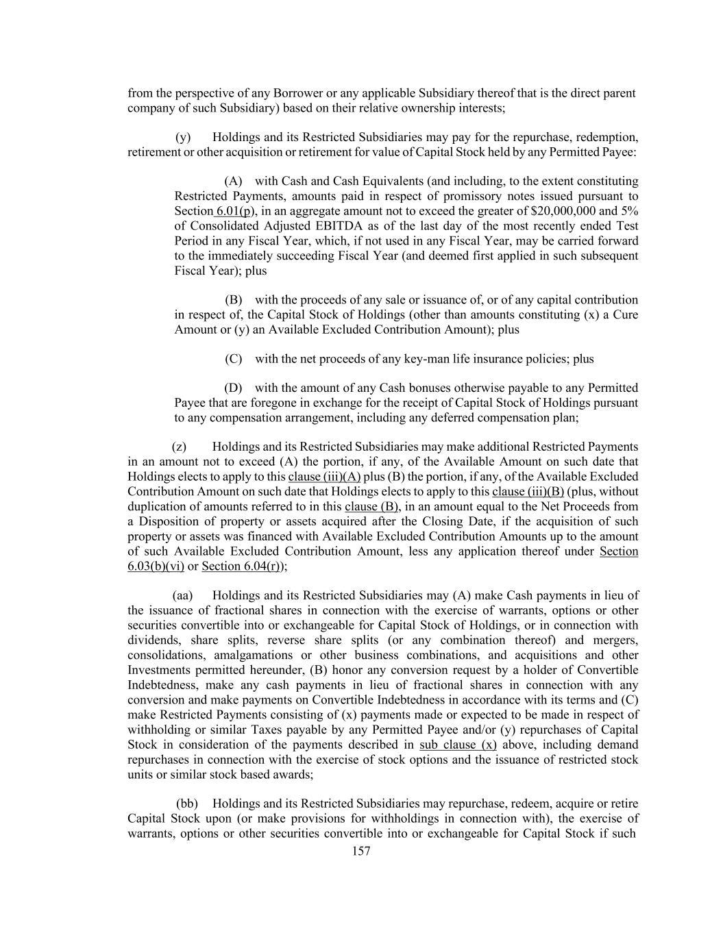 157 from the perspective of any Borrower or any applicable Subsidiary thereof that is the direct parent company of such Subsidiary) based on their relative ownership interests; (y) Holdings and its Restricted Subsidiaries may pay for the repurchase, redemption, retirement or other acquisition or retirement for value of Capital Stock held by any Permitted Payee: (A) with Cash and Cash Equivalents (and including, to the extent constituting Restricted Payments, amounts paid in respect of promissory notes issued pursuant to Section 6.01(p), in an aggregate amount not to exceed the greater of $20,000,000 and 5% of Consolidated Adjusted EBITDA as of the last day of the most recently ended Test Period in any Fiscal Year, which, if not used in any Fiscal Year, may be carried forward to the immediately succeeding Fiscal Year (and deemed first applied in such subsequent Fiscal Year); plus (B) with the proceeds of any sale or issuance of, or of any capital contribution in respect of, the Capital Stock of Holdings (other than amounts constituting (x) a Cure Amount or (y) an Available Excluded Contribution Amount); plus (C) with the net proceeds of any key-man life insurance policies; plus (D) with the amount of any Cash bonuses otherwise payable to any Permitted Payee that are foregone in exchange for the receipt of Capital Stock of Holdings pursuant to any compensation arrangement, including any deferred compensation plan; (z) Holdings and its Restricted Subsidiaries may make additional Restricted Payments in an amount not to exceed (A) the portion, if any, of the Available Amount on such date that Holdings elects to apply to this clause (iii)(A) plus (B) the portion, if any, of the Available Excluded Contribution Amount on such date that Holdings elects to apply to this clause (iii)(B) (plus, without duplication of amounts referred to in this clause (B), in an amount equal to the Net Proceeds from a Disposition of property or assets acquired after the Closing Date, if the acquisition of such property or assets was financed with Available Excluded Contribution Amounts up to the amount of such Available Excluded Contribution Amount, less any application thereof under Section 6.03(b)(vi) or Section 6.04(r)); (aa) Holdings and its Restricted Subsidiaries may (A) make Cash payments in lieu of the issuance of fractional shares in connection with the exercise of warrants, options or other securities convertible into or exchangeable for Capital Stock of Holdings, or in connection with dividends, share splits, reverse share splits (or any combination thereof) and mergers, consolidations, amalgamations or other business combinations, and acquisitions and other Investments permitted hereunder, (B) honor any conversion request by a holder of Convertible Indebtedness, make any cash payments in lieu of fractional shares in connection with any conversion and make payments on Convertible Indebtedness in accordance with its terms and (C) make Restricted Payments consisting of (x) payments made or expected to be made in respect of withholding or similar Taxes payable by any Permitted Payee and/or (y) repurchases of Capital Stock in consideration of the payments described in sub clause (x) above, including demand repurchases in connection with the exercise of stock options and the issuance of restricted stock units or similar stock based awards; (bb) Holdings and its Restricted Subsidiaries may repurchase, redeem, acquire or retire Capital Stock upon (or make provisions for withholdings in connection with), the exercise of warrants, options or other securities convertible into or exchangeable for Capital Stock if such
