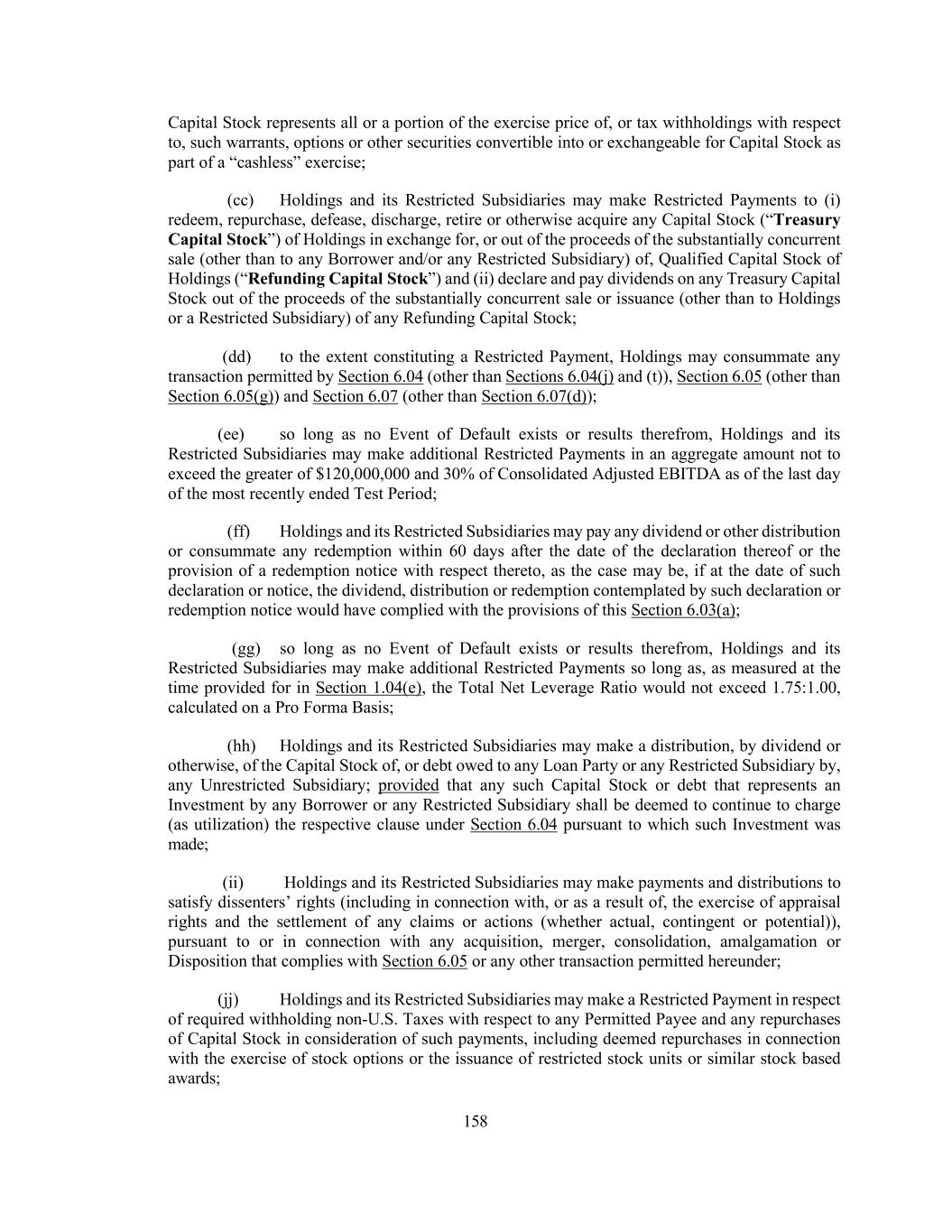 158 Capital Stock represents all or a portion of the exercise price of, or tax withholdings with respect to, such warrants, options or other securities convertible into or exchangeable for Capital Stock as part of a “cashless” exercise; (cc) Holdings and its Restricted Subsidiaries may make Restricted Payments to (i) redeem, repurchase, defease, discharge, retire or otherwise acquire any Capital Stock (“Treasury Capital Stock”) of Holdings in exchange for, or out of the proceeds of the substantially concurrent sale (other than to any Borrower and/or any Restricted Subsidiary) of, Qualified Capital Stock of Holdings (“Refunding Capital Stock”) and (ii) declare and pay dividends on any Treasury Capital Stock out of the proceeds of the substantially concurrent sale or issuance (other than to Holdings or a Restricted Subsidiary) of any Refunding Capital Stock; (dd) to the extent constituting a Restricted Payment, Holdings may consummate any transaction permitted by Section 6.04 (other than Sections 6.04(j) and (t)), Section 6.05 (other than Section 6.05(g)) and Section 6.07 (other than Section 6.07(d)); (ee) so long as no Event of Default exists or results therefrom, Holdings and its Restricted Subsidiaries may make additional Restricted Payments in an aggregate amount not to exceed the greater of $120,000,000 and 30% of Consolidated Adjusted EBITDA as of the last day of the most recently ended Test Period; (ff) Holdings and its Restricted Subsidiaries may pay any dividend or other distribution or consummate any redemption within 60 days after the date of the declaration thereof or the provision of a redemption notice with respect thereto, as the case may be, if at the date of such declaration or notice, the dividend, distribution or redemption contemplated by such declaration or redemption notice would have complied with the provisions of this Section 6.03(a); (gg) so long as no Event of Default exists or results therefrom, Holdings and its Restricted Subsidiaries may make additional Restricted Payments so long as, as measured at the time provided for in Section 1.04(e), the Total Net Leverage Ratio would not exceed 1.75:1.00, calculated on a Pro Forma Basis; (hh) Holdings and its Restricted Subsidiaries may make a distribution, by dividend or otherwise, of the Capital Stock of, or debt owed to any Loan Party or any Restricted Subsidiary by, any Unrestricted Subsidiary; provided that any such Capital Stock or debt that represents an Investment by any Borrower or any Restricted Subsidiary shall be deemed to continue to charge (as utilization) the respective clause under Section 6.04 pursuant to which such Investment was made; (ii) Holdings and its Restricted Subsidiaries may make payments and distributions to satisfy dissenters’ rights (including in connection with, or as a result of, the exercise of appraisal rights and the settlement of any claims or actions (whether actual, contingent or potential)), pursuant to or in connection with any acquisition, merger, consolidation, amalgamation or Disposition that complies with Section 6.05 or any other transaction permitted hereunder; (jj) Holdings and its Restricted Subsidiaries may make a Restricted Payment in respect of required withholding non-U.S. Taxes with respect to any Permitted Payee and any repurchases of Capital Stock in consideration of such payments, including deemed repurchases in connection with the exercise of stock options or the issuance of restricted stock units or similar stock based awards;