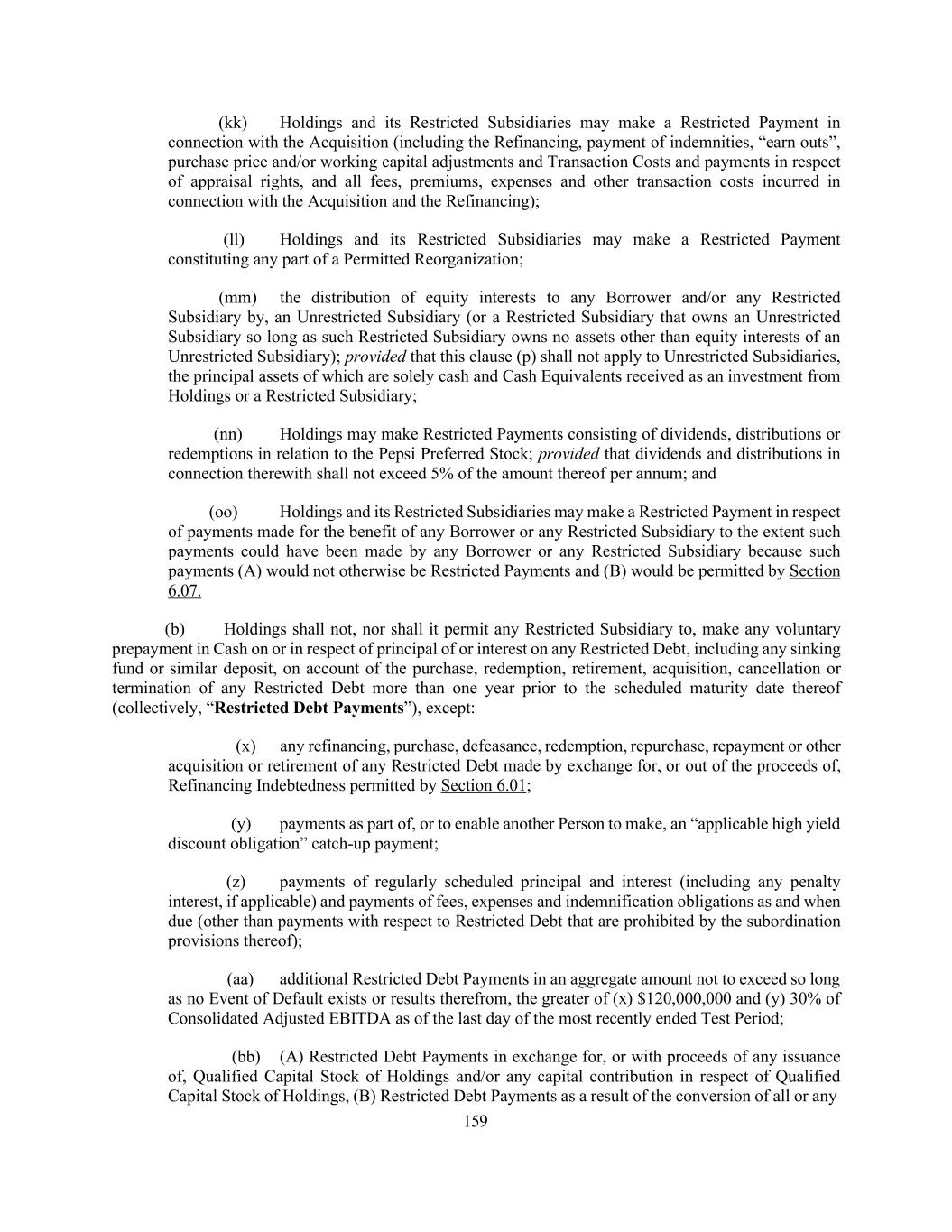 159 (kk) Holdings and its Restricted Subsidiaries may make a Restricted Payment in connection with the Acquisition (including the Refinancing, payment of indemnities, “earn outs”, purchase price and/or working capital adjustments and Transaction Costs and payments in respect of appraisal rights, and all fees, premiums, expenses and other transaction costs incurred in connection with the Acquisition and the Refinancing); (ll) Holdings and its Restricted Subsidiaries may make a Restricted Payment constituting any part of a Permitted Reorganization; (mm) the distribution of equity interests to any Borrower and/or any Restricted Subsidiary by, an Unrestricted Subsidiary (or a Restricted Subsidiary that owns an Unrestricted Subsidiary so long as such Restricted Subsidiary owns no assets other than equity interests of an Unrestricted Subsidiary); provided that this clause (p) shall not apply to Unrestricted Subsidiaries, the principal assets of which are solely cash and Cash Equivalents received as an investment from Holdings or a Restricted Subsidiary; (nn) Holdings may make Restricted Payments consisting of dividends, distributions or redemptions in relation to the Pepsi Preferred Stock; provided that dividends and distributions in connection therewith shall not exceed 5% of the amount thereof per annum; and (oo) Holdings and its Restricted Subsidiaries may make a Restricted Payment in respect of payments made for the benefit of any Borrower or any Restricted Subsidiary to the extent such payments could have been made by any Borrower or any Restricted Subsidiary because such payments (A) would not otherwise be Restricted Payments and (B) would be permitted by Section 6.07. (b) Holdings shall not, nor shall it permit any Restricted Subsidiary to, make any voluntary prepayment in Cash on or in respect of principal of or interest on any Restricted Debt, including any sinking fund or similar deposit, on account of the purchase, redemption, retirement, acquisition, cancellation or termination of any Restricted Debt more than one year prior to the scheduled maturity date thereof (collectively, “Restricted Debt Payments”), except: (x) any refinancing, purchase, defeasance, redemption, repurchase, repayment or other acquisition or retirement of any Restricted Debt made by exchange for, or out of the proceeds of, Refinancing Indebtedness permitted by Section 6.01; (y) payments as part of, or to enable another Person to make, an “applicable high yield discount obligation” catch-up payment; (z) payments of regularly scheduled principal and interest (including any penalty interest, if applicable) and payments of fees, expenses and indemnification obligations as and when due (other than payments with respect to Restricted Debt that are prohibited by the subordination provisions thereof); (aa) additional Restricted Debt Payments in an aggregate amount not to exceed so long as no Event of Default exists or results therefrom, the greater of (x) $120,000,000 and (y) 30% of Consolidated Adjusted EBITDA as of the last day of the most recently ended Test Period; (bb) (A) Restricted Debt Payments in exchange for, or with proceeds of any issuance of, Qualified Capital Stock of Holdings and/or any capital contribution in respect of Qualified Capital Stock of Holdings, (B) Restricted Debt Payments as a result of the conversion of all or any