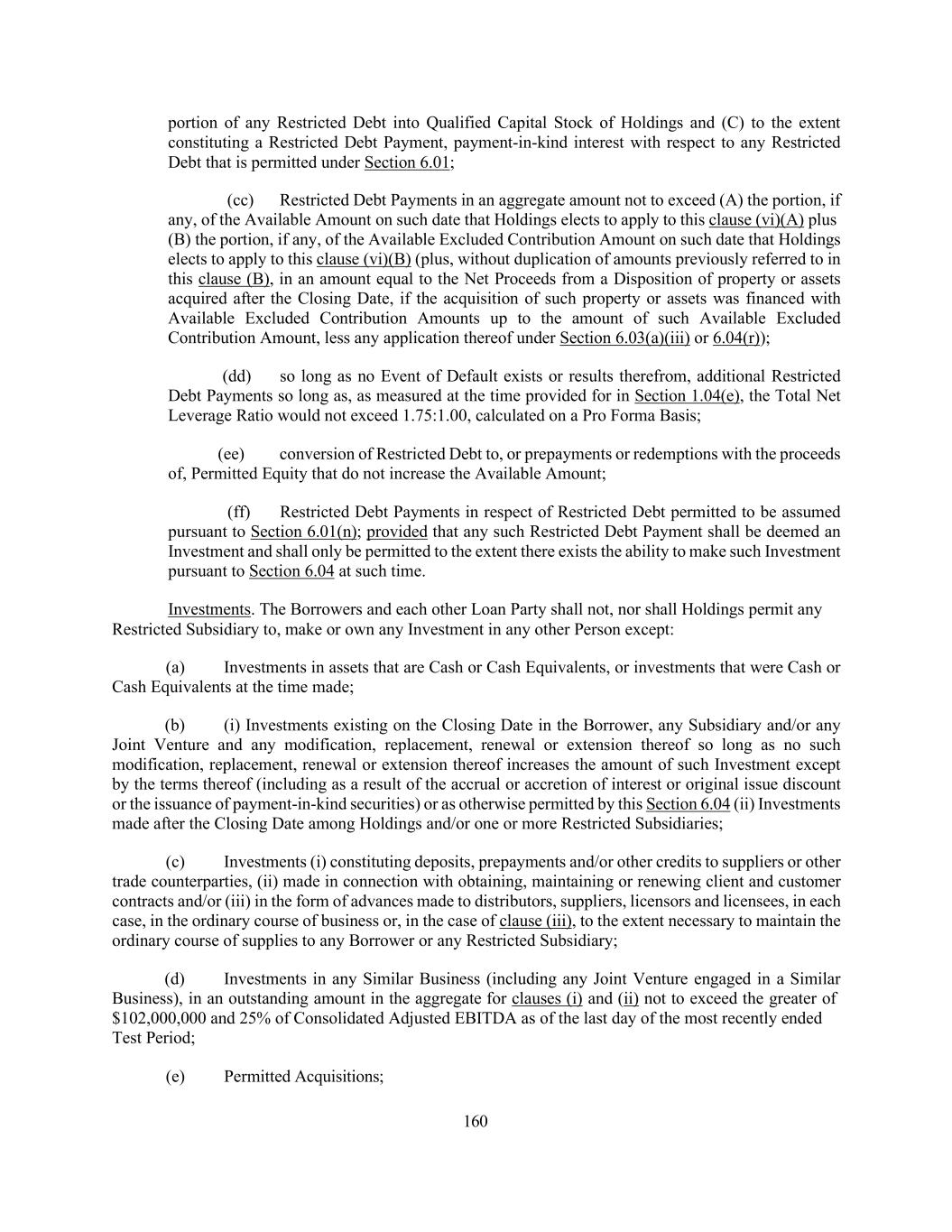 160 portion of any Restricted Debt into Qualified Capital Stock of Holdings and (C) to the extent constituting a Restricted Debt Payment, payment-in-kind interest with respect to any Restricted Debt that is permitted under Section 6.01; (cc) Restricted Debt Payments in an aggregate amount not to exceed (A) the portion, if any, of the Available Amount on such date that Holdings elects to apply to this clause (vi)(A) plus (B) the portion, if any, of the Available Excluded Contribution Amount on such date that Holdings elects to apply to this clause (vi)(B) (plus, without duplication of amounts previously referred to in this clause (B), in an amount equal to the Net Proceeds from a Disposition of property or assets acquired after the Closing Date, if the acquisition of such property or assets was financed with Available Excluded Contribution Amounts up to the amount of such Available Excluded Contribution Amount, less any application thereof under Section 6.03(a)(iii) or 6.04(r)); (dd) so long as no Event of Default exists or results therefrom, additional Restricted Debt Payments so long as, as measured at the time provided for in Section 1.04(e), the Total Net Leverage Ratio would not exceed 1.75:1.00, calculated on a Pro Forma Basis; (ee) conversion of Restricted Debt to, or prepayments or redemptions with the proceeds of, Permitted Equity that do not increase the Available Amount; (ff) Restricted Debt Payments in respect of Restricted Debt permitted to be assumed pursuant to Section 6.01(n); provided that any such Restricted Debt Payment shall be deemed an Investment and shall only be permitted to the extent there exists the ability to make such Investment pursuant to Section 6.04 at such time. Investments. The Borrowers and each other Loan Party shall not, nor shall Holdings permit any Restricted Subsidiary to, make or own any Investment in any other Person except: (a) Investments in assets that are Cash or Cash Equivalents, or investments that were Cash or Cash Equivalents at the time made; (b) (i) Investments existing on the Closing Date in the Borrower, any Subsidiary and/or any Joint Venture and any modification, replacement, renewal or extension thereof so long as no such modification, replacement, renewal or extension thereof increases the amount of such Investment except by the terms thereof (including as a result of the accrual or accretion of interest or original issue discount or the issuance of payment-in-kind securities) or as otherwise permitted by this Section 6.04 (ii) Investments made after the Closing Date among Holdings and/or one or more Restricted Subsidiaries; (c) Investments (i) constituting deposits, prepayments and/or other credits to suppliers or other trade counterparties, (ii) made in connection with obtaining, maintaining or renewing client and customer contracts and/or (iii) in the form of advances made to distributors, suppliers, licensors and licensees, in each case, in the ordinary course of business or, in the case of clause (iii), to the extent necessary to maintain the ordinary course of supplies to any Borrower or any Restricted Subsidiary; (d) Investments in any Similar Business (including any Joint Venture engaged in a Similar Business), in an outstanding amount in the aggregate for clauses (i) and (ii) not to exceed the greater of $102,000,000 and 25% of Consolidated Adjusted EBITDA as of the last day of the most recently ended Test Period; (e) Permitted Acquisitions;