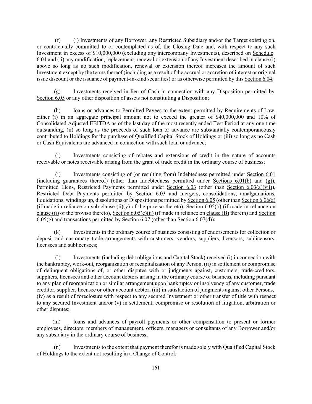 161 (f) (i) Investments of any Borrower, any Restricted Subsidiary and/or the Target existing on, or contractually committed to or contemplated as of, the Closing Date and, with respect to any such Investment in excess of $10,000,000 (excluding any intercompany Investments), described on Schedule 6.04 and (ii) any modification, replacement, renewal or extension of any Investment described in clause (i) above so long as no such modification, renewal or extension thereof increases the amount of such Investment except by the terms thereof (including as a result of the accrual or accretion of interest or original issue discount or the issuance of payment-in-kind securities) or as otherwise permitted by this Section 6.04; (g) Investments received in lieu of Cash in connection with any Disposition permitted by Section 6.05 or any other disposition of assets not constituting a Disposition; (h) loans or advances to Permitted Payees to the extent permitted by Requirements of Law, either (i) in an aggregate principal amount not to exceed the greater of $40,000,000 and 10% of Consolidated Adjusted EBITDA as of the last day of the most recently ended Test Period at any one time outstanding, (ii) so long as the proceeds of such loan or advance are substantially contemporaneously contributed to Holdings for the purchase of Qualified Capital Stock of Holdings or (iii) so long as no Cash or Cash Equivalents are advanced in connection with such loan or advance; (i) Investments consisting of rebates and extensions of credit in the nature of accounts receivable or notes receivable arising from the grant of trade credit in the ordinary course of business; (j) Investments consisting of (or resulting from) Indebtedness permitted under Section 6.01 (including guarantees thereof) (other than Indebtedness permitted under Sections 6.01(b) and (g)), Permitted Liens, Restricted Payments permitted under Section 6.03 (other than Section 6.03(a)(vii)), Restricted Debt Payments permitted by Section 6.03 and mergers, consolidations, amalgamations, liquidations, windings up, dissolutions or Dispositions permitted by Section 6.05 (other than Section 6.06(a) (if made in reliance on sub-clause (ii)(y) of the proviso thereto), Section 6.05(b) (if made in reliance on clause (ii) of the proviso thereto), Section 6.05(c)(ii) (if made in reliance on clause (B) therein) and Section 6.05(g) and transactions permitted by Section 6.07 (other than Section 6.07(d)); (k) Investments in the ordinary course of business consisting of endorsements for collection or deposit and customary trade arrangements with customers, vendors, suppliers, licensors, sublicensors, licensees and sublicensees; (l) Investments (including debt obligations and Capital Stock) received (i) in connection with the bankruptcy, work-out, reorganization or recapitalization of any Person, (ii) in settlement or compromise of delinquent obligations of, or other disputes with or judgments against, customers, trade-creditors, suppliers, licensees and other account debtors arising in the ordinary course of business, including pursuant to any plan of reorganization or similar arrangement upon bankruptcy or insolvency of any customer, trade creditor, supplier, licensee or other account debtor, (iii) in satisfaction of judgments against other Persons, (iv) as a result of foreclosure with respect to any secured Investment or other transfer of title with respect to any secured Investment and/or (v) in settlement, compromise or resolution of litigation, arbitration or other disputes; (m) loans and advances of payroll payments or other compensation to present or former employees, directors, members of management, officers, managers or consultants of any Borrower and/or any subsidiary in the ordinary course of business; (n) Investments to the extent that payment therefor is made solely with Qualified Capital Stock of Holdings to the extent not resulting in a Change of Control;