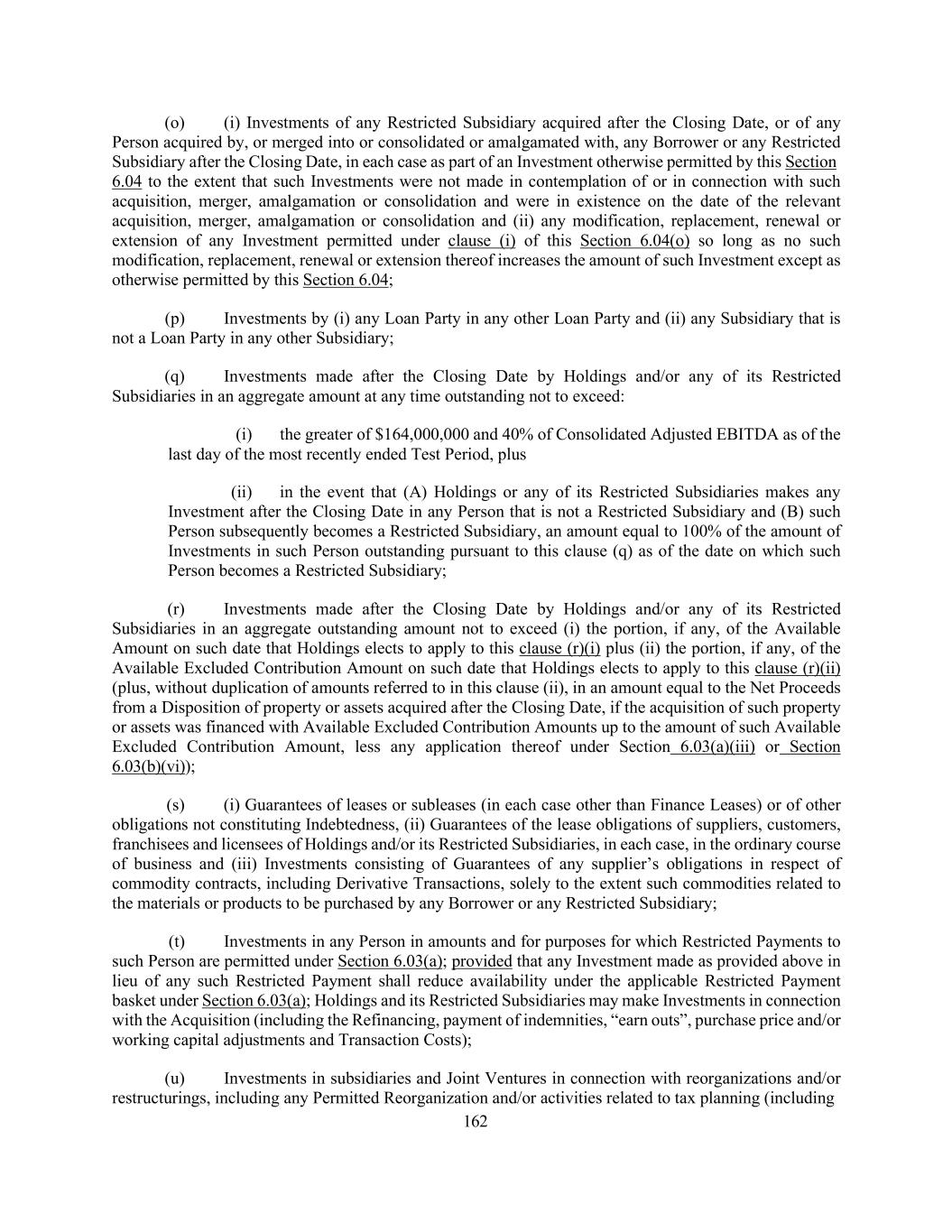 162 (o) (i) Investments of any Restricted Subsidiary acquired after the Closing Date, or of any Person acquired by, or merged into or consolidated or amalgamated with, any Borrower or any Restricted Subsidiary after the Closing Date, in each case as part of an Investment otherwise permitted by this Section 6.04 to the extent that such Investments were not made in contemplation of or in connection with such acquisition, merger, amalgamation or consolidation and were in existence on the date of the relevant acquisition, merger, amalgamation or consolidation and (ii) any modification, replacement, renewal or extension of any Investment permitted under clause (i) of this Section 6.04(o) so long as no such modification, replacement, renewal or extension thereof increases the amount of such Investment except as otherwise permitted by this Section 6.04; (p) Investments by (i) any Loan Party in any other Loan Party and (ii) any Subsidiary that is not a Loan Party in any other Subsidiary; (q) Investments made after the Closing Date by Holdings and/or any of its Restricted Subsidiaries in an aggregate amount at any time outstanding not to exceed: (i) the greater of $164,000,000 and 40% of Consolidated Adjusted EBITDA as of the last day of the most recently ended Test Period, plus (ii) in the event that (A) Holdings or any of its Restricted Subsidiaries makes any Investment after the Closing Date in any Person that is not a Restricted Subsidiary and (B) such Person subsequently becomes a Restricted Subsidiary, an amount equal to 100% of the amount of Investments in such Person outstanding pursuant to this clause (q) as of the date on which such Person becomes a Restricted Subsidiary; (r) Investments made after the Closing Date by Holdings and/or any of its Restricted Subsidiaries in an aggregate outstanding amount not to exceed (i) the portion, if any, of the Available Amount on such date that Holdings elects to apply to this clause (r)(i) plus (ii) the portion, if any, of the Available Excluded Contribution Amount on such date that Holdings elects to apply to this clause (r)(ii) (plus, without duplication of amounts referred to in this clause (ii), in an amount equal to the Net Proceeds from a Disposition of property or assets acquired after the Closing Date, if the acquisition of such property or assets was financed with Available Excluded Contribution Amounts up to the amount of such Available Excluded Contribution Amount, less any application thereof under Section 6.03(a)(iii) or Section 6.03(b)(vi)); (s) (i) Guarantees of leases or subleases (in each case other than Finance Leases) or of other obligations not constituting Indebtedness, (ii) Guarantees of the lease obligations of suppliers, customers, franchisees and licensees of Holdings and/or its Restricted Subsidiaries, in each case, in the ordinary course of business and (iii) Investments consisting of Guarantees of any supplier’s obligations in respect of commodity contracts, including Derivative Transactions, solely to the extent such commodities related to the materials or products to be purchased by any Borrower or any Restricted Subsidiary; (t) Investments in any Person in amounts and for purposes for which Restricted Payments to such Person are permitted under Section 6.03(a); provided that any Investment made as provided above in lieu of any such Restricted Payment shall reduce availability under the applicable Restricted Payment basket under Section 6.03(a); Holdings and its Restricted Subsidiaries may make Investments in connection with the Acquisition (including the Refinancing, payment of indemnities, “earn outs”, purchase price and/or working capital adjustments and Transaction Costs); (u) Investments in subsidiaries and Joint Ventures in connection with reorganizations and/or restructurings, including any Permitted Reorganization and/or activities related to tax planning (including