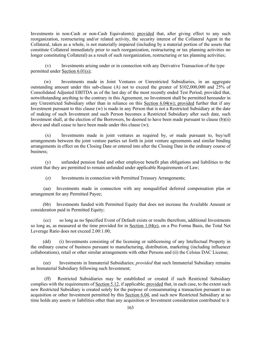 163 Investments in non-Cash or non-Cash Equivalents); provided that, after giving effect to any such reorganization, restructuring and/or related activity, the security interest of the Collateral Agent in the Collateral, taken as a whole, is not materially impaired (including by a material portion of the assets that constitute Collateral immediately prior to such reorganization, restructuring or tax planning activities no longer constituting Collateral) as a result of such reorganization, restructuring or tax planning activities; (v) Investments arising under or in connection with any Derivative Transaction of the type permitted under Section 6.01(s); (w) Investments made in Joint Ventures or Unrestricted Subsidiaries, in an aggregate outstanding amount under this sub-clause (A) not to exceed the greater of $102,000,000 and 25% of Consolidated Adjusted EBITDA as of the last day of the most recently ended Test Period; provided that, notwithstanding anything to the contrary in this Agreement, no Investment shall be permitted hereunder in any Unrestricted Subsidiary other than in reliance on this Section 6.04(w); provided further that if any Investment pursuant to this clause (w) is made in any Person that is not a Restricted Subsidiary at the date of making of such Investment and such Person becomes a Restricted Subsidiary after such date, such Investment shall, at the election of the Borrowers, be deemed to have been made pursuant to clause (b)(ii) above and shall cease to have been made under this clause (w); (x) Investments made in joint ventures as required by, or made pursuant to, buy/sell arrangements between the joint venture parties set forth in joint venture agreements and similar binding arrangements in effect on the Closing Date or entered into after the Closing Date in the ordinary course of business; (y) unfunded pension fund and other employee benefit plan obligations and liabilities to the extent that they are permitted to remain unfunded under applicable Requirements of Law; (z) Investments in connection with Permitted Treasury Arrangements; (aa) Investments made in connection with any nonqualified deferred compensation plan or arrangement for any Permitted Payee; (bb) Investments funded with Permitted Equity that does not increase the Available Amount or consideration paid in Permitted Equity; (cc) so long as no Specified Event of Default exists or results therefrom, additional Investments so long as, as measured at the time provided for in Section 1.04(e), on a Pro Forma Basis, the Total Net Leverage Ratio does not exceed 2.00:1.00; (dd) (i) Investments consisting of the licensing or sublicensing of any Intellectual Property in the ordinary course of business pursuant to manufacturing, distribution, marketing (including influencer collaborations), retail or other similar arrangements with other Persons and (ii) the Celsius DAC License; (ee) Investments in Immaterial Subsidiaries; provided that such Immaterial Subsidiary remains an Immaterial Subsidiary following such Investment; (ff) Restricted Subsidiaries may be established or created if such Restricted Subsidiary complies with the requirements of Section 5.12, if applicable; provided that, in each case, to the extent such new Restricted Subsidiary is created solely for the purpose of consummating a transaction pursuant to an acquisition or other Investment permitted by this Section 6.04, and such new Restricted Subsidiary at no time holds any assets or liabilities other than any acquisition or Investment consideration contributed to it
