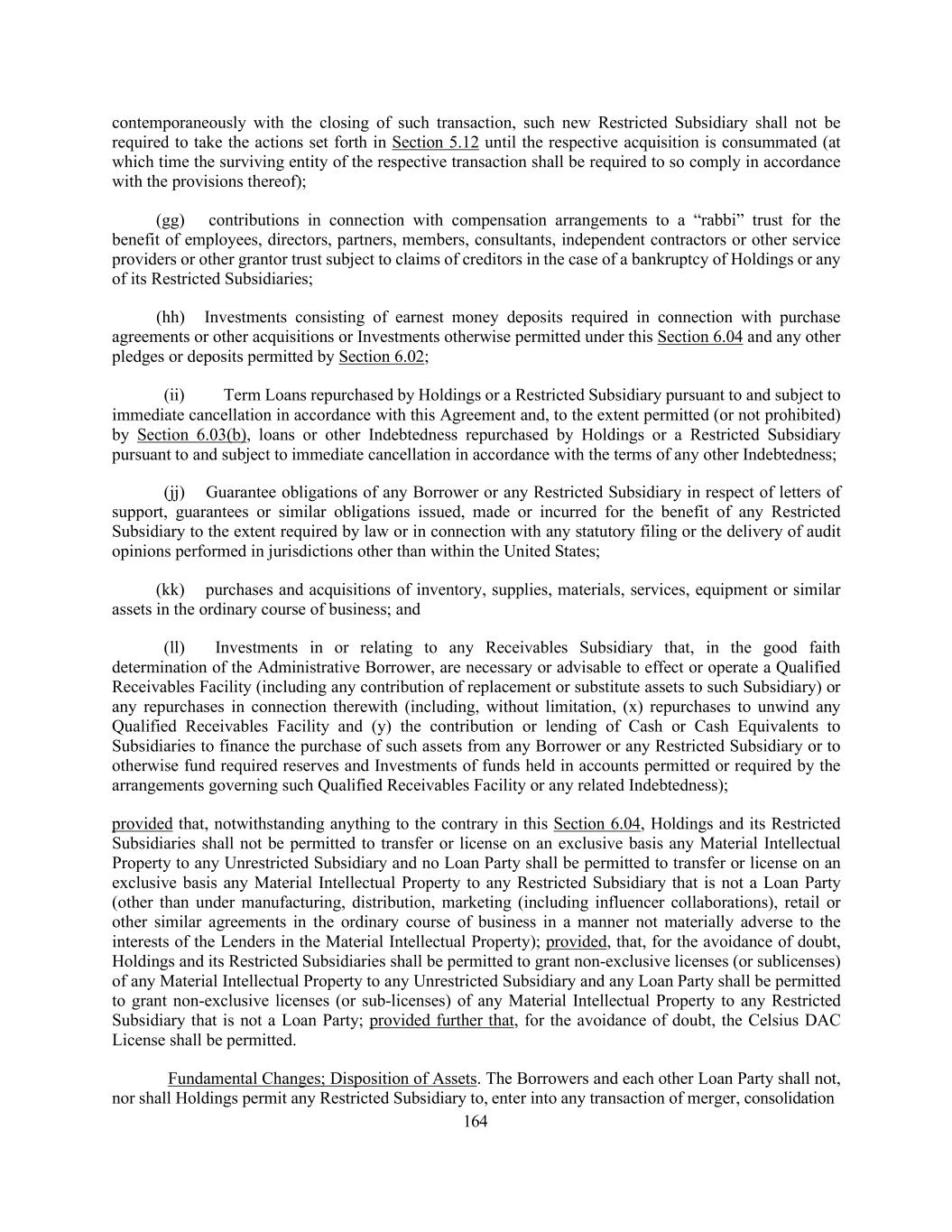 164 contemporaneously with the closing of such transaction, such new Restricted Subsidiary shall not be required to take the actions set forth in Section 5.12 until the respective acquisition is consummated (at which time the surviving entity of the respective transaction shall be required to so comply in accordance with the provisions thereof); (gg) contributions in connection with compensation arrangements to a “rabbi” trust for the benefit of employees, directors, partners, members, consultants, independent contractors or other service providers or other grantor trust subject to claims of creditors in the case of a bankruptcy of Holdings or any of its Restricted Subsidiaries; (hh) Investments consisting of earnest money deposits required in connection with purchase agreements or other acquisitions or Investments otherwise permitted under this Section 6.04 and any other pledges or deposits permitted by Section 6.02; (ii) Term Loans repurchased by Holdings or a Restricted Subsidiary pursuant to and subject to immediate cancellation in accordance with this Agreement and, to the extent permitted (or not prohibited) by Section 6.03(b), loans or other Indebtedness repurchased by Holdings or a Restricted Subsidiary pursuant to and subject to immediate cancellation in accordance with the terms of any other Indebtedness; (jj) Guarantee obligations of any Borrower or any Restricted Subsidiary in respect of letters of support, guarantees or similar obligations issued, made or incurred for the benefit of any Restricted Subsidiary to the extent required by law or in connection with any statutory filing or the delivery of audit opinions performed in jurisdictions other than within the United States; (kk) purchases and acquisitions of inventory, supplies, materials, services, equipment or similar assets in the ordinary course of business; and (ll) Investments in or relating to any Receivables Subsidiary that, in the good faith determination of the Administrative Borrower, are necessary or advisable to effect or operate a Qualified Receivables Facility (including any contribution of replacement or substitute assets to such Subsidiary) or any repurchases in connection therewith (including, without limitation, (x) repurchases to unwind any Qualified Receivables Facility and (y) the contribution or lending of Cash or Cash Equivalents to Subsidiaries to finance the purchase of such assets from any Borrower or any Restricted Subsidiary or to otherwise fund required reserves and Investments of funds held in accounts permitted or required by the arrangements governing such Qualified Receivables Facility or any related Indebtedness); provided that, notwithstanding anything to the contrary in this Section 6.04, Holdings and its Restricted Subsidiaries shall not be permitted to transfer or license on an exclusive basis any Material Intellectual Property to any Unrestricted Subsidiary and no Loan Party shall be permitted to transfer or license on an exclusive basis any Material Intellectual Property to any Restricted Subsidiary that is not a Loan Party (other than under manufacturing, distribution, marketing (including influencer collaborations), retail or other similar agreements in the ordinary course of business in a manner not materially adverse to the interests of the Lenders in the Material Intellectual Property); provided, that, for the avoidance of doubt, Holdings and its Restricted Subsidiaries shall be permitted to grant non-exclusive licenses (or sublicenses) of any Material Intellectual Property to any Unrestricted Subsidiary and any Loan Party shall be permitted to grant non-exclusive licenses (or sub-licenses) of any Material Intellectual Property to any Restricted Subsidiary that is not a Loan Party; provided further that, for the avoidance of doubt, the Celsius DAC License shall be permitted. Fundamental Changes; Disposition of Assets. The Borrowers and each other Loan Party shall not, nor shall Holdings permit any Restricted Subsidiary to, enter into any transaction of merger, consolidation