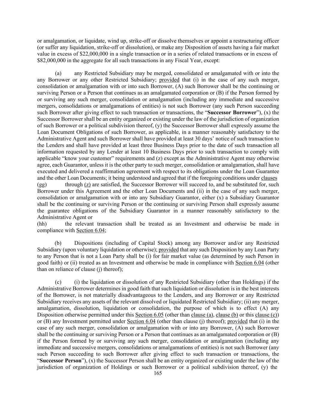 165 or amalgamation, or liquidate, wind up, strike-off or dissolve themselves or appoint a restructuring officer (or suffer any liquidation, strike-off or dissolution), or make any Disposition of assets having a fair market value in excess of $22,000,000 in a single transaction or in a series of related transactions or in excess of $82,000,000 in the aggregate for all such transactions in any Fiscal Year, except: (a) any Restricted Subsidiary may be merged, consolidated or amalgamated with or into the any Borrower or any other Restricted Subsidiary; provided that (i) in the case of any such merger, consolidation or amalgamation with or into such Borrower, (A) such Borrower shall be the continuing or surviving Person or a Person that continues as an amalgamated corporation or (B) if the Person formed by or surviving any such merger, consolidation or amalgamation (including any immediate and successive mergers, consolidations or amalgamations of entities) is not such Borrower (any such Person succeeding such Borrower after giving effect to such transaction or transactions, the “Successor Borrower”), (x) the Successor Borrower shall be an entity organized or existing under the law of the jurisdiction of organization of such Borrower or a political subdivision thereof, (y) the Successor Borrower shall expressly assume the Loan Document Obligations of such Borrower, as applicable, in a manner reasonably satisfactory to the Administrative Agent and such Borrower shall have provided at least 30 days’ notice of such transaction to the Lenders and shall have provided at least three Business Days prior to the date of such transaction all information requested by any Lender at least 10 Business Days prior to such transaction to comply with applicable “know your customer” requirements and (z) except as the Administrative Agent may otherwise agree, each Guarantor, unless it is the other party to such merger, consolidation or amalgamation, shall have executed and delivered a reaffirmation agreement with respect to its obligations under the Loan Guarantee and the other Loan Documents; it being understood and agreed that if the foregoing conditions under clauses (gg) through (z) are satisfied, the Successor Borrower will succeed to, and be substituted for, such Borrower under this Agreement and the other Loan Documents and (ii) in the case of any such merger, consolidation or amalgamation with or into any Subsidiary Guarantor, either (x) a Subsidiary Guarantor shall be the continuing or surviving Person or the continuing or surviving Person shall expressly assume the guarantee obligations of the Subsidiary Guarantor in a manner reasonably satisfactory to the Administrative Agent or (hh) the relevant transaction shall be treated as an Investment and otherwise be made in compliance with Section 6.04; (b) Dispositions (including of Capital Stock) among any Borrower and/or any Restricted Subsidiary (upon voluntary liquidation or otherwise); provided that any such Disposition by any Loan Party to any Person that is not a Loan Party shall be (i) for fair market value (as determined by such Person in good faith) or (ii) treated as an Investment and otherwise be made in compliance with Section 6.04 (other than on reliance of clause (j) thereof); (c) (i) the liquidation or dissolution of any Restricted Subsidiary (other than Holdings) if the Administrative Borrower determines in good faith that such liquidation or dissolution is in the best interests of the Borrower, is not materially disadvantageous to the Lenders, and any Borrower or any Restricted Subsidiary receives any assets of the relevant dissolved or liquidated Restricted Subsidiary; (ii) any merger, amalgamation, dissolution, liquidation or consolidation, the purpose of which is to effect (A) any Disposition otherwise permitted under this Section 6.05 (other than clause (a), clause (b) or this clause (c)) or (B) any Investment permitted under Section 6.04 (other than clause (j) thereof); provided that (i) in the case of any such merger, consolidation or amalgamation with or into any Borrower, (A) such Borrower shall be the continuing or surviving Person or a Person that continues as an amalgamated corporation or (B) if the Person formed by or surviving any such merger, consolidation or amalgamation (including any immediate and successive mergers, consolidations or amalgamations of entities) is not such Borrower (any such Person succeeding to such Borrower after giving effect to such transaction or transactions, the “Successor Person”), (x) the Successor Person shall be an entity organized or existing under the law of the jurisdiction of organization of Holdings or such Borrower or a political subdivision thereof, (y) the