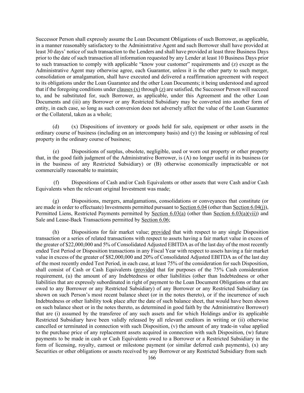 166 Successor Person shall expressly assume the Loan Document Obligations of such Borrower, as applicable, in a manner reasonably satisfactory to the Administrative Agent and such Borrower shall have provided at least 30 days’ notice of such transaction to the Lenders and shall have provided at least three Business Days prior to the date of such transaction all information requested by any Lender at least 10 Business Days prior to such transaction to comply with applicable “know your customer” requirements and (z) except as the Administrative Agent may otherwise agree, each Guarantor, unless it is the other party to such merger, consolidation or amalgamation, shall have executed and delivered a reaffirmation agreement with respect to its obligations under the Loan Guarantee and the other Loan Documents; it being understood and agreed that if the foregoing conditions under clauses (x) through (z) are satisfied, the Successor Person will succeed to, and be substituted for, such Borrower, as applicable, under this Agreement and the other Loan Documents and (iii) any Borrower or any Restricted Subsidiary may be converted into another form of entity, in each case, so long as such conversion does not adversely affect the value of the Loan Guarantee or the Collateral, taken as a whole; (d) (x) Dispositions of inventory or goods held for sale, equipment or other assets in the ordinary course of business (including on an intercompany basis) and (y) the leasing or subleasing of real property in the ordinary course of business; (e) Dispositions of surplus, obsolete, negligible, used or worn out property or other property that, in the good faith judgment of the Administrative Borrower, is (A) no longer useful in its business (or in the business of any Restricted Subsidiary) or (B) otherwise economically impracticable or not commercially reasonable to maintain; (f) Dispositions of Cash and/or Cash Equivalents or other assets that were Cash and/or Cash Equivalents when the relevant original Investment was made; (g) Dispositions, mergers, amalgamations, consolidations or conveyances that constitute (or are made in order to effectuate) Investments permitted pursuant to Section 6.04 (other than Section 6.04(j)), Permitted Liens, Restricted Payments permitted by Section 6.03(a) (other than Section 6.03(a)(vii)) and Sale and Lease-Back Transactions permitted by Section 6.06; (h) Dispositions for fair market value; provided that with respect to any single Disposition transaction or a series of related transactions with respect to assets having a fair market value in excess of the greater of $22,000,000 and 5% of Consolidated Adjusted EBITDA as of the last day of the most recently ended Test Period or Disposition transactions in any Fiscal Year with respect to assets having a fair market value in excess of the greater of $82,000,000 and 20% of Consolidated Adjusted EBITDA as of the last day of the most recently ended Test Period, in each case, at least 75% of the consideration for such Disposition, shall consist of Cash or Cash Equivalents (provided that for purposes of the 75% Cash consideration requirement, (u) the amount of any Indebtedness or other liabilities (other than Indebtedness or other liabilities that are expressly subordinated in right of payment to the Loan Document Obligations or that are owed to any Borrower or any Restricted Subsidiary) of any Borrower or any Restricted Subsidiary (as shown on such Person’s most recent balance sheet (or in the notes thereto), or if the incurrence of such Indebtedness or other liability took place after the date of such balance sheet, that would have been shown on such balance sheet or in the notes thereto, as determined in good faith by the Administrative Borrower) that are (i) assumed by the transferee of any such assets and for which Holdings and/or its applicable Restricted Subsidiary have been validly released by all relevant creditors in writing or (ii) otherwise cancelled or terminated in connection with such Disposition, (v) the amount of any trade-in value applied to the purchase price of any replacement assets acquired in connection with such Disposition, (w) future payments to be made in cash or Cash Equivalents owed to a Borrower or a Restricted Subsidiary in the form of licensing, royalty, earnout or milestone payment (or similar deferred cash payments), (x) any Securities or other obligations or assets received by any Borrower or any Restricted Subsidiary from such