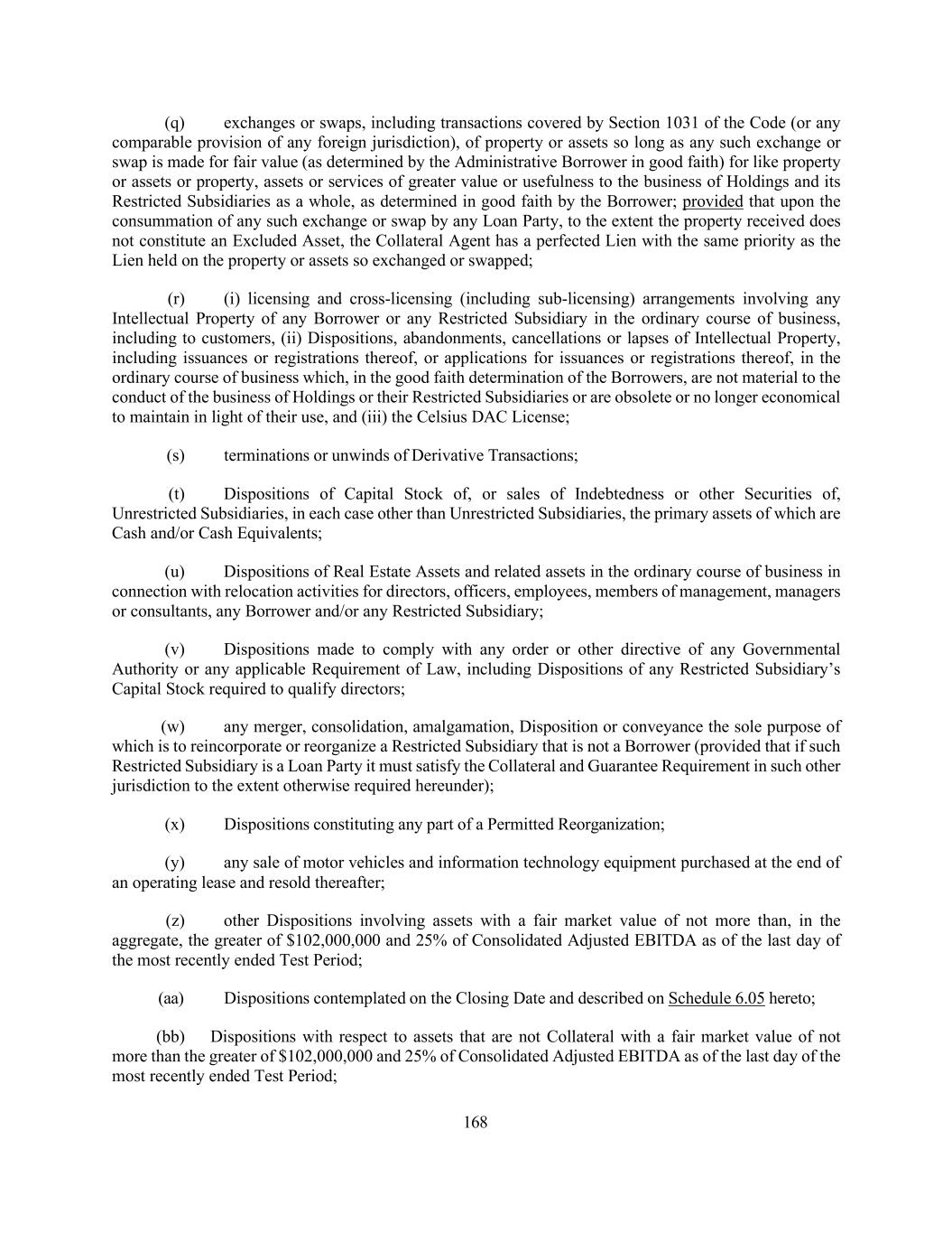 168 (q) exchanges or swaps, including transactions covered by Section 1031 of the Code (or any comparable provision of any foreign jurisdiction), of property or assets so long as any such exchange or swap is made for fair value (as determined by the Administrative Borrower in good faith) for like property or assets or property, assets or services of greater value or usefulness to the business of Holdings and its Restricted Subsidiaries as a whole, as determined in good faith by the Borrower; provided that upon the consummation of any such exchange or swap by any Loan Party, to the extent the property received does not constitute an Excluded Asset, the Collateral Agent has a perfected Lien with the same priority as the Lien held on the property or assets so exchanged or swapped; (r) (i) licensing and cross-licensing (including sub-licensing) arrangements involving any Intellectual Property of any Borrower or any Restricted Subsidiary in the ordinary course of business, including to customers, (ii) Dispositions, abandonments, cancellations or lapses of Intellectual Property, including issuances or registrations thereof, or applications for issuances or registrations thereof, in the ordinary course of business which, in the good faith determination of the Borrowers, are not material to the conduct of the business of Holdings or their Restricted Subsidiaries or are obsolete or no longer economical to maintain in light of their use, and (iii) the Celsius DAC License; (s) terminations or unwinds of Derivative Transactions; (t) Dispositions of Capital Stock of, or sales of Indebtedness or other Securities of, Unrestricted Subsidiaries, in each case other than Unrestricted Subsidiaries, the primary assets of which are Cash and/or Cash Equivalents; (u) Dispositions of Real Estate Assets and related assets in the ordinary course of business in connection with relocation activities for directors, officers, employees, members of management, managers or consultants, any Borrower and/or any Restricted Subsidiary; (v) Dispositions made to comply with any order or other directive of any Governmental Authority or any applicable Requirement of Law, including Dispositions of any Restricted Subsidiary’s Capital Stock required to qualify directors; (w) any merger, consolidation, amalgamation, Disposition or conveyance the sole purpose of which is to reincorporate or reorganize a Restricted Subsidiary that is not a Borrower (provided that if such Restricted Subsidiary is a Loan Party it must satisfy the Collateral and Guarantee Requirement in such other jurisdiction to the extent otherwise required hereunder); (x) Dispositions constituting any part of a Permitted Reorganization; (y) any sale of motor vehicles and information technology equipment purchased at the end of an operating lease and resold thereafter; (z) other Dispositions involving assets with a fair market value of not more than, in the aggregate, the greater of $102,000,000 and 25% of Consolidated Adjusted EBITDA as of the last day of the most recently ended Test Period; (aa) Dispositions contemplated on the Closing Date and described on Schedule 6.05 hereto; (bb) Dispositions with respect to assets that are not Collateral with a fair market value of not more than the greater of $102,000,000 and 25% of Consolidated Adjusted EBITDA as of the last day of the most recently ended Test Period;