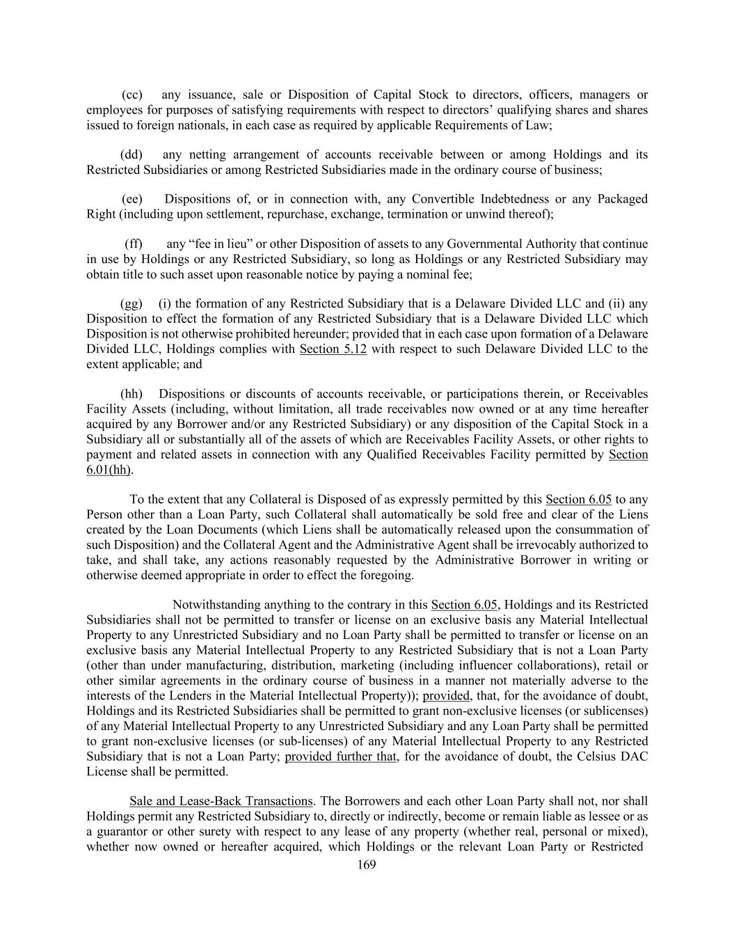 169 (cc) any issuance, sale or Disposition of Capital Stock to directors, officers, managers or employees for purposes of satisfying requirements with respect to directors’ qualifying shares and shares issued to foreign nationals, in each case as required by applicable Requirements of Law; (dd) any netting arrangement of accounts receivable between or among Holdings and its Restricted Subsidiaries or among Restricted Subsidiaries made in the ordinary course of business; (ee) Dispositions of, or in connection with, any Convertible Indebtedness or any Packaged Right (including upon settlement, repurchase, exchange, termination or unwind thereof); (ff) any “fee in lieu” or other Disposition of assets to any Governmental Authority that continue in use by Holdings or any Restricted Subsidiary, so long as Holdings or any Restricted Subsidiary may obtain title to such asset upon reasonable notice by paying a nominal fee; (gg) (i) the formation of any Restricted Subsidiary that is a Delaware Divided LLC and (ii) any Disposition to effect the formation of any Restricted Subsidiary that is a Delaware Divided LLC which Disposition is not otherwise prohibited hereunder; provided that in each case upon formation of a Delaware Divided LLC, Holdings complies with Section 5.12 with respect to such Delaware Divided LLC to the extent applicable; and (hh) Dispositions or discounts of accounts receivable, or participations therein, or Receivables Facility Assets (including, without limitation, all trade receivables now owned or at any time hereafter acquired by any Borrower and/or any Restricted Subsidiary) or any disposition of the Capital Stock in a Subsidiary all or substantially all of the assets of which are Receivables Facility Assets, or other rights to payment and related assets in connection with any Qualified Receivables Facility permitted by Section 6.01(hh). To the extent that any Collateral is Disposed of as expressly permitted by this Section 6.05 to any Person other than a Loan Party, such Collateral shall automatically be sold free and clear of the Liens created by the Loan Documents (which Liens shall be automatically released upon the consummation of such Disposition) and the Collateral Agent and the Administrative Agent shall be irrevocably authorized to take, and shall take, any actions reasonably requested by the Administrative Borrower in writing or otherwise deemed appropriate in order to effect the foregoing. Notwithstanding anything to the contrary in this Section 6.05, Holdings and its Restricted Subsidiaries shall not be permitted to transfer or license on an exclusive basis any Material Intellectual Property to any Unrestricted Subsidiary and no Loan Party shall be permitted to transfer or license on an exclusive basis any Material Intellectual Property to any Restricted Subsidiary that is not a Loan Party (other than under manufacturing, distribution, marketing (including influencer collaborations), retail or other similar agreements in the ordinary course of business in a manner not materially adverse to the interests of the Lenders in the Material Intellectual Property)); provided, that, for the avoidance of doubt, Holdings and its Restricted Subsidiaries shall be permitted to grant non-exclusive licenses (or sublicenses) of any Material Intellectual Property to any Unrestricted Subsidiary and any Loan Party shall be permitted to grant non-exclusive licenses (or sub-licenses) of any Material Intellectual Property to any Restricted Subsidiary that is not a Loan Party; provided further that, for the avoidance of doubt, the Celsius DAC License shall be permitted. Sale and Lease-Back Transactions. The Borrowers and each other Loan Party shall not, nor shall Holdings permit any Restricted Subsidiary to, directly or indirectly, become or remain liable as lessee or as a guarantor or other surety with respect to any lease of any property (whether real, personal or mixed), whether now owned or hereafter acquired, which Holdings or the relevant Loan Party or Restricted