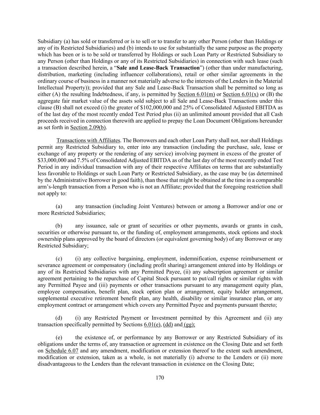 170 Subsidiary (a) has sold or transferred or is to sell or to transfer to any other Person (other than Holdings or any of its Restricted Subsidiaries) and (b) intends to use for substantially the same purpose as the property which has been or is to be sold or transferred by Holdings or such Loan Party or Restricted Subsidiary to any Person (other than Holdings or any of its Restricted Subsidiaries) in connection with such lease (such a transaction described herein, a “Sale and Lease-Back Transaction”) (other than under manufacturing, distribution, marketing (including influencer collaborations), retail or other similar agreements in the ordinary course of business in a manner not materially adverse to the interests of the Lenders in the Material Intellectual Property)); provided that any Sale and Lease-Back Transaction shall be permitted so long as either (A) the resulting Indebtedness, if any, is permitted by Section 6.01(m) or Section 6.01(x) or (B) the aggregate fair market value of the assets sold subject to all Sale and Lease-Back Transactions under this clause (B) shall not exceed (i) the greater of $102,000,000 and 25% of Consolidated Adjusted EBITDA as of the last day of the most recently ended Test Period plus (ii) an unlimited amount provided that all Cash proceeds received in connection therewith are applied to prepay the Loan Document Obligations hereunder as set forth in Section 2.09(b). Transactions with Affiliates. The Borrowers and each other Loan Party shall not, nor shall Holdings permit any Restricted Subsidiary to, enter into any transaction (including the purchase, sale, lease or exchange of any property or the rendering of any service) involving payment in excess of the greater of $33,000,000 and 7.5% of Consolidated Adjusted EBITDA as of the last day of the most recently ended Test Period in any individual transaction with any of their respective Affiliates on terms that are substantially less favorable to Holdings or such Loan Party or Restricted Subsidiary, as the case may be (as determined by the Administrative Borrower in good faith), than those that might be obtained at the time in a comparable arm’s-length transaction from a Person who is not an Affiliate; provided that the foregoing restriction shall not apply to: (a) any transaction (including Joint Ventures) between or among a Borrower and/or one or more Restricted Subsidiaries; (b) any issuance, sale or grant of securities or other payments, awards or grants in cash, securities or otherwise pursuant to, or the funding of, employment arrangements, stock options and stock ownership plans approved by the board of directors (or equivalent governing body) of any Borrower or any Restricted Subsidiary; (c) (i) any collective bargaining, employment, indemnification, expense reimbursement or severance agreement or compensatory (including profit sharing) arrangement entered into by Holdings or any of its Restricted Subsidiaries with any Permitted Payee, (ii) any subscription agreement or similar agreement pertaining to the repurchase of Capital Stock pursuant to put/call rights or similar rights with any Permitted Payee and (iii) payments or other transactions pursuant to any management equity plan, employee compensation, benefit plan, stock option plan or arrangement, equity holder arrangement, supplemental executive retirement benefit plan, any health, disability or similar insurance plan, or any employment contract or arrangement which covers any Permitted Payee and payments pursuant thereto; (d) (i) any Restricted Payment or Investment permitted by this Agreement and (ii) any transaction specifically permitted by Sections 6.01(e), (dd) and (gg); (e) the existence of, or performance by any Borrower or any Restricted Subsidiary of its obligations under the terms of, any transaction or agreement in existence on the Closing Date and set forth on Schedule 6.07 and any amendment, modification or extension thereof to the extent such amendment, modification or extension, taken as a whole, is not materially (i) adverse to the Lenders or (ii) more disadvantageous to the Lenders than the relevant transaction in existence on the Closing Date;
