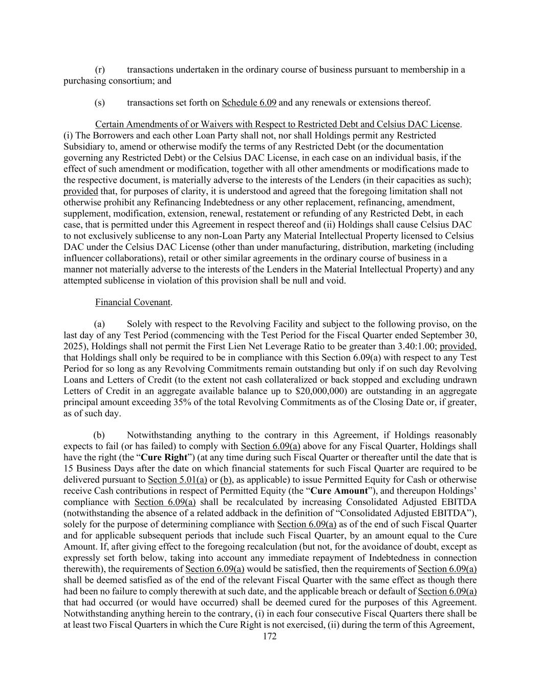 172 (r) transactions undertaken in the ordinary course of business pursuant to membership in a purchasing consortium; and (s) transactions set forth on Schedule 6.09 and any renewals or extensions thereof. Certain Amendments of or Waivers with Respect to Restricted Debt and Celsius DAC License. (i) The Borrowers and each other Loan Party shall not, nor shall Holdings permit any Restricted Subsidiary to, amend or otherwise modify the terms of any Restricted Debt (or the documentation governing any Restricted Debt) or the Celsius DAC License, in each case on an individual basis, if the effect of such amendment or modification, together with all other amendments or modifications made to the respective document, is materially adverse to the interests of the Lenders (in their capacities as such); provided that, for purposes of clarity, it is understood and agreed that the foregoing limitation shall not otherwise prohibit any Refinancing Indebtedness or any other replacement, refinancing, amendment, supplement, modification, extension, renewal, restatement or refunding of any Restricted Debt, in each case, that is permitted under this Agreement in respect thereof and (ii) Holdings shall cause Celsius DAC to not exclusively sublicense to any non-Loan Party any Material Intellectual Property licensed to Celsius DAC under the Celsius DAC License (other than under manufacturing, distribution, marketing (including influencer collaborations), retail or other similar agreements in the ordinary course of business in a manner not materially adverse to the interests of the Lenders in the Material Intellectual Property) and any attempted sublicense in violation of this provision shall be null and void. Financial Covenant. (a) Solely with respect to the Revolving Facility and subject to the following proviso, on the last day of any Test Period (commencing with the Test Period for the Fiscal Quarter ended September 30, 2025), Holdings shall not permit the First Lien Net Leverage Ratio to be greater than 3.40:1.00; provided, that Holdings shall only be required to be in compliance with this Section 6.09(a) with respect to any Test Period for so long as any Revolving Commitments remain outstanding but only if on such day Revolving Loans and Letters of Credit (to the extent not cash collateralized or back stopped and excluding undrawn Letters of Credit in an aggregate available balance up to $20,000,000) are outstanding in an aggregate principal amount exceeding 35% of the total Revolving Commitments as of the Closing Date or, if greater, as of such day. (b) Notwithstanding anything to the contrary in this Agreement, if Holdings reasonably expects to fail (or has failed) to comply with Section 6.09(a) above for any Fiscal Quarter, Holdings shall have the right (the “Cure Right”) (at any time during such Fiscal Quarter or thereafter until the date that is 15 Business Days after the date on which financial statements for such Fiscal Quarter are required to be delivered pursuant to Section 5.01(a) or (b), as applicable) to issue Permitted Equity for Cash or otherwise receive Cash contributions in respect of Permitted Equity (the “Cure Amount”), and thereupon Holdings’ compliance with Section 6.09(a) shall be recalculated by increasing Consolidated Adjusted EBITDA (notwithstanding the absence of a related addback in the definition of “Consolidated Adjusted EBITDA”), solely for the purpose of determining compliance with Section 6.09(a) as of the end of such Fiscal Quarter and for applicable subsequent periods that include such Fiscal Quarter, by an amount equal to the Cure Amount. If, after giving effect to the foregoing recalculation (but not, for the avoidance of doubt, except as expressly set forth below, taking into account any immediate repayment of Indebtedness in connection therewith), the requirements of Section 6.09(a) would be satisfied, then the requirements of Section 6.09(a) shall be deemed satisfied as of the end of the relevant Fiscal Quarter with the same effect as though there had been no failure to comply therewith at such date, and the applicable breach or default of Section 6.09(a) that had occurred (or would have occurred) shall be deemed cured for the purposes of this Agreement. Notwithstanding anything herein to the contrary, (i) in each four consecutive Fiscal Quarters there shall be at least two Fiscal Quarters in which the Cure Right is not exercised, (ii) during the term of this Agreement,