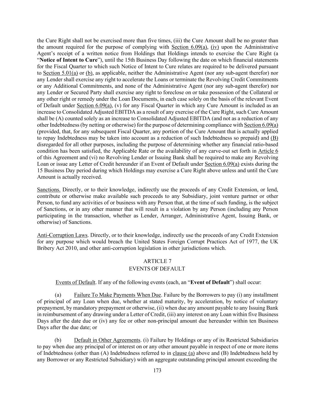 173 the Cure Right shall not be exercised more than five times, (iii) the Cure Amount shall be no greater than the amount required for the purpose of complying with Section 6.09(a), (iv) upon the Administrative Agent’s receipt of a written notice from Holdings that Holdings intends to exercise the Cure Right (a “Notice of Intent to Cure”), until the 15th Business Day following the date on which financial statements for the Fiscal Quarter to which such Notice of Intent to Cure relates are required to be delivered pursuant to Section 5.01(a) or (b), as applicable, neither the Administrative Agent (nor any sub-agent therefor) nor any Lender shall exercise any right to accelerate the Loans or terminate the Revolving Credit Commitments or any Additional Commitments, and none of the Administrative Agent (nor any sub-agent therefor) nor any Lender or Secured Party shall exercise any right to foreclose on or take possession of the Collateral or any other right or remedy under the Loan Documents, in each case solely on the basis of the relevant Event of Default under Section 6.09(a), (v) for any Fiscal Quarter in which any Cure Amount is included as an increase to Consolidated Adjusted EBITDA as a result of any exercise of the Cure Right, such Cure Amount shall be (A) counted solely as an increase to Consolidated Adjusted EBITDA (and not as a reduction of any other Indebtedness (by netting or otherwise) for the purpose of determining compliance with Section 6.09(a) (provided, that, for any subsequent Fiscal Quarter, any portion of the Cure Amount that is actually applied to repay Indebtedness may be taken into account as a reduction of such Indebtedness so prepaid) and (B) disregarded for all other purposes, including the purpose of determining whether any financial ratio-based condition has been satisfied, the Applicable Rate or the availability of any carve-out set forth in Article 6 of this Agreement and (vi) no Revolving Lender or Issuing Bank shall be required to make any Revolving Loan or issue any Letter of Credit hereunder if an Event of Default under Section 6.09(a) exists during the 15 Business Day period during which Holdings may exercise a Cure Right above unless and until the Cure Amount is actually received. Sanctions. Directly, or to their knowledge, indirectly use the proceeds of any Credit Extension, or lend, contribute or otherwise make available such proceeds to any Subsidiary, joint venture partner or other Person, to fund any activities of or business with any Person that, at the time of such funding, is the subject of Sanctions, or in any other manner that will result in a violation by any Person (including any Person participating in the transaction, whether as Lender, Arranger, Administrative Agent, Issuing Bank, or otherwise) of Sanctions. Anti-Corruption Laws. Directly, or to their knowledge, indirectly use the proceeds of any Credit Extension for any purpose which would breach the United States Foreign Corrupt Practices Act of 1977, the UK Bribery Act 2010, and other anti-corruption legislation in other jurisdictions which. ARTICLE 7 EVENTS OF DEFAULT Events of Default. If any of the following events (each, an “Event of Default”) shall occur: (a) Failure To Make Payments When Due. Failure by the Borrowers to pay (i) any installment of principal of any Loan when due, whether at stated maturity, by acceleration, by notice of voluntary prepayment, by mandatory prepayment or otherwise, (ii) when due any amount payable to any Issuing Bank in reimbursement of any drawing under a Letter of Credit, (iii) any interest on any Loan within five Business Days after the date due or (iv) any fee or other non-principal amount due hereunder within ten Business Days after the due date; or (b) Default in Other Agreements. (i) Failure by Holdings or any of its Restricted Subsidiaries to pay when due any principal of or interest on or any other amount payable in respect of one or more items of Indebtedness (other than (A) Indebtedness referred to in clause (a) above and (B) Indebtedness held by any Borrower or any Restricted Subsidiary) with an aggregate outstanding principal amount exceeding the