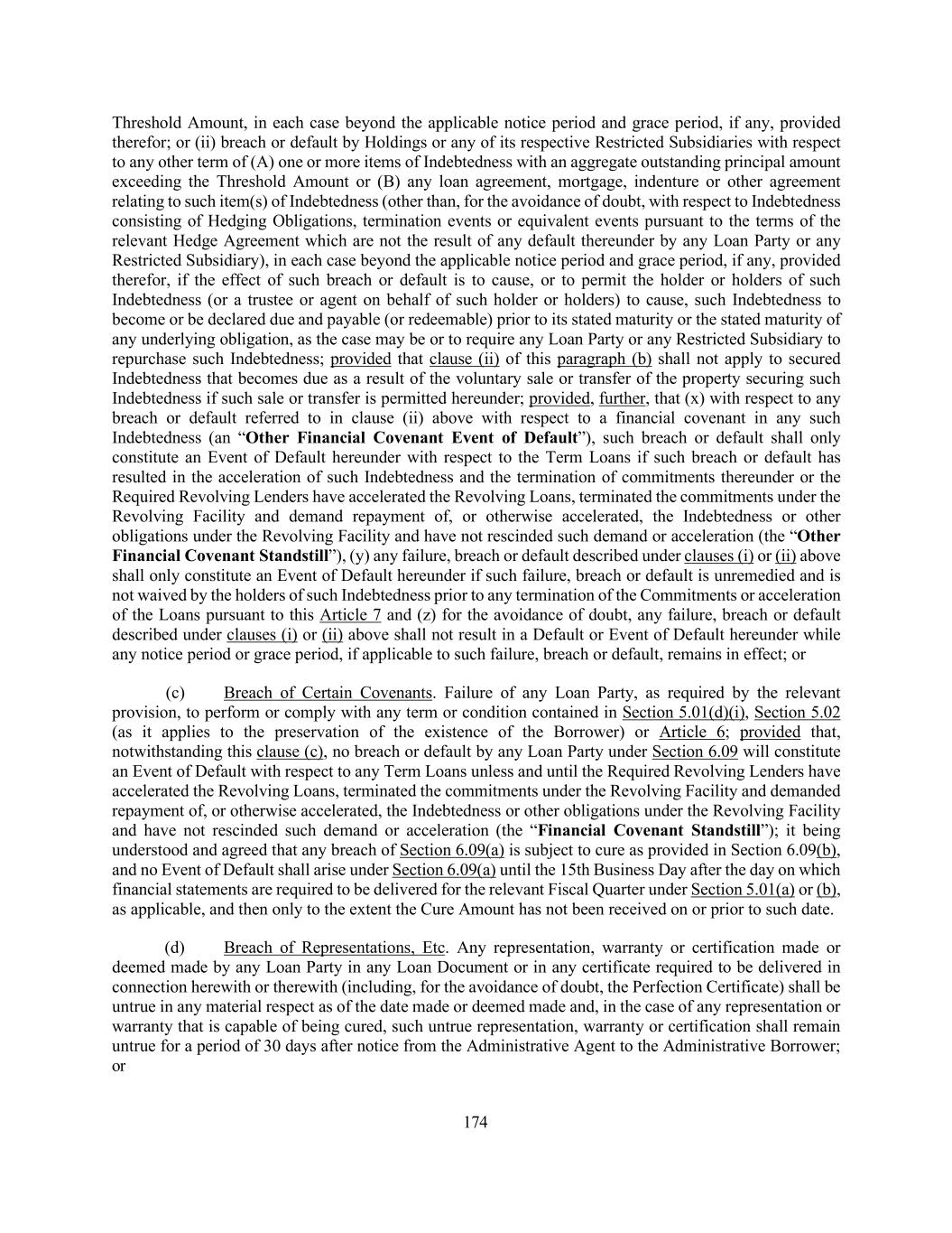 174 Threshold Amount, in each case beyond the applicable notice period and grace period, if any, provided therefor; or (ii) breach or default by Holdings or any of its respective Restricted Subsidiaries with respect to any other term of (A) one or more items of Indebtedness with an aggregate outstanding principal amount exceeding the Threshold Amount or (B) any loan agreement, mortgage, indenture or other agreement relating to such item(s) of Indebtedness (other than, for the avoidance of doubt, with respect to Indebtedness consisting of Hedging Obligations, termination events or equivalent events pursuant to the terms of the relevant Hedge Agreement which are not the result of any default thereunder by any Loan Party or any Restricted Subsidiary), in each case beyond the applicable notice period and grace period, if any, provided therefor, if the effect of such breach or default is to cause, or to permit the holder or holders of such Indebtedness (or a trustee or agent on behalf of such holder or holders) to cause, such Indebtedness to become or be declared due and payable (or redeemable) prior to its stated maturity or the stated maturity of any underlying obligation, as the case may be or to require any Loan Party or any Restricted Subsidiary to repurchase such Indebtedness; provided that clause (ii) of this paragraph (b) shall not apply to secured Indebtedness that becomes due as a result of the voluntary sale or transfer of the property securing such Indebtedness if such sale or transfer is permitted hereunder; provided, further, that (x) with respect to any breach or default referred to in clause (ii) above with respect to a financial covenant in any such Indebtedness (an “Other Financial Covenant Event of Default”), such breach or default shall only constitute an Event of Default hereunder with respect to the Term Loans if such breach or default has resulted in the acceleration of such Indebtedness and the termination of commitments thereunder or the Required Revolving Lenders have accelerated the Revolving Loans, terminated the commitments under the Revolving Facility and demand repayment of, or otherwise accelerated, the Indebtedness or other obligations under the Revolving Facility and have not rescinded such demand or acceleration (the “Other Financial Covenant Standstill”), (y) any failure, breach or default described under clauses (i) or (ii) above shall only constitute an Event of Default hereunder if such failure, breach or default is unremedied and is not waived by the holders of such Indebtedness prior to any termination of the Commitments or acceleration of the Loans pursuant to this Article 7 and (z) for the avoidance of doubt, any failure, breach or default described under clauses (i) or (ii) above shall not result in a Default or Event of Default hereunder while any notice period or grace period, if applicable to such failure, breach or default, remains in effect; or (c) Breach of Certain Covenants. Failure of any Loan Party, as required by the relevant provision, to perform or comply with any term or condition contained in Section 5.01(d)(i), Section 5.02 (as it applies to the preservation of the existence of the Borrower) or Article 6; provided that, notwithstanding this clause (c), no breach or default by any Loan Party under Section 6.09 will constitute an Event of Default with respect to any Term Loans unless and until the Required Revolving Lenders have accelerated the Revolving Loans, terminated the commitments under the Revolving Facility and demanded repayment of, or otherwise accelerated, the Indebtedness or other obligations under the Revolving Facility and have not rescinded such demand or acceleration (the “Financial Covenant Standstill”); it being understood and agreed that any breach of Section 6.09(a) is subject to cure as provided in Section 6.09(b), and no Event of Default shall arise under Section 6.09(a) until the 15th Business Day after the day on which financial statements are required to be delivered for the relevant Fiscal Quarter under Section 5.01(a) or (b), as applicable, and then only to the extent the Cure Amount has not been received on or prior to such date. (d) Breach of Representations, Etc. Any representation, warranty or certification made or deemed made by any Loan Party in any Loan Document or in any certificate required to be delivered in connection herewith or therewith (including, for the avoidance of doubt, the Perfection Certificate) shall be untrue in any material respect as of the date made or deemed made and, in the case of any representation or warranty that is capable of being cured, such untrue representation, warranty or certification shall remain untrue for a period of 30 days after notice from the Administrative Agent to the Administrative Borrower; or
