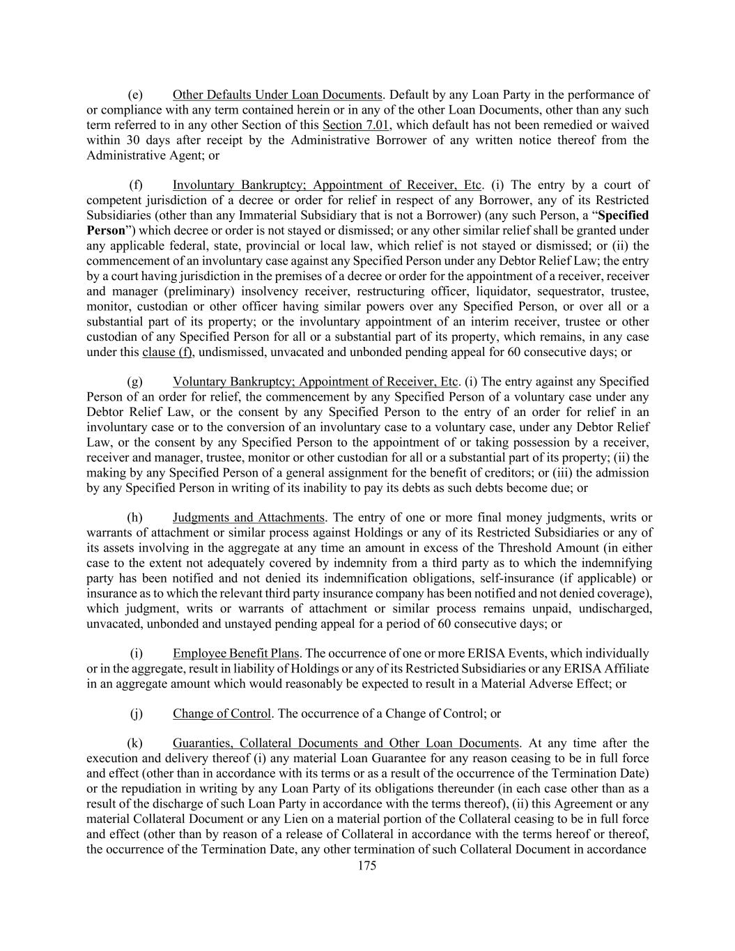 175 (e) Other Defaults Under Loan Documents. Default by any Loan Party in the performance of or compliance with any term contained herein or in any of the other Loan Documents, other than any such term referred to in any other Section of this Section 7.01, which default has not been remedied or waived within 30 days after receipt by the Administrative Borrower of any written notice thereof from the Administrative Agent; or (f) Involuntary Bankruptcy; Appointment of Receiver, Etc. (i) The entry by a court of competent jurisdiction of a decree or order for relief in respect of any Borrower, any of its Restricted Subsidiaries (other than any Immaterial Subsidiary that is not a Borrower) (any such Person, a “Specified Person”) which decree or order is not stayed or dismissed; or any other similar relief shall be granted under any applicable federal, state, provincial or local law, which relief is not stayed or dismissed; or (ii) the commencement of an involuntary case against any Specified Person under any Debtor Relief Law; the entry by a court having jurisdiction in the premises of a decree or order for the appointment of a receiver, receiver and manager (preliminary) insolvency receiver, restructuring officer, liquidator, sequestrator, trustee, monitor, custodian or other officer having similar powers over any Specified Person, or over all or a substantial part of its property; or the involuntary appointment of an interim receiver, trustee or other custodian of any Specified Person for all or a substantial part of its property, which remains, in any case under this clause (f), undismissed, unvacated and unbonded pending appeal for 60 consecutive days; or (g) Voluntary Bankruptcy; Appointment of Receiver, Etc. (i) The entry against any Specified Person of an order for relief, the commencement by any Specified Person of a voluntary case under any Debtor Relief Law, or the consent by any Specified Person to the entry of an order for relief in an involuntary case or to the conversion of an involuntary case to a voluntary case, under any Debtor Relief Law, or the consent by any Specified Person to the appointment of or taking possession by a receiver, receiver and manager, trustee, monitor or other custodian for all or a substantial part of its property; (ii) the making by any Specified Person of a general assignment for the benefit of creditors; or (iii) the admission by any Specified Person in writing of its inability to pay its debts as such debts become due; or (h) Judgments and Attachments. The entry of one or more final money judgments, writs or warrants of attachment or similar process against Holdings or any of its Restricted Subsidiaries or any of its assets involving in the aggregate at any time an amount in excess of the Threshold Amount (in either case to the extent not adequately covered by indemnity from a third party as to which the indemnifying party has been notified and not denied its indemnification obligations, self-insurance (if applicable) or insurance as to which the relevant third party insurance company has been notified and not denied coverage), which judgment, writs or warrants of attachment or similar process remains unpaid, undischarged, unvacated, unbonded and unstayed pending appeal for a period of 60 consecutive days; or (i) Employee Benefit Plans. The occurrence of one or more ERISA Events, which individually or in the aggregate, result in liability of Holdings or any of its Restricted Subsidiaries or any ERISA Affiliate in an aggregate amount which would reasonably be expected to result in a Material Adverse Effect; or (j) Change of Control. The occurrence of a Change of Control; or (k) Guaranties, Collateral Documents and Other Loan Documents. At any time after the execution and delivery thereof (i) any material Loan Guarantee for any reason ceasing to be in full force and effect (other than in accordance with its terms or as a result of the occurrence of the Termination Date) or the repudiation in writing by any Loan Party of its obligations thereunder (in each case other than as a result of the discharge of such Loan Party in accordance with the terms thereof), (ii) this Agreement or any material Collateral Document or any Lien on a material portion of the Collateral ceasing to be in full force and effect (other than by reason of a release of Collateral in accordance with the terms hereof or thereof, the occurrence of the Termination Date, any other termination of such Collateral Document in accordance