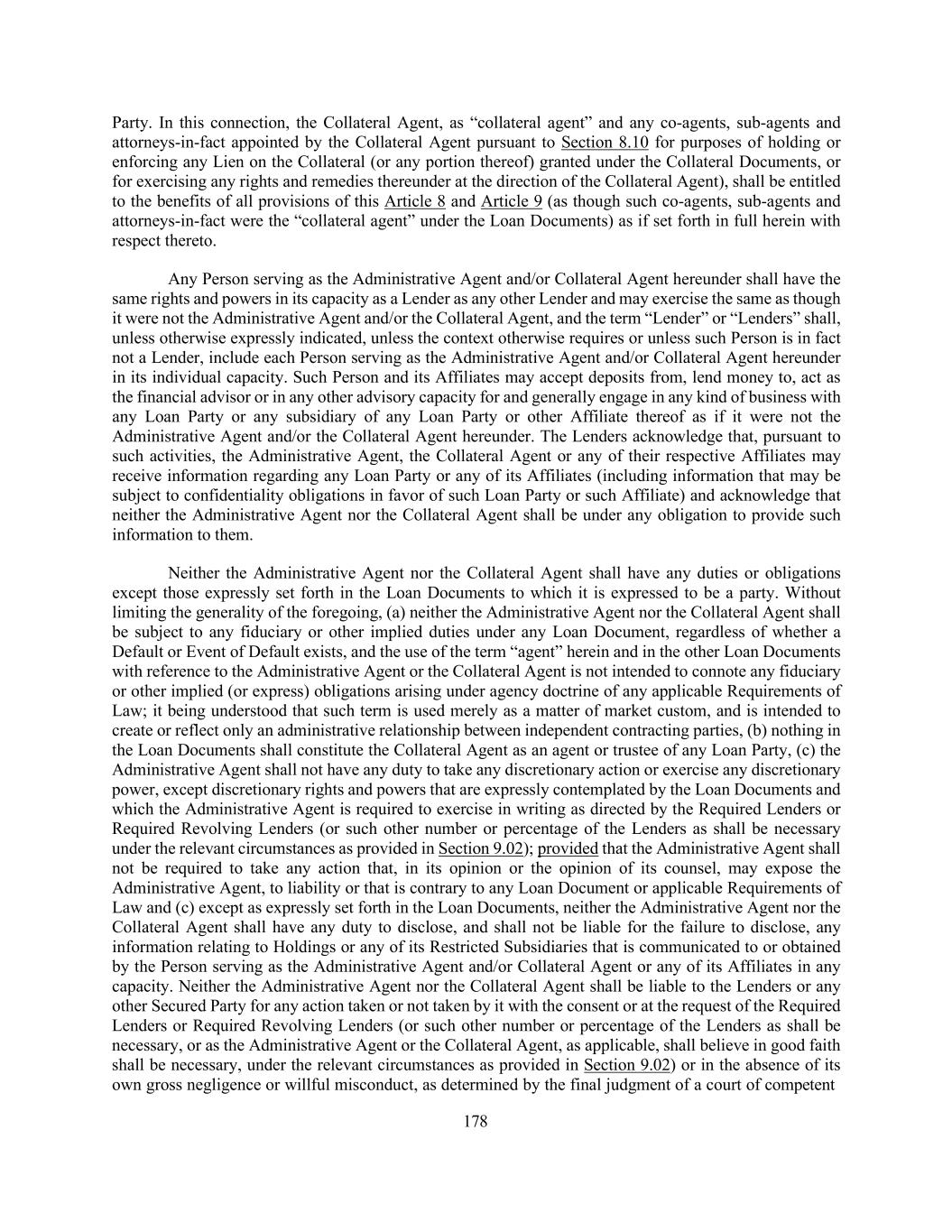 178 Party. In this connection, the Collateral Agent, as “collateral agent” and any co-agents, sub-agents and attorneys-in-fact appointed by the Collateral Agent pursuant to Section 8.10 for purposes of holding or enforcing any Lien on the Collateral (or any portion thereof) granted under the Collateral Documents, or for exercising any rights and remedies thereunder at the direction of the Collateral Agent), shall be entitled to the benefits of all provisions of this Article 8 and Article 9 (as though such co-agents, sub-agents and attorneys-in-fact were the “collateral agent” under the Loan Documents) as if set forth in full herein with respect thereto. Any Person serving as the Administrative Agent and/or Collateral Agent hereunder shall have the same rights and powers in its capacity as a Lender as any other Lender and may exercise the same as though it were not the Administrative Agent and/or the Collateral Agent, and the term “Lender” or “Lenders” shall, unless otherwise expressly indicated, unless the context otherwise requires or unless such Person is in fact not a Lender, include each Person serving as the Administrative Agent and/or Collateral Agent hereunder in its individual capacity. Such Person and its Affiliates may accept deposits from, lend money to, act as the financial advisor or in any other advisory capacity for and generally engage in any kind of business with any Loan Party or any subsidiary of any Loan Party or other Affiliate thereof as if it were not the Administrative Agent and/or the Collateral Agent hereunder. The Lenders acknowledge that, pursuant to such activities, the Administrative Agent, the Collateral Agent or any of their respective Affiliates may receive information regarding any Loan Party or any of its Affiliates (including information that may be subject to confidentiality obligations in favor of such Loan Party or such Affiliate) and acknowledge that neither the Administrative Agent nor the Collateral Agent shall be under any obligation to provide such information to them. Neither the Administrative Agent nor the Collateral Agent shall have any duties or obligations except those expressly set forth in the Loan Documents to which it is expressed to be a party. Without limiting the generality of the foregoing, (a) neither the Administrative Agent nor the Collateral Agent shall be subject to any fiduciary or other implied duties under any Loan Document, regardless of whether a Default or Event of Default exists, and the use of the term “agent” herein and in the other Loan Documents with reference to the Administrative Agent or the Collateral Agent is not intended to connote any fiduciary or other implied (or express) obligations arising under agency doctrine of any applicable Requirements of Law; it being understood that such term is used merely as a matter of market custom, and is intended to create or reflect only an administrative relationship between independent contracting parties, (b) nothing in the Loan Documents shall constitute the Collateral Agent as an agent or trustee of any Loan Party, (c) the Administrative Agent shall not have any duty to take any discretionary action or exercise any discretionary power, except discretionary rights and powers that are expressly contemplated by the Loan Documents and which the Administrative Agent is required to exercise in writing as directed by the Required Lenders or Required Revolving Lenders (or such other number or percentage of the Lenders as shall be necessary under the relevant circumstances as provided in Section 9.02); provided that the Administrative Agent shall not be required to take any action that, in its opinion or the opinion of its counsel, may expose the Administrative Agent, to liability or that is contrary to any Loan Document or applicable Requirements of Law and (c) except as expressly set forth in the Loan Documents, neither the Administrative Agent nor the Collateral Agent shall have any duty to disclose, and shall not be liable for the failure to disclose, any information relating to Holdings or any of its Restricted Subsidiaries that is communicated to or obtained by the Person serving as the Administrative Agent and/or Collateral Agent or any of its Affiliates in any capacity. Neither the Administrative Agent nor the Collateral Agent shall be liable to the Lenders or any other Secured Party for any action taken or not taken by it with the consent or at the request of the Required Lenders or Required Revolving Lenders (or such other number or percentage of the Lenders as shall be necessary, or as the Administrative Agent or the Collateral Agent, as applicable, shall believe in good faith shall be necessary, under the relevant circumstances as provided in Section 9.02) or in the absence of its own gross negligence or willful misconduct, as determined by the final judgment of a court of competent