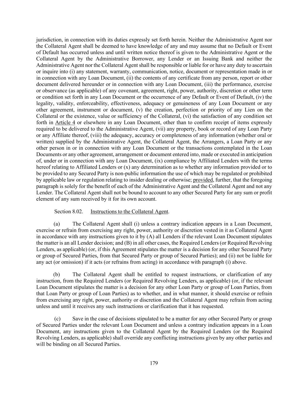 179 jurisdiction, in connection with its duties expressly set forth herein. Neither the Administrative Agent nor the Collateral Agent shall be deemed to have knowledge of any and may assume that no Default or Event of Default has occurred unless and until written notice thereof is given to the Administrative Agent or the Collateral Agent by the Administrative Borrower, any Lender or an Issuing Bank and neither the Administrative Agent nor the Collateral Agent shall be responsible or liable for or have any duty to ascertain or inquire into (i) any statement, warranty, communication, notice, document or representation made in or in connection with any Loan Document, (ii) the contents of any certificate from any person, report or other document delivered hereunder or in connection with any Loan Document, (iii) the performance, exercise or observance (as applicable) of any covenant, agreement, right, power, authority, discretion or other term or condition set forth in any Loan Document or the occurrence of any Default or Event of Default, (iv) the legality, validity, enforceability, effectiveness, adequacy or genuineness of any Loan Document or any other agreement, instrument or document, (v) the creation, perfection or priority of any Lien on the Collateral or the existence, value or sufficiency of the Collateral, (vi) the satisfaction of any condition set forth in Article 4 or elsewhere in any Loan Document, other than to confirm receipt of items expressly required to be delivered to the Administrative Agent, (vii) any property, book or record of any Loan Party or any Affiliate thereof, (viii) the adequacy, accuracy or completeness of any information (whether oral or written) supplied by the Administrative Agent, the Collateral Agent, the Arrangers, a Loan Party or any other person in or in connection with any Loan Document or the transactions contemplated in the Loan Documents or any other agreement, arrangement or document entered into, made or executed in anticipation of, under or in connection with any Loan Document, (ix) compliance by Affiliated Lenders with the terms hereof relating to Affiliated Lenders or (x) any determination as to whether any information provided or to be provided to any Secured Party is non-public information the use of which may be regulated or prohibited by applicable law or regulation relating to insider dealing or otherwise; provided, further, that the foregoing paragraph is solely for the benefit of each of the Administrative Agent and the Collateral Agent and not any Lender. The Collateral Agent shall not be bound to account to any other Secured Party for any sum or profit element of any sum received by it for its own account. Section 8.02. Instructions to the Collateral Agent. (a) The Collateral Agent shall (i) unless a contrary indication appears in a Loan Document, exercise or refrain from exercising any right, power, authority or discretion vested in it as Collateral Agent in accordance with any instructions given to it by (A) all Lenders if the relevant Loan Document stipulates the matter is an all Lender decision; and (B) in all other cases, the Required Lenders (or Required Revolving Lenders, as applicable) (or, if this Agreement stipulates the matter is a decision for any other Secured Party or group of Secured Parties, from that Secured Party or group of Secured Parties); and (ii) not be liable for any act (or omission) if it acts (or refrains from acting) in accordance with paragraph (i) above. (b) The Collateral Agent shall be entitled to request instructions, or clarification of any instruction, from the Required Lenders (or Required Revolving Lenders, as applicable) (or, if the relevant Loan Document stipulates the matter is a decision for any other Loan Party or group of Loan Parties, from that Loan Party or group of Loan Parties) as to whether, and in what manner, it should exercise or refrain from exercising any right, power, authority or discretion and the Collateral Agent may refrain from acting unless and until it receives any such instructions or clarification that it has requested. (c) Save in the case of decisions stipulated to be a matter for any other Secured Party or group of Secured Parties under the relevant Loan Document and unless a contrary indication appears in a Loan Document, any instructions given to the Collateral Agent by the Required Lenders (or the Required Revolving Lenders, as applicable) shall override any conflicting instructions given by any other parties and will be binding on all Secured Parties.