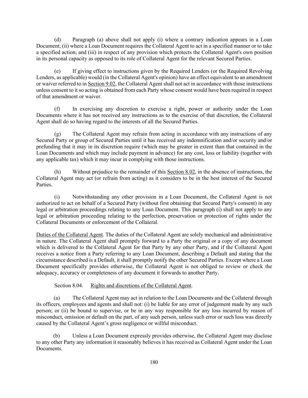 180 (d) Paragraph (a) above shall not apply (i) where a contrary indication appears in a Loan Document; (ii) where a Loan Document requires the Collateral Agent to act in a specified manner or to take a specified action; and (iii) in respect of any provision which protects the Collateral Agent's own position in its personal capacity as opposed to its role of Collateral Agent for the relevant Secured Parties. (e) If giving effect to instructions given by the Required Lenders (or the Required Revolving Lenders, as applicable) would (in the Collateral Agent's opinion) have an effect equivalent to an amendment or waiver referred to in Section 9.02, the Collateral Agent shall not act in accordance with those instructions unless consent to it so acting is obtained from each Party whose consent would have been required in respect of that amendment or waiver. (f) In exercising any discretion to exercise a right, power or authority under the Loan Documents where it has not received any instructions as to the exercise of that discretion, the Collateral Agent shall do so having regard to the interests of all the Secured Parties. (g) The Collateral Agent may refrain from acting in accordance with any instructions of any Secured Party or group of Secured Parties until it has received any indemnification and/or security and/or prefunding that it may in its discretion require (which may be greater in extent than that contained in the Loan Documents and which may include payment in advance) for any cost, loss or liability (together with any applicable tax) which it may incur in complying with those instructions. (h) Without prejudice to the remainder of this Section 8.02, in the absence of instructions, the Collateral Agent may act (or refrain from acting) as it considers to be in the best interest of the Secured Parties. (i) Notwithstanding any other provision in a Loan Document, the Collateral Agent is not authorized to act on behalf of a Secured Party (without first obtaining that Secured Party's consent) in any legal or arbitration proceedings relating to any Loan Document. This paragraph (i) shall not apply to any legal or arbitration proceeding relating to the perfection, preservation or protection of rights under the Collateral Documents or enforcement of the Collateral. Duties of the Collateral Agent. The duties of the Collateral Agent are solely mechanical and administrative in nature. The Collateral Agent shall promptly forward to a Party the original or a copy of any document which is delivered to the Collateral Agent for that Party by any other Party, and if the Collateral Agent receives a notice from a Party referring to any Loan Document, describing a Default and stating that the circumstance described is a Default, it shall promptly notify the other Secured Parties. Except where a Loan Document specifically provides otherwise, the Collateral Agent is not obliged to review or check the adequacy, accuracy or completeness of any document it forwards to another Party. Section 8.04. Rights and discretions of the Collateral Agent. (a) The Collateral Agent may act in relation to the Loan Documents and the Collateral through its officers, employees and agents and shall not: (i) be liable for any error of judgement made by any such person; or (ii) be bound to supervise, or be in any way responsible for any loss incurred by reason of misconduct, omission or default on the part, of any such person, unless such error or such loss was directly caused by the Collateral Agent’s gross negligence or willful misconduct. (b) Unless a Loan Document expressly provides otherwise, the Collateral Agent may disclose to any other Party any information it reasonably believes it has received as Collateral Agent under the Loan Documents.