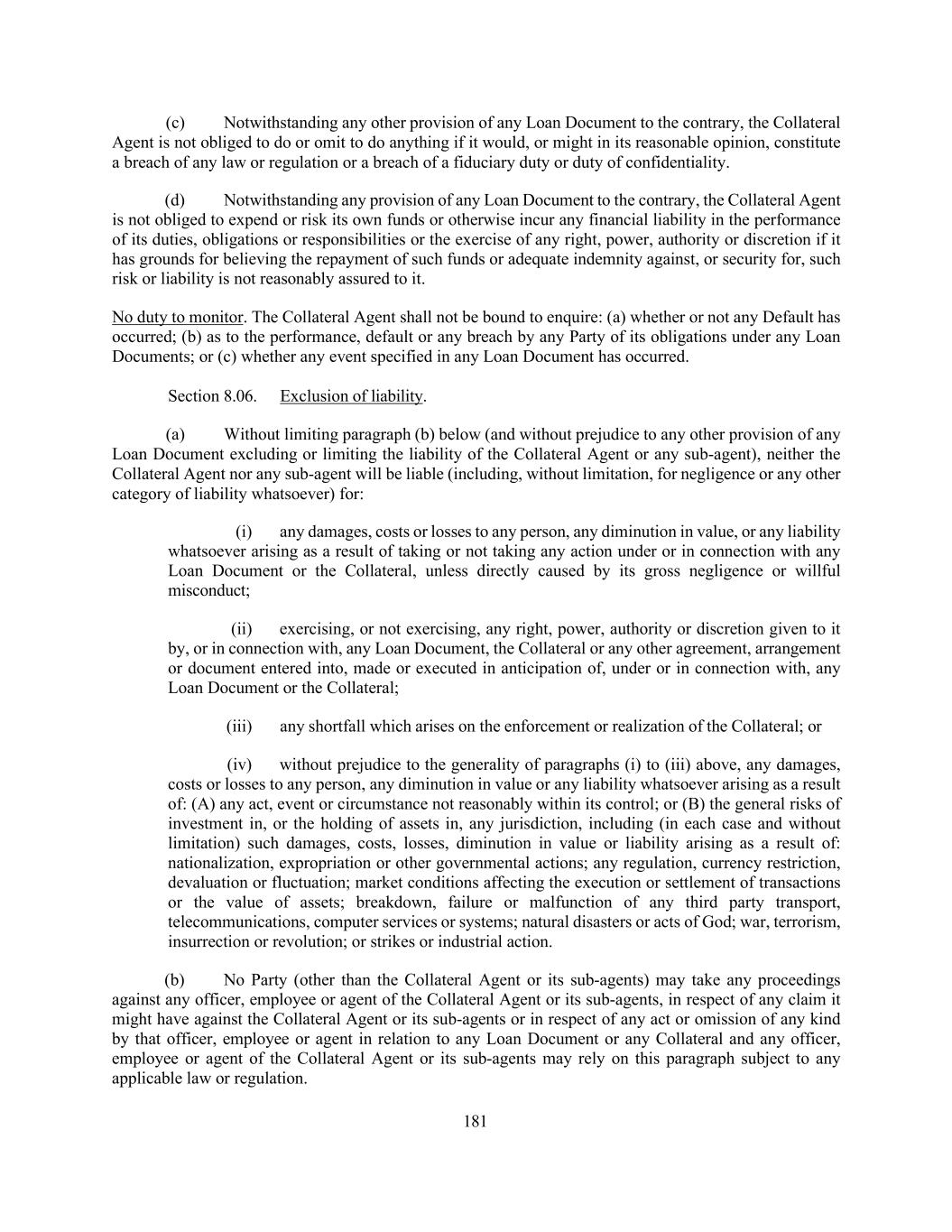 181 (c) Notwithstanding any other provision of any Loan Document to the contrary, the Collateral Agent is not obliged to do or omit to do anything if it would, or might in its reasonable opinion, constitute a breach of any law or regulation or a breach of a fiduciary duty or duty of confidentiality. (d) Notwithstanding any provision of any Loan Document to the contrary, the Collateral Agent is not obliged to expend or risk its own funds or otherwise incur any financial liability in the performance of its duties, obligations or responsibilities or the exercise of any right, power, authority or discretion if it has grounds for believing the repayment of such funds or adequate indemnity against, or security for, such risk or liability is not reasonably assured to it. No duty to monitor. The Collateral Agent shall not be bound to enquire: (a) whether or not any Default has occurred; (b) as to the performance, default or any breach by any Party of its obligations under any Loan Documents; or (c) whether any event specified in any Loan Document has occurred. Section 8.06. Exclusion of liability. (a) Without limiting paragraph (b) below (and without prejudice to any other provision of any Loan Document excluding or limiting the liability of the Collateral Agent or any sub-agent), neither the Collateral Agent nor any sub-agent will be liable (including, without limitation, for negligence or any other category of liability whatsoever) for: (i) any damages, costs or losses to any person, any diminution in value, or any liability whatsoever arising as a result of taking or not taking any action under or in connection with any Loan Document or the Collateral, unless directly caused by its gross negligence or willful misconduct; (ii) exercising, or not exercising, any right, power, authority or discretion given to it by, or in connection with, any Loan Document, the Collateral or any other agreement, arrangement or document entered into, made or executed in anticipation of, under or in connection with, any Loan Document or the Collateral; (iii) any shortfall which arises on the enforcement or realization of the Collateral; or (iv) without prejudice to the generality of paragraphs (i) to (iii) above, any damages, costs or losses to any person, any diminution in value or any liability whatsoever arising as a result of: (A) any act, event or circumstance not reasonably within its control; or (B) the general risks of investment in, or the holding of assets in, any jurisdiction, including (in each case and without limitation) such damages, costs, losses, diminution in value or liability arising as a result of: nationalization, expropriation or other governmental actions; any regulation, currency restriction, devaluation or fluctuation; market conditions affecting the execution or settlement of transactions or the value of assets; breakdown, failure or malfunction of any third party transport, telecommunications, computer services or systems; natural disasters or acts of God; war, terrorism, insurrection or revolution; or strikes or industrial action. (b) No Party (other than the Collateral Agent or its sub-agents) may take any proceedings against any officer, employee or agent of the Collateral Agent or its sub-agents, in respect of any claim it might have against the Collateral Agent or its sub-agents or in respect of any act or omission of any kind by that officer, employee or agent in relation to any Loan Document or any Collateral and any officer, employee or agent of the Collateral Agent or its sub-agents may rely on this paragraph subject to any applicable law or regulation.