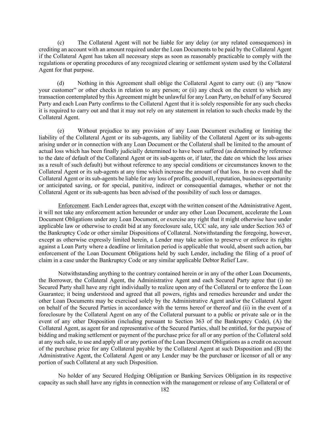 182 (c) The Collateral Agent will not be liable for any delay (or any related consequences) in crediting an account with an amount required under the Loan Documents to be paid by the Collateral Agent if the Collateral Agent has taken all necessary steps as soon as reasonably practicable to comply with the regulations or operating procedures of any recognized clearing or settlement system used by the Collateral Agent for that purpose. (d) Nothing in this Agreement shall oblige the Collateral Agent to carry out: (i) any “know your customer” or other checks in relation to any person; or (ii) any check on the extent to which any transaction contemplated by this Agreement might be unlawful for any Loan Party, on behalf of any Secured Party and each Loan Party confirms to the Collateral Agent that it is solely responsible for any such checks it is required to carry out and that it may not rely on any statement in relation to such checks made by the Collateral Agent. (e) Without prejudice to any provision of any Loan Document excluding or limiting the liability of the Collateral Agent or its sub-agents, any liability of the Collateral Agent or its sub-agents arising under or in connection with any Loan Document or the Collateral shall be limited to the amount of actual loss which has been finally judicially determined to have been suffered (as determined by reference to the date of default of the Collateral Agent or its sub-agents or, if later, the date on which the loss arises as a result of such default) but without reference to any special conditions or circumstances known to the Collateral Agent or its sub-agents at any time which increase the amount of that loss. In no event shall the Collateral Agent or its sub-agents be liable for any loss of profits, goodwill, reputation, business opportunity or anticipated saving, or for special, punitive, indirect or consequential damages, whether or not the Collateral Agent or its sub-agents has been advised of the possibility of such loss or damages. Enforcement. Each Lender agrees that, except with the written consent of the Administrative Agent, it will not take any enforcement action hereunder or under any other Loan Document, accelerate the Loan Document Obligations under any Loan Document, or exercise any right that it might otherwise have under applicable law or otherwise to credit bid at any foreclosure sale, UCC sale, any sale under Section 363 of the Bankruptcy Code or other similar Dispositions of Collateral. Notwithstanding the foregoing, however, except as otherwise expressly limited herein, a Lender may take action to preserve or enforce its rights against a Loan Party where a deadline or limitation period is applicable that would, absent such action, bar enforcement of the Loan Document Obligations held by such Lender, including the filing of a proof of claim in a case under the Bankruptcy Code or any similar applicable Debtor Relief Law. Notwithstanding anything to the contrary contained herein or in any of the other Loan Documents, the Borrower, the Collateral Agent, the Administrative Agent and each Secured Party agree that (i) no Secured Party shall have any right individually to realize upon any of the Collateral or to enforce the Loan Guarantee; it being understood and agreed that all powers, rights and remedies hereunder and under the other Loan Documents may be exercised solely by the Administrative Agent and/or the Collateral Agent on behalf of the Secured Parties in accordance with the terms hereof or thereof and (ii) in the event of a foreclosure by the Collateral Agent on any of the Collateral pursuant to a public or private sale or in the event of any other Disposition (including pursuant to Section 363 of the Bankruptcy Code), (A) the Collateral Agent, as agent for and representative of the Secured Parties, shall be entitled, for the purpose of bidding and making settlement or payment of the purchase price for all or any portion of the Collateral sold at any such sale, to use and apply all or any portion of the Loan Document Obligations as a credit on account of the purchase price for any Collateral payable by the Collateral Agent at such Disposition and (B) the Administrative Agent, the Collateral Agent or any Lender may be the purchaser or licensor of all or any portion of such Collateral at any such Disposition. No holder of any Secured Hedging Obligation or Banking Services Obligation in its respective capacity as such shall have any rights in connection with the management or release of any Collateral or of