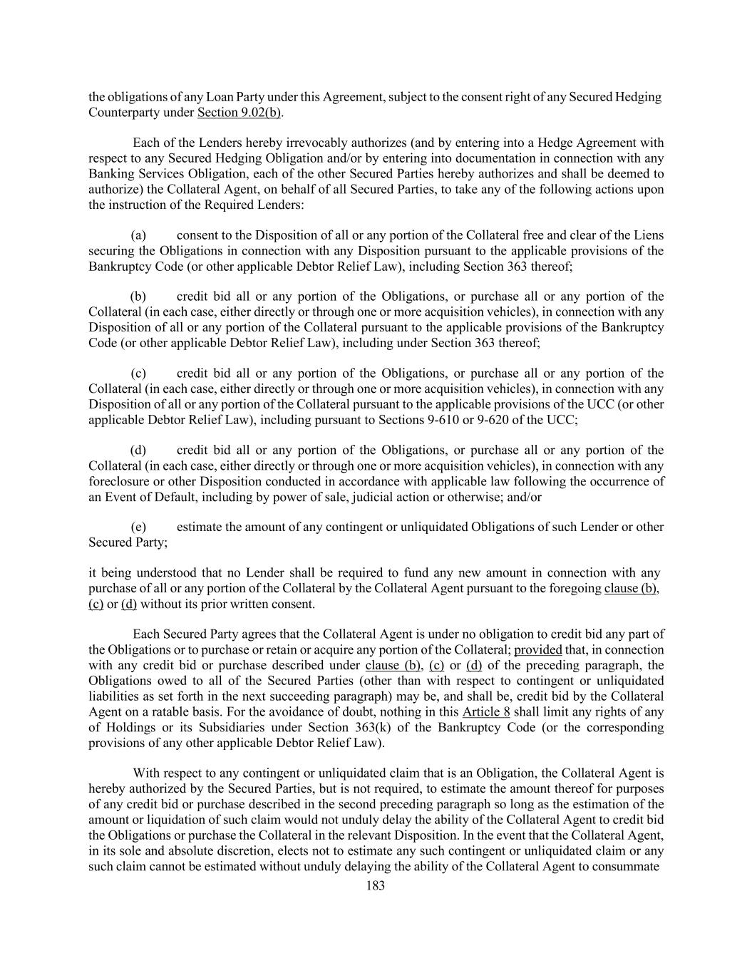 183 the obligations of any Loan Party under this Agreement, subject to the consent right of any Secured Hedging Counterparty under Section 9.02(b). Each of the Lenders hereby irrevocably authorizes (and by entering into a Hedge Agreement with respect to any Secured Hedging Obligation and/or by entering into documentation in connection with any Banking Services Obligation, each of the other Secured Parties hereby authorizes and shall be deemed to authorize) the Collateral Agent, on behalf of all Secured Parties, to take any of the following actions upon the instruction of the Required Lenders: (a) consent to the Disposition of all or any portion of the Collateral free and clear of the Liens securing the Obligations in connection with any Disposition pursuant to the applicable provisions of the Bankruptcy Code (or other applicable Debtor Relief Law), including Section 363 thereof; (b) credit bid all or any portion of the Obligations, or purchase all or any portion of the Collateral (in each case, either directly or through one or more acquisition vehicles), in connection with any Disposition of all or any portion of the Collateral pursuant to the applicable provisions of the Bankruptcy Code (or other applicable Debtor Relief Law), including under Section 363 thereof; (c) credit bid all or any portion of the Obligations, or purchase all or any portion of the Collateral (in each case, either directly or through one or more acquisition vehicles), in connection with any Disposition of all or any portion of the Collateral pursuant to the applicable provisions of the UCC (or other applicable Debtor Relief Law), including pursuant to Sections 9-610 or 9-620 of the UCC; (d) credit bid all or any portion of the Obligations, or purchase all or any portion of the Collateral (in each case, either directly or through one or more acquisition vehicles), in connection with any foreclosure or other Disposition conducted in accordance with applicable law following the occurrence of an Event of Default, including by power of sale, judicial action or otherwise; and/or (e) estimate the amount of any contingent or unliquidated Obligations of such Lender or other Secured Party; it being understood that no Lender shall be required to fund any new amount in connection with any purchase of all or any portion of the Collateral by the Collateral Agent pursuant to the foregoing clause (b), (c) or (d) without its prior written consent. Each Secured Party agrees that the Collateral Agent is under no obligation to credit bid any part of the Obligations or to purchase or retain or acquire any portion of the Collateral; provided that, in connection with any credit bid or purchase described under clause (b), (c) or (d) of the preceding paragraph, the Obligations owed to all of the Secured Parties (other than with respect to contingent or unliquidated liabilities as set forth in the next succeeding paragraph) may be, and shall be, credit bid by the Collateral Agent on a ratable basis. For the avoidance of doubt, nothing in this Article 8 shall limit any rights of any of Holdings or its Subsidiaries under Section 363(k) of the Bankruptcy Code (or the corresponding provisions of any other applicable Debtor Relief Law). With respect to any contingent or unliquidated claim that is an Obligation, the Collateral Agent is hereby authorized by the Secured Parties, but is not required, to estimate the amount thereof for purposes of any credit bid or purchase described in the second preceding paragraph so long as the estimation of the amount or liquidation of such claim would not unduly delay the ability of the Collateral Agent to credit bid the Obligations or purchase the Collateral in the relevant Disposition. In the event that the Collateral Agent, in its sole and absolute discretion, elects not to estimate any such contingent or unliquidated claim or any such claim cannot be estimated without unduly delaying the ability of the Collateral Agent to consummate