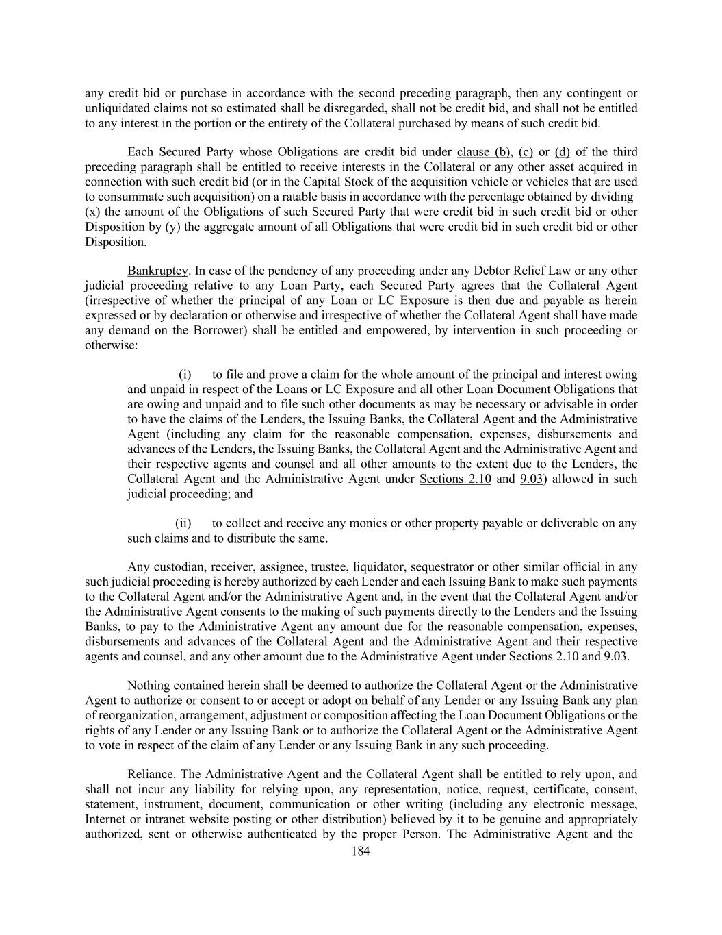 184 any credit bid or purchase in accordance with the second preceding paragraph, then any contingent or unliquidated claims not so estimated shall be disregarded, shall not be credit bid, and shall not be entitled to any interest in the portion or the entirety of the Collateral purchased by means of such credit bid. Each Secured Party whose Obligations are credit bid under clause (b), (c) or (d) of the third preceding paragraph shall be entitled to receive interests in the Collateral or any other asset acquired in connection with such credit bid (or in the Capital Stock of the acquisition vehicle or vehicles that are used to consummate such acquisition) on a ratable basis in accordance with the percentage obtained by dividing (x) the amount of the Obligations of such Secured Party that were credit bid in such credit bid or other Disposition by (y) the aggregate amount of all Obligations that were credit bid in such credit bid or other Disposition. Bankruptcy. In case of the pendency of any proceeding under any Debtor Relief Law or any other judicial proceeding relative to any Loan Party, each Secured Party agrees that the Collateral Agent (irrespective of whether the principal of any Loan or LC Exposure is then due and payable as herein expressed or by declaration or otherwise and irrespective of whether the Collateral Agent shall have made any demand on the Borrower) shall be entitled and empowered, by intervention in such proceeding or otherwise: (i) to file and prove a claim for the whole amount of the principal and interest owing and unpaid in respect of the Loans or LC Exposure and all other Loan Document Obligations that are owing and unpaid and to file such other documents as may be necessary or advisable in order to have the claims of the Lenders, the Issuing Banks, the Collateral Agent and the Administrative Agent (including any claim for the reasonable compensation, expenses, disbursements and advances of the Lenders, the Issuing Banks, the Collateral Agent and the Administrative Agent and their respective agents and counsel and all other amounts to the extent due to the Lenders, the Collateral Agent and the Administrative Agent under Sections 2.10 and 9.03) allowed in such judicial proceeding; and (ii) to collect and receive any monies or other property payable or deliverable on any such claims and to distribute the same. Any custodian, receiver, assignee, trustee, liquidator, sequestrator or other similar official in any such judicial proceeding is hereby authorized by each Lender and each Issuing Bank to make such payments to the Collateral Agent and/or the Administrative Agent and, in the event that the Collateral Agent and/or the Administrative Agent consents to the making of such payments directly to the Lenders and the Issuing Banks, to pay to the Administrative Agent any amount due for the reasonable compensation, expenses, disbursements and advances of the Collateral Agent and the Administrative Agent and their respective agents and counsel, and any other amount due to the Administrative Agent under Sections 2.10 and 9.03. Nothing contained herein shall be deemed to authorize the Collateral Agent or the Administrative Agent to authorize or consent to or accept or adopt on behalf of any Lender or any Issuing Bank any plan of reorganization, arrangement, adjustment or composition affecting the Loan Document Obligations or the rights of any Lender or any Issuing Bank or to authorize the Collateral Agent or the Administrative Agent to vote in respect of the claim of any Lender or any Issuing Bank in any such proceeding. Reliance. The Administrative Agent and the Collateral Agent shall be entitled to rely upon, and shall not incur any liability for relying upon, any representation, notice, request, certificate, consent, statement, instrument, document, communication or other writing (including any electronic message, Internet or intranet website posting or other distribution) believed by it to be genuine and appropriately authorized, sent or otherwise authenticated by the proper Person. The Administrative Agent and the