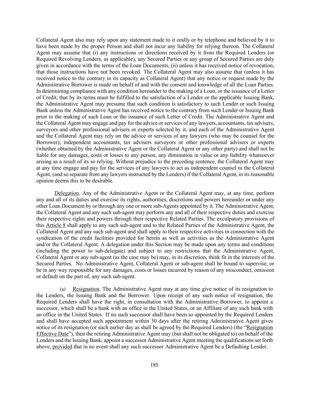185 Collateral Agent also may rely upon any statement made to it orally or by telephone and believed by it to have been made by the proper Person and shall not incur any liability for relying thereon. The Collateral Agent may assume that (i) any instructions or directions received by it from the Required Lenders (or Required Revolving Lenders, as applicable), any Secured Parties or any group of Secured Parties are duly given in accordance with the terms of the Loan Documents, (ii) unless it has received notice of revocation, that those instructions have not been revoked. The Collateral Agent may also assume that (unless it has received notice to the contrary in its capacity as Collateral Agent) that any notice or request made by the Administrative Borrower is made on behalf of and with the consent and knowledge of all the Loan Parties. In determining compliance with any condition hereunder to the making of a Loan, or the issuance of a Letter of Credit, that by its terms must be fulfilled to the satisfaction of a Lender or the applicable Issuing Bank, the Administrative Agent may presume that such condition is satisfactory to such Lender or such Issuing Bank unless the Administrative Agent has received notice to the contrary from such Lender or Issuing Bank prior to the making of such Loan or the issuance of such Letter of Credit. The Administrative Agent and the Collateral Agent may engage and pay for the advice or services of any lawyers, accountants, tax advisers, surveyors and other professional advisers or experts selected by it, and each of the Administrative Agent and the Collateral Agent may rely on the advice or services of any lawyers (who may be counsel for the Borrower), independent accountants, tax advisers surveyors or other professional advisers or experts (whether obtained by the Administrative Agent or the Collateral Agent or any other party) and shall not be liable for any damages, costs or losses to any person, any diminution in value or any liability whatsoever arising as a result of its so relying. Without prejudice to the preceding sentence, the Collateral Agent may at any time engage and pay for the services of any lawyers to act as independent counsel to the Collateral Agent, (and so separate from any lawyers instructed by the Lenders) if the Collateral Agent, in its reasonable opinion deems this to be desirable. Delegation. Any of the Administrative Agent or the Collateral Agent may, at any time, perform any and all of its duties and exercise its rights, authorities, discretions and powers hereunder or under any other Loan Document by or through any one or more sub-Agents appointed by it. The Administrative Agent, the Collateral Agent and any such sub-agent may perform any and all of their respective duties and exercise their respective rights and powers through their respective Related Parties. The exculpatory provisions of this Article 8 shall apply to any such sub-agent and to the Related Parties of the Administrative Agent, the Collateral Agent and any such sub-agent and shall apply to their respective activities in connection with the syndication of the credit facilities provided for herein as well as activities as the Administrative Agent and/or the Collateral Agent. A delegation under this Section may be made upon any terms and conditions (including the power to sub-delegate) and subject to any restrictions that the Administrative Agent, Collateral Agent or any sub-agent (as the case may be) may, in its discretion, think fit in the interests of the Secured Parties. No Administrative Agent, Collateral Agent or sub-agent shall be bound to supervise, or be in any way responsible for any damages, costs or losses incurred by reason of any misconduct, omission or default on the part of, any such sub-agent. (a) Resignation. The Administrative Agent may at any time give notice of its resignation to the Lenders, the Issuing Bank and the Borrower. Upon receipt of any such notice of resignation, the Required Lenders shall have the right, in consultation with the Administrative Borrower, to appoint a successor, which shall be a bank with an office in the United States, or an Affiliate of any such bank with an office in the United States. If no such successor shall have been so appointed by the Required Lenders and shall have accepted such appointment within 30 days after the retiring Administrative Agent gives notice of its resignation (or such earlier day as shall be agreed by the Required Lenders) (the “Resignation Effective Date”), then the retiring Administrative Agent may (but shall not be obligated to) on behalf of the Lenders and the Issuing Bank, appoint a successor Administrative Agent meeting the qualifications set forth above, provided that in no event shall any such successor Administrative Agent be a Defaulting Lender.