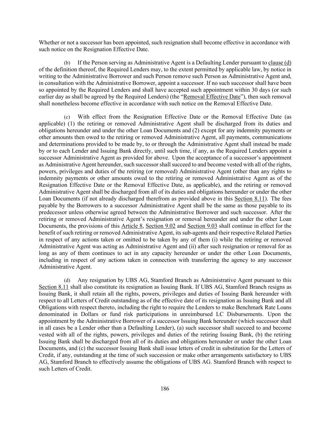 186 Whether or not a successor has been appointed, such resignation shall become effective in accordance with such notice on the Resignation Effective Date. (b) If the Person serving as Administrative Agent is a Defaulting Lender pursuant to clause (d) of the definition thereof, the Required Lenders may, to the extent permitted by applicable law, by notice in writing to the Administrative Borrower and such Person remove such Person as Administrative Agent and, in consultation with the Administrative Borrower, appoint a successor. If no such successor shall have been so appointed by the Required Lenders and shall have accepted such appointment within 30 days (or such earlier day as shall be agreed by the Required Lenders) (the “Removal Effective Date”), then such removal shall nonetheless become effective in accordance with such notice on the Removal Effective Date. (c) With effect from the Resignation Effective Date or the Removal Effective Date (as applicable) (1) the retiring or removed Administrative Agent shall be discharged from its duties and obligations hereunder and under the other Loan Documents and (2) except for any indemnity payments or other amounts then owed to the retiring or removed Administrative Agent, all payments, communications and determinations provided to be made by, to or through the Administrative Agent shall instead be made by or to each Lender and Issuing Bank directly, until such time, if any, as the Required Lenders appoint a successor Administrative Agent as provided for above. Upon the acceptance of a successor’s appointment as Administrative Agent hereunder, such successor shall succeed to and become vested with all of the rights, powers, privileges and duties of the retiring (or removed) Administrative Agent (other than any rights to indemnity payments or other amounts owed to the retiring or removed Administrative Agent as of the Resignation Effective Date or the Removal Effective Date, as applicable), and the retiring or removed Administrative Agent shall be discharged from all of its duties and obligations hereunder or under the other Loan Documents (if not already discharged therefrom as provided above in this Section 8.11). The fees payable by the Borrowers to a successor Administrative Agent shall be the same as those payable to its predecessor unless otherwise agreed between the Administrative Borrower and such successor. After the retiring or removed Administrative Agent’s resignation or removal hereunder and under the other Loan Documents, the provisions of this Article 8, Section 9.02 and Section 9.03 shall continue in effect for the benefit of such retiring or removed Administrative Agent, its sub-agents and their respective Related Parties in respect of any actions taken or omitted to be taken by any of them (i) while the retiring or removed Administrative Agent was acting as Administrative Agent and (ii) after such resignation or removal for as long as any of them continues to act in any capacity hereunder or under the other Loan Documents, including in respect of any actions taken in connection with transferring the agency to any successor Administrative Agent. (d) Any resignation by UBS AG, Stamford Branch as Administrative Agent pursuant to this Section 8.11 shall also constitute its resignation as Issuing Bank. If UBS AG, Stamford Branch resigns as Issuing Bank, it shall retain all the rights, powers, privileges and duties of Issuing Bank hereunder with respect to all Letters of Credit outstanding as of the effective date of its resignation as Issuing Bank and all Obligations with respect thereto, including the right to require the Lenders to make Benchmark Rate Loans denominated in Dollars or fund risk participations in unreimbursed LC Disbursements. Upon the appointment by the Administrative Borrower of a successor Issuing Bank hereunder (which successor shall in all cases be a Lender other than a Defaulting Lender), (a) such successor shall succeed to and become vested with all of the rights, powers, privileges and duties of the retiring Issuing Bank, (b) the retiring Issuing Bank shall be discharged from all of its duties and obligations hereunder or under the other Loan Documents, and (c) the successor Issuing Bank shall issue letters of credit in substitution for the Letters of Credit, if any, outstanding at the time of such succession or make other arrangements satisfactory to UBS AG, Stamford Branch to effectively assume the obligations of UBS AG. Stamford Branch with respect to such Letters of Credit.