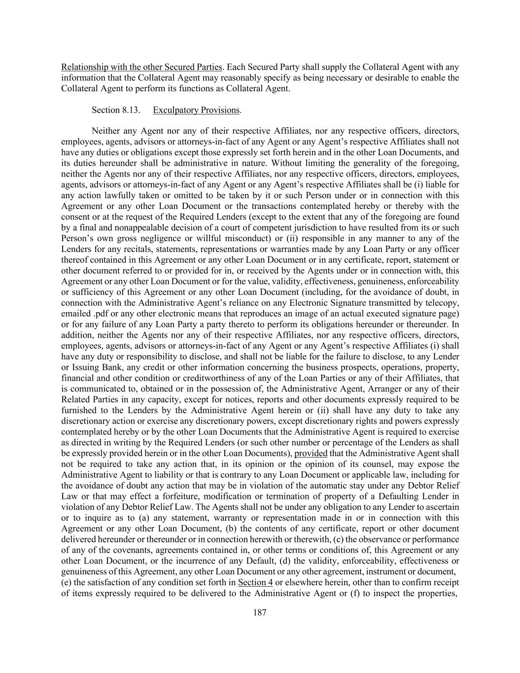 187 Relationship with the other Secured Parties. Each Secured Party shall supply the Collateral Agent with any information that the Collateral Agent may reasonably specify as being necessary or desirable to enable the Collateral Agent to perform its functions as Collateral Agent. Section 8.13. Exculpatory Provisions. Neither any Agent nor any of their respective Affiliates, nor any respective officers, directors, employees, agents, advisors or attorneys-in-fact of any Agent or any Agent’s respective Affiliates shall not have any duties or obligations except those expressly set forth herein and in the other Loan Documents, and its duties hereunder shall be administrative in nature. Without limiting the generality of the foregoing, neither the Agents nor any of their respective Affiliates, nor any respective officers, directors, employees, agents, advisors or attorneys-in-fact of any Agent or any Agent’s respective Affiliates shall be (i) liable for any action lawfully taken or omitted to be taken by it or such Person under or in connection with this Agreement or any other Loan Document or the transactions contemplated hereby or thereby with the consent or at the request of the Required Lenders (except to the extent that any of the foregoing are found by a final and nonappealable decision of a court of competent jurisdiction to have resulted from its or such Person’s own gross negligence or willful misconduct) or (ii) responsible in any manner to any of the Lenders for any recitals, statements, representations or warranties made by any Loan Party or any officer thereof contained in this Agreement or any other Loan Document or in any certificate, report, statement or other document referred to or provided for in, or received by the Agents under or in connection with, this Agreement or any other Loan Document or for the value, validity, effectiveness, genuineness, enforceability or sufficiency of this Agreement or any other Loan Document (including, for the avoidance of doubt, in connection with the Administrative Agent’s reliance on any Electronic Signature transmitted by telecopy, emailed .pdf or any other electronic means that reproduces an image of an actual executed signature page) or for any failure of any Loan Party a party thereto to perform its obligations hereunder or thereunder. In addition, neither the Agents nor any of their respective Affiliates, nor any respective officers, directors, employees, agents, advisors or attorneys-in-fact of any Agent or any Agent’s respective Affiliates (i) shall have any duty or responsibility to disclose, and shall not be liable for the failure to disclose, to any Lender or Issuing Bank, any credit or other information concerning the business prospects, operations, property, financial and other condition or creditworthiness of any of the Loan Parties or any of their Affiliates, that is communicated to, obtained or in the possession of, the Administrative Agent, Arranger or any of their Related Parties in any capacity, except for notices, reports and other documents expressly required to be furnished to the Lenders by the Administrative Agent herein or (ii) shall have any duty to take any discretionary action or exercise any discretionary powers, except discretionary rights and powers expressly contemplated hereby or by the other Loan Documents that the Administrative Agent is required to exercise as directed in writing by the Required Lenders (or such other number or percentage of the Lenders as shall be expressly provided herein or in the other Loan Documents), provided that the Administrative Agent shall not be required to take any action that, in its opinion or the opinion of its counsel, may expose the Administrative Agent to liability or that is contrary to any Loan Document or applicable law, including for the avoidance of doubt any action that may be in violation of the automatic stay under any Debtor Relief Law or that may effect a forfeiture, modification or termination of property of a Defaulting Lender in violation of any Debtor Relief Law. The Agents shall not be under any obligation to any Lender to ascertain or to inquire as to (a) any statement, warranty or representation made in or in connection with this Agreement or any other Loan Document, (b) the contents of any certificate, report or other document delivered hereunder or thereunder or in connection herewith or therewith, (c) the observance or performance of any of the covenants, agreements contained in, or other terms or conditions of, this Agreement or any other Loan Document, or the incurrence of any Default, (d) the validity, enforceability, effectiveness or genuineness of this Agreement, any other Loan Document or any other agreement, instrument or document, (e) the satisfaction of any condition set forth in Section 4 or elsewhere herein, other than to confirm receipt of items expressly required to be delivered to the Administrative Agent or (f) to inspect the properties,