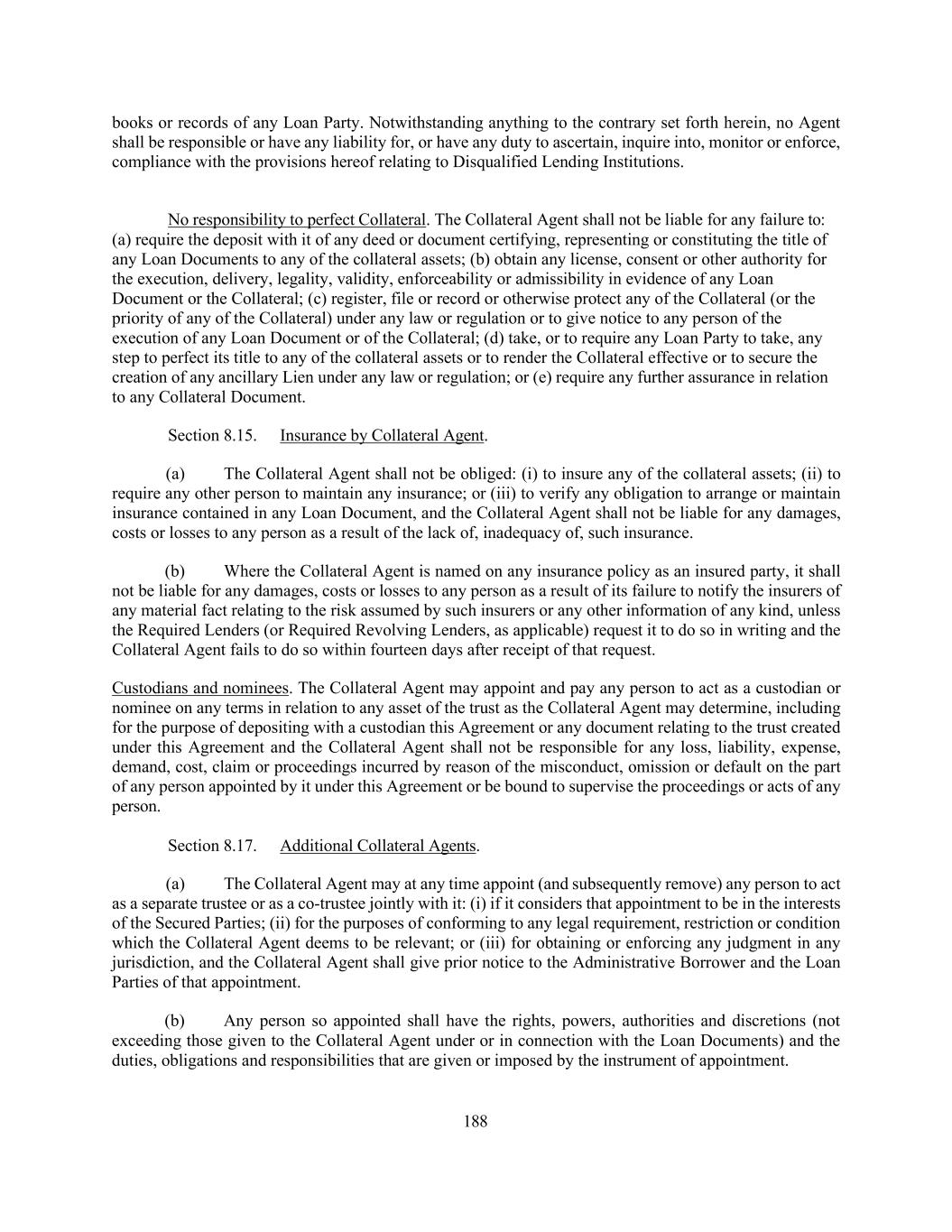 188 books or records of any Loan Party. Notwithstanding anything to the contrary set forth herein, no Agent shall be responsible or have any liability for, or have any duty to ascertain, inquire into, monitor or enforce, compliance with the provisions hereof relating to Disqualified Lending Institutions. No responsibility to perfect Collateral. The Collateral Agent shall not be liable for any failure to: (a) require the deposit with it of any deed or document certifying, representing or constituting the title of any Loan Documents to any of the collateral assets; (b) obtain any license, consent or other authority for the execution, delivery, legality, validity, enforceability or admissibility in evidence of any Loan Document or the Collateral; (c) register, file or record or otherwise protect any of the Collateral (or the priority of any of the Collateral) under any law or regulation or to give notice to any person of the execution of any Loan Document or of the Collateral; (d) take, or to require any Loan Party to take, any step to perfect its title to any of the collateral assets or to render the Collateral effective or to secure the creation of any ancillary Lien under any law or regulation; or (e) require any further assurance in relation to any Collateral Document. Section 8.15. Insurance by Collateral Agent. (a) The Collateral Agent shall not be obliged: (i) to insure any of the collateral assets; (ii) to require any other person to maintain any insurance; or (iii) to verify any obligation to arrange or maintain insurance contained in any Loan Document, and the Collateral Agent shall not be liable for any damages, costs or losses to any person as a result of the lack of, inadequacy of, such insurance. (b) Where the Collateral Agent is named on any insurance policy as an insured party, it shall not be liable for any damages, costs or losses to any person as a result of its failure to notify the insurers of any material fact relating to the risk assumed by such insurers or any other information of any kind, unless the Required Lenders (or Required Revolving Lenders, as applicable) request it to do so in writing and the Collateral Agent fails to do so within fourteen days after receipt of that request. Custodians and nominees. The Collateral Agent may appoint and pay any person to act as a custodian or nominee on any terms in relation to any asset of the trust as the Collateral Agent may determine, including for the purpose of depositing with a custodian this Agreement or any document relating to the trust created under this Agreement and the Collateral Agent shall not be responsible for any loss, liability, expense, demand, cost, claim or proceedings incurred by reason of the misconduct, omission or default on the part of any person appointed by it under this Agreement or be bound to supervise the proceedings or acts of any person. Section 8.17. Additional Collateral Agents. (a) The Collateral Agent may at any time appoint (and subsequently remove) any person to act as a separate trustee or as a co-trustee jointly with it: (i) if it considers that appointment to be in the interests of the Secured Parties; (ii) for the purposes of conforming to any legal requirement, restriction or condition which the Collateral Agent deems to be relevant; or (iii) for obtaining or enforcing any judgment in any jurisdiction, and the Collateral Agent shall give prior notice to the Administrative Borrower and the Loan Parties of that appointment. (b) Any person so appointed shall have the rights, powers, authorities and discretions (not exceeding those given to the Collateral Agent under or in connection with the Loan Documents) and the duties, obligations and responsibilities that are given or imposed by the instrument of appointment.