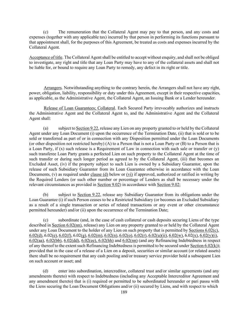 189 (c) The remuneration that the Collateral Agent may pay to that person, and any costs and expenses (together with any applicable tax) incurred by that person in performing its functions pursuant to that appointment shall, for the purposes of this Agreement, be treated as costs and expenses incurred by the Collateral Agent. Acceptance of title. The Collateral Agent shall be entitled to accept without enquiry, and shall not be obliged to investigate, any right and title that any Loan Party may have to any of the collateral assets and shall not be liable for, or bound to require any Loan Party to remedy, any defect in its right or title. Arrangers. Notwithstanding anything to the contrary herein, the Arrangers shall not have any right, power, obligation, liability, responsibility or duty under this Agreement, except in their respective capacities, as applicable, as the Administrative Agent, the Collateral Agent, an Issuing Bank or a Lender hereunder. Release of Loan Guarantees; Collateral. Each Secured Party irrevocably authorizes and instructs the Administrative Agent and the Collateral Agent to, and the Administrative Agent and the Collateral Agent shall: (a) subject to Section 9.22, release any Lien on any property granted to or held by the Collateral Agent under any Loan Document (i) upon the occurrence of the Termination Date, (ii) that is sold or to be sold or transferred as part of or in connection with any Disposition permitted under the Loan Documents (or other disposition not restricted hereby) (A) to a Person that is not a Loan Party or (B) to a Person that is a Loan Party, if (x) such release is a Requirement of Law in connection with such sale or transfer or (y) such transferee Loan Party grants a perfected Lien on such property to the Collateral Agent at the time of such transfer or during such longer period as agreed to by the Collateral Agent, (iii) that becomes an Excluded Asset, (iv) if the property subject to such Lien is owned by a Subsidiary Guarantor, upon the release of such Subsidiary Guarantor from its Loan Guarantee otherwise in accordance with the Loan Documents, (v) as required under clause (d) below or (vi) if approved, authorized or ratified in writing by the Required Lenders (or such other number or percentage of Lenders as shall be necessary under the relevant circumstances as provided in Section 9.02) in accordance with Section 9.02; (b) subject to Section 9.22, release any Subsidiary Guarantor from its obligations under the Loan Guarantee (i) if such Person ceases to be a Restricted Subsidiary (or becomes an Excluded Subsidiary as a result of a single transaction or series of related transactions or any event or other circumstance permitted hereunder) and/or (ii) upon the occurrence of the Termination Date; (c) subordinate (and, in the case of cash collateral or cash deposits securing Liens of the type described in Section 6.02(nn), release) any Lien on any property granted to or held by the Collateral Agent under any Loan Document to the holder of any Lien on such property that is permitted by Sections 6.02(c), 6.02(d), 6.02(e), 6.02(f), 6.02(g), 6.02(m), 6.02(n), 6.02(o), 6.02(r), 6.02(u)(ii), 6.02(w), 6.02(x), 6.02(y)(i), 6.02(aa), 6.02(bb), 6.02(dd), 6.02(ee), 6.02(hh) and 6.02(nn) (and any Refinancing Indebtedness in respect of any thereof to the extent such Refinancing Indebtedness is permitted to be secured under Section 6.02(k)); provided that in the case of a release of a Lien on a deposit, securities or similar account (or related assets) there shall be no requirement that any cash pooling and/or treasury service provider hold a subsequent Lien on such account or asset; and (d) enter into subordination, intercreditor, collateral trust and/or similar agreements (and any amendments thereto) with respect to Indebtedness (including any Acceptable Intercreditor Agreement and any amendment thereto) that is (i) required or permitted to be subordinated hereunder or pari passu with the Liens securing the Loan Document Obligations and/or (ii) secured by Liens, and with respect to which
