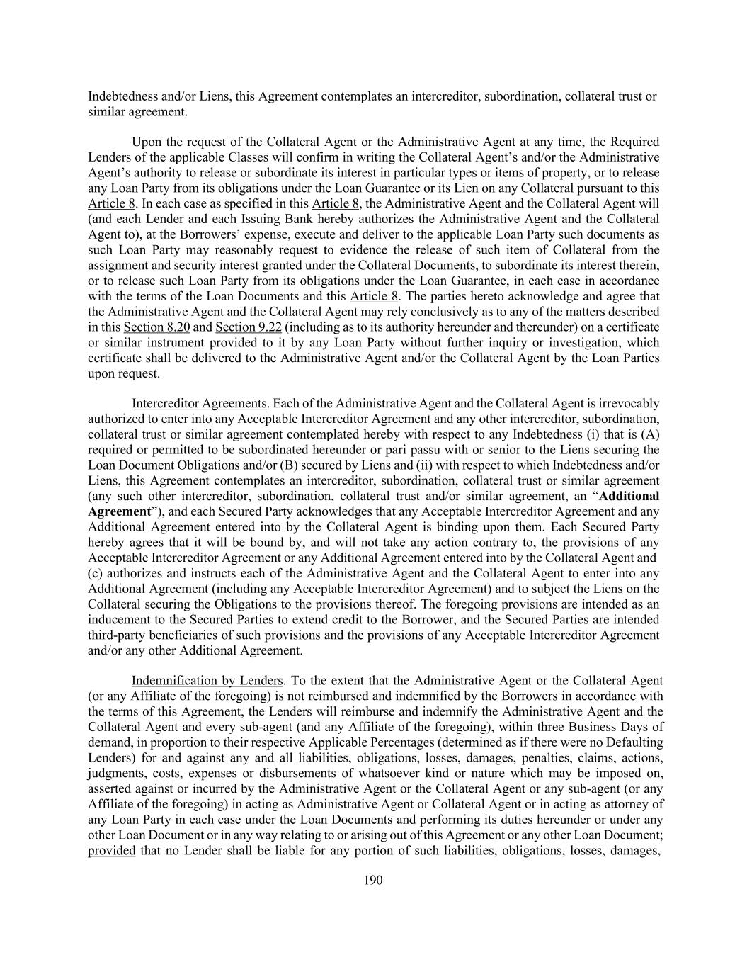 190 Indebtedness and/or Liens, this Agreement contemplates an intercreditor, subordination, collateral trust or similar agreement. Upon the request of the Collateral Agent or the Administrative Agent at any time, the Required Lenders of the applicable Classes will confirm in writing the Collateral Agent’s and/or the Administrative Agent’s authority to release or subordinate its interest in particular types or items of property, or to release any Loan Party from its obligations under the Loan Guarantee or its Lien on any Collateral pursuant to this Article 8. In each case as specified in this Article 8, the Administrative Agent and the Collateral Agent will (and each Lender and each Issuing Bank hereby authorizes the Administrative Agent and the Collateral Agent to), at the Borrowers’ expense, execute and deliver to the applicable Loan Party such documents as such Loan Party may reasonably request to evidence the release of such item of Collateral from the assignment and security interest granted under the Collateral Documents, to subordinate its interest therein, or to release such Loan Party from its obligations under the Loan Guarantee, in each case in accordance with the terms of the Loan Documents and this Article 8. The parties hereto acknowledge and agree that the Administrative Agent and the Collateral Agent may rely conclusively as to any of the matters described in this Section 8.20 and Section 9.22 (including as to its authority hereunder and thereunder) on a certificate or similar instrument provided to it by any Loan Party without further inquiry or investigation, which certificate shall be delivered to the Administrative Agent and/or the Collateral Agent by the Loan Parties upon request. Intercreditor Agreements. Each of the Administrative Agent and the Collateral Agent is irrevocably authorized to enter into any Acceptable Intercreditor Agreement and any other intercreditor, subordination, collateral trust or similar agreement contemplated hereby with respect to any Indebtedness (i) that is (A) required or permitted to be subordinated hereunder or pari passu with or senior to the Liens securing the Loan Document Obligations and/or (B) secured by Liens and (ii) with respect to which Indebtedness and/or Liens, this Agreement contemplates an intercreditor, subordination, collateral trust or similar agreement (any such other intercreditor, subordination, collateral trust and/or similar agreement, an “Additional Agreement”), and each Secured Party acknowledges that any Acceptable Intercreditor Agreement and any Additional Agreement entered into by the Collateral Agent is binding upon them. Each Secured Party hereby agrees that it will be bound by, and will not take any action contrary to, the provisions of any Acceptable Intercreditor Agreement or any Additional Agreement entered into by the Collateral Agent and (c) authorizes and instructs each of the Administrative Agent and the Collateral Agent to enter into any Additional Agreement (including any Acceptable Intercreditor Agreement) and to subject the Liens on the Collateral securing the Obligations to the provisions thereof. The foregoing provisions are intended as an inducement to the Secured Parties to extend credit to the Borrower, and the Secured Parties are intended third-party beneficiaries of such provisions and the provisions of any Acceptable Intercreditor Agreement and/or any other Additional Agreement. Indemnification by Lenders. To the extent that the Administrative Agent or the Collateral Agent (or any Affiliate of the foregoing) is not reimbursed and indemnified by the Borrowers in accordance with the terms of this Agreement, the Lenders will reimburse and indemnify the Administrative Agent and the Collateral Agent and every sub-agent (and any Affiliate of the foregoing), within three Business Days of demand, in proportion to their respective Applicable Percentages (determined as if there were no Defaulting Lenders) for and against any and all liabilities, obligations, losses, damages, penalties, claims, actions, judgments, costs, expenses or disbursements of whatsoever kind or nature which may be imposed on, asserted against or incurred by the Administrative Agent or the Collateral Agent or any sub-agent (or any Affiliate of the foregoing) in acting as Administrative Agent or Collateral Agent or in acting as attorney of any Loan Party in each case under the Loan Documents and performing its duties hereunder or under any other Loan Document or in any way relating to or arising out of this Agreement or any other Loan Document; provided that no Lender shall be liable for any portion of such liabilities, obligations, losses, damages,