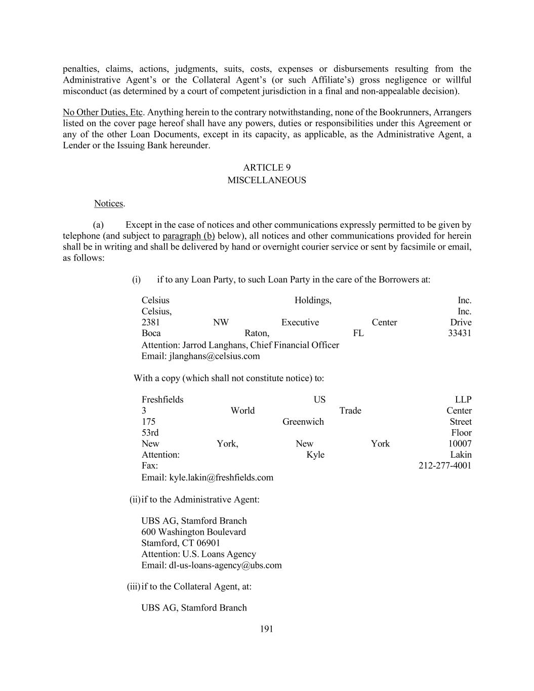 191 penalties, claims, actions, judgments, suits, costs, expenses or disbursements resulting from the Administrative Agent’s or the Collateral Agent’s (or such Affiliate’s) gross negligence or willful misconduct (as determined by a court of competent jurisdiction in a final and non-appealable decision). No Other Duties, Etc. Anything herein to the contrary notwithstanding, none of the Bookrunners, Arrangers listed on the cover page hereof shall have any powers, duties or responsibilities under this Agreement or any of the other Loan Documents, except in its capacity, as applicable, as the Administrative Agent, a Lender or the Issuing Bank hereunder. ARTICLE 9 MISCELLANEOUS Notices. (a) Except in the case of notices and other communications expressly permitted to be given by telephone (and subject to paragraph (b) below), all notices and other communications provided for herein shall be in writing and shall be delivered by hand or overnight courier service or sent by facsimile or email, as follows: (i) if to any Loan Party, to such Loan Party in the care of the Borrowers at: Celsius Holdings, Inc. Celsius, Inc. 2381 NW Executive Center Drive Boca Raton, FL 33431 Attention: Jarrod Langhans, Chief Financial Officer Email: jlanghans@celsius.com With a copy (which shall not constitute notice) to: Freshfields US LLP 3 World Trade Center 175 Greenwich Street 53rd Floor New York, New York 10007 Attention: Kyle Lakin Fax: 212-277-4001 Email: kyle.lakin@freshfields.com (ii) if to the Administrative Agent: UBS AG, Stamford Branch 600 Washington Boulevard Stamford, CT 06901 Attention: U.S. Loans Agency Email: dl-us-loans-agency@ubs.com (iii) if to the Collateral Agent, at: UBS AG, Stamford Branch