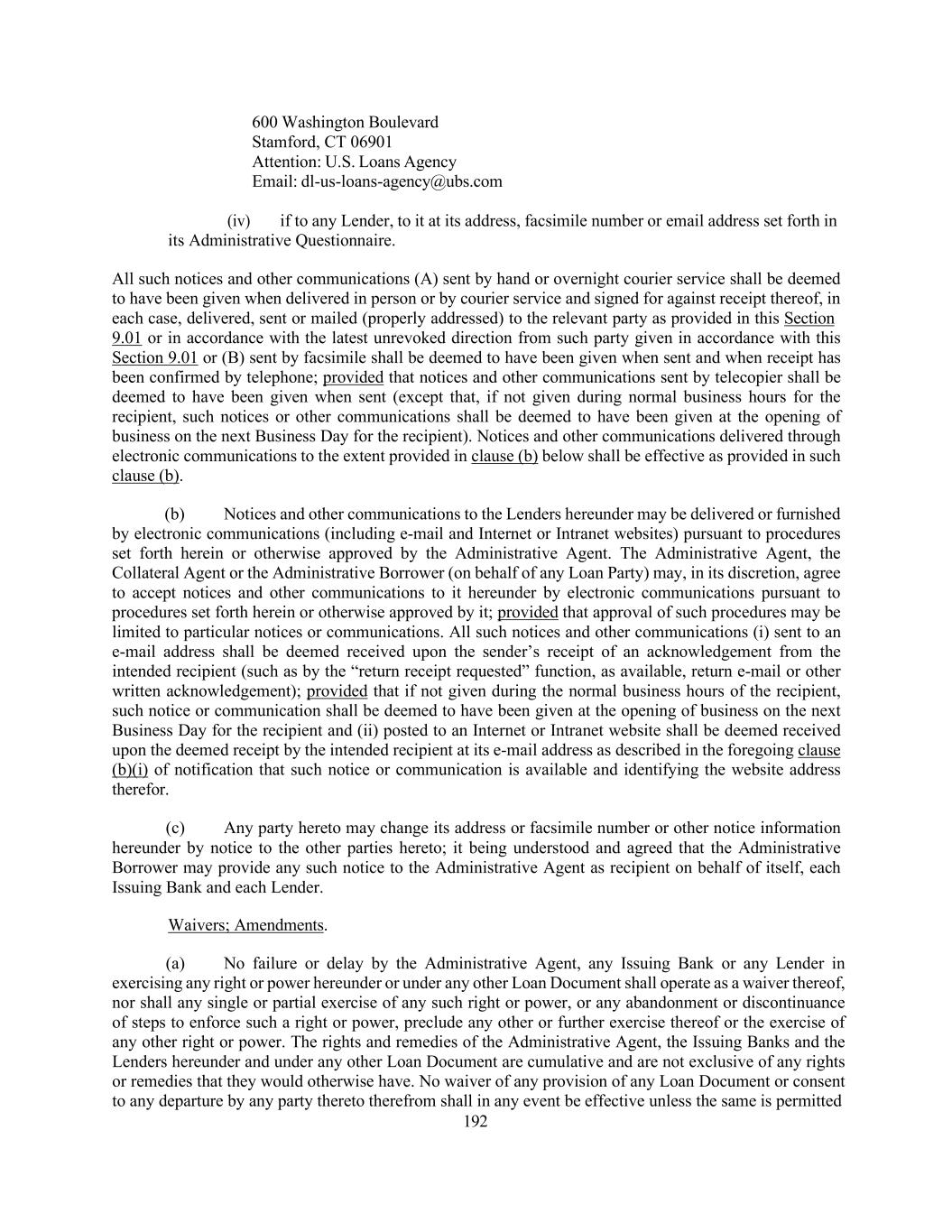 192 600 Washington Boulevard Stamford, CT 06901 Attention: U.S. Loans Agency Email: dl-us-loans-agency@ubs.com (iv) if to any Lender, to it at its address, facsimile number or email address set forth in its Administrative Questionnaire. All such notices and other communications (A) sent by hand or overnight courier service shall be deemed to have been given when delivered in person or by courier service and signed for against receipt thereof, in each case, delivered, sent or mailed (properly addressed) to the relevant party as provided in this Section 9.01 or in accordance with the latest unrevoked direction from such party given in accordance with this Section 9.01 or (B) sent by facsimile shall be deemed to have been given when sent and when receipt has been confirmed by telephone; provided that notices and other communications sent by telecopier shall be deemed to have been given when sent (except that, if not given during normal business hours for the recipient, such notices or other communications shall be deemed to have been given at the opening of business on the next Business Day for the recipient). Notices and other communications delivered through electronic communications to the extent provided in clause (b) below shall be effective as provided in such clause (b). (b) Notices and other communications to the Lenders hereunder may be delivered or furnished by electronic communications (including e-mail and Internet or Intranet websites) pursuant to procedures set forth herein or otherwise approved by the Administrative Agent. The Administrative Agent, the Collateral Agent or the Administrative Borrower (on behalf of any Loan Party) may, in its discretion, agree to accept notices and other communications to it hereunder by electronic communications pursuant to procedures set forth herein or otherwise approved by it; provided that approval of such procedures may be limited to particular notices or communications. All such notices and other communications (i) sent to an e-mail address shall be deemed received upon the sender’s receipt of an acknowledgement from the intended recipient (such as by the “return receipt requested” function, as available, return e-mail or other written acknowledgement); provided that if not given during the normal business hours of the recipient, such notice or communication shall be deemed to have been given at the opening of business on the next Business Day for the recipient and (ii) posted to an Internet or Intranet website shall be deemed received upon the deemed receipt by the intended recipient at its e-mail address as described in the foregoing clause (b)(i) of notification that such notice or communication is available and identifying the website address therefor. (c) Any party hereto may change its address or facsimile number or other notice information hereunder by notice to the other parties hereto; it being understood and agreed that the Administrative Borrower may provide any such notice to the Administrative Agent as recipient on behalf of itself, each Issuing Bank and each Lender. Waivers; Amendments. (a) No failure or delay by the Administrative Agent, any Issuing Bank or any Lender in exercising any right or power hereunder or under any other Loan Document shall operate as a waiver thereof, nor shall any single or partial exercise of any such right or power, or any abandonment or discontinuance of steps to enforce such a right or power, preclude any other or further exercise thereof or the exercise of any other right or power. The rights and remedies of the Administrative Agent, the Issuing Banks and the Lenders hereunder and under any other Loan Document are cumulative and are not exclusive of any rights or remedies that they would otherwise have. No waiver of any provision of any Loan Document or consent to any departure by any party thereto therefrom shall in any event be effective unless the same is permitted