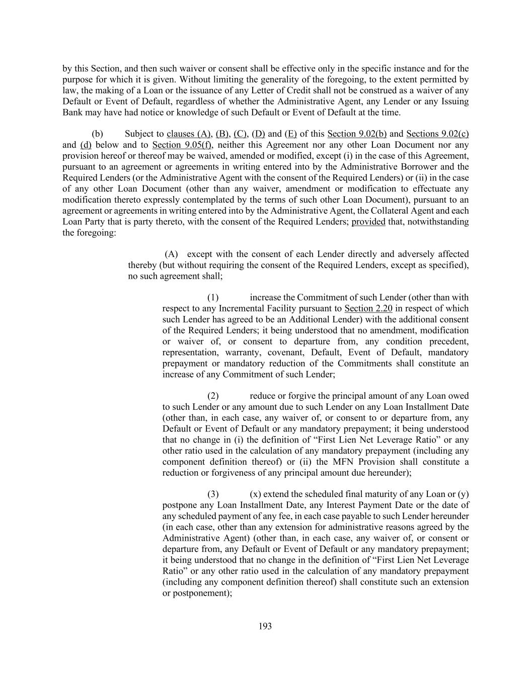 193 by this Section, and then such waiver or consent shall be effective only in the specific instance and for the purpose for which it is given. Without limiting the generality of the foregoing, to the extent permitted by law, the making of a Loan or the issuance of any Letter of Credit shall not be construed as a waiver of any Default or Event of Default, regardless of whether the Administrative Agent, any Lender or any Issuing Bank may have had notice or knowledge of such Default or Event of Default at the time. (b) Subject to clauses (A), (B), (C), (D) and (E) of this Section 9.02(b) and Sections 9.02(c) and (d) below and to Section 9.05(f), neither this Agreement nor any other Loan Document nor any provision hereof or thereof may be waived, amended or modified, except (i) in the case of this Agreement, pursuant to an agreement or agreements in writing entered into by the Administrative Borrower and the Required Lenders (or the Administrative Agent with the consent of the Required Lenders) or (ii) in the case of any other Loan Document (other than any waiver, amendment or modification to effectuate any modification thereto expressly contemplated by the terms of such other Loan Document), pursuant to an agreement or agreements in writing entered into by the Administrative Agent, the Collateral Agent and each Loan Party that is party thereto, with the consent of the Required Lenders; provided that, notwithstanding the foregoing: (A) except with the consent of each Lender directly and adversely affected thereby (but without requiring the consent of the Required Lenders, except as specified), no such agreement shall; (1) increase the Commitment of such Lender (other than with respect to any Incremental Facility pursuant to Section 2.20 in respect of which such Lender has agreed to be an Additional Lender) with the additional consent of the Required Lenders; it being understood that no amendment, modification or waiver of, or consent to departure from, any condition precedent, representation, warranty, covenant, Default, Event of Default, mandatory prepayment or mandatory reduction of the Commitments shall constitute an increase of any Commitment of such Lender; (2) reduce or forgive the principal amount of any Loan owed to such Lender or any amount due to such Lender on any Loan Installment Date (other than, in each case, any waiver of, or consent to or departure from, any Default or Event of Default or any mandatory prepayment; it being understood that no change in (i) the definition of “First Lien Net Leverage Ratio” or any other ratio used in the calculation of any mandatory prepayment (including any component definition thereof) or (ii) the MFN Provision shall constitute a reduction or forgiveness of any principal amount due hereunder); (3) (x) extend the scheduled final maturity of any Loan or (y) postpone any Loan Installment Date, any Interest Payment Date or the date of any scheduled payment of any fee, in each case payable to such Lender hereunder (in each case, other than any extension for administrative reasons agreed by the Administrative Agent) (other than, in each case, any waiver of, or consent or departure from, any Default or Event of Default or any mandatory prepayment; it being understood that no change in the definition of “First Lien Net Leverage Ratio” or any other ratio used in the calculation of any mandatory prepayment (including any component definition thereof) shall constitute such an extension or postponement);