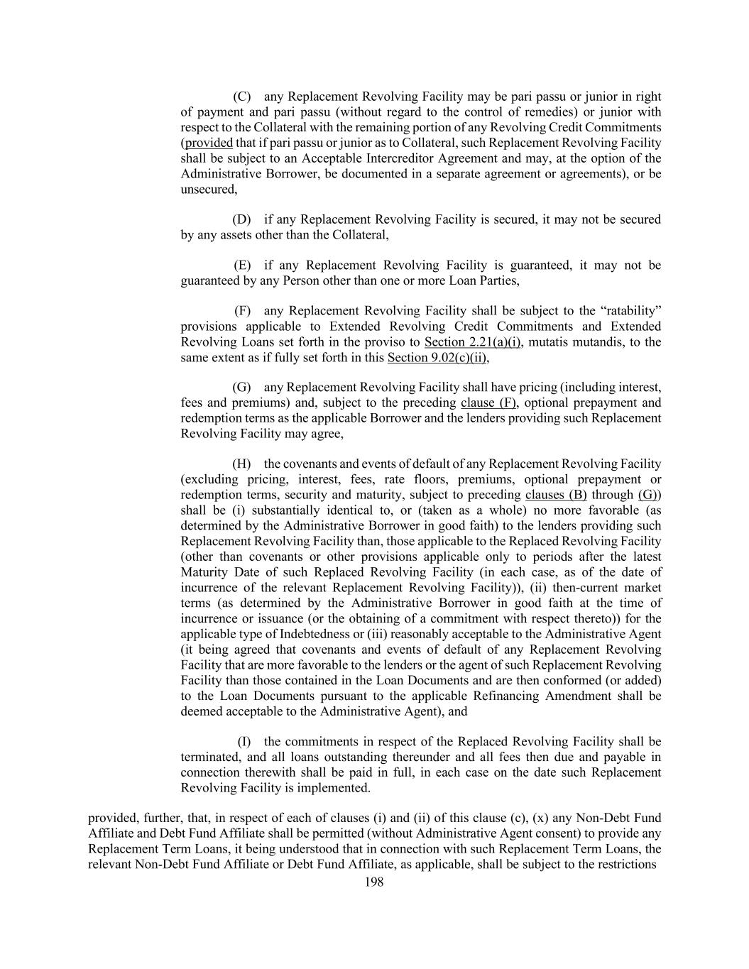 198 (C) any Replacement Revolving Facility may be pari passu or junior in right of payment and pari passu (without regard to the control of remedies) or junior with respect to the Collateral with the remaining portion of any Revolving Credit Commitments (provided that if pari passu or junior as to Collateral, such Replacement Revolving Facility shall be subject to an Acceptable Intercreditor Agreement and may, at the option of the Administrative Borrower, be documented in a separate agreement or agreements), or be unsecured, (D) if any Replacement Revolving Facility is secured, it may not be secured by any assets other than the Collateral, (E) if any Replacement Revolving Facility is guaranteed, it may not be guaranteed by any Person other than one or more Loan Parties, (F) any Replacement Revolving Facility shall be subject to the “ratability” provisions applicable to Extended Revolving Credit Commitments and Extended Revolving Loans set forth in the proviso to Section 2.21(a)(i), mutatis mutandis, to the same extent as if fully set forth in this Section 9.02(c)(ii), (G) any Replacement Revolving Facility shall have pricing (including interest, fees and premiums) and, subject to the preceding clause (F), optional prepayment and redemption terms as the applicable Borrower and the lenders providing such Replacement Revolving Facility may agree, (H) the covenants and events of default of any Replacement Revolving Facility (excluding pricing, interest, fees, rate floors, premiums, optional prepayment or redemption terms, security and maturity, subject to preceding clauses (B) through (G)) shall be (i) substantially identical to, or (taken as a whole) no more favorable (as determined by the Administrative Borrower in good faith) to the lenders providing such Replacement Revolving Facility than, those applicable to the Replaced Revolving Facility (other than covenants or other provisions applicable only to periods after the latest Maturity Date of such Replaced Revolving Facility (in each case, as of the date of incurrence of the relevant Replacement Revolving Facility)), (ii) then-current market terms (as determined by the Administrative Borrower in good faith at the time of incurrence or issuance (or the obtaining of a commitment with respect thereto)) for the applicable type of Indebtedness or (iii) reasonably acceptable to the Administrative Agent (it being agreed that covenants and events of default of any Replacement Revolving Facility that are more favorable to the lenders or the agent of such Replacement Revolving Facility than those contained in the Loan Documents and are then conformed (or added) to the Loan Documents pursuant to the applicable Refinancing Amendment shall be deemed acceptable to the Administrative Agent), and (I) the commitments in respect of the Replaced Revolving Facility shall be terminated, and all loans outstanding thereunder and all fees then due and payable in connection therewith shall be paid in full, in each case on the date such Replacement Revolving Facility is implemented. provided, further, that, in respect of each of clauses (i) and (ii) of this clause (c), (x) any Non-Debt Fund Affiliate and Debt Fund Affiliate shall be permitted (without Administrative Agent consent) to provide any Replacement Term Loans, it being understood that in connection with such Replacement Term Loans, the relevant Non-Debt Fund Affiliate or Debt Fund Affiliate, as applicable, shall be subject to the restrictions