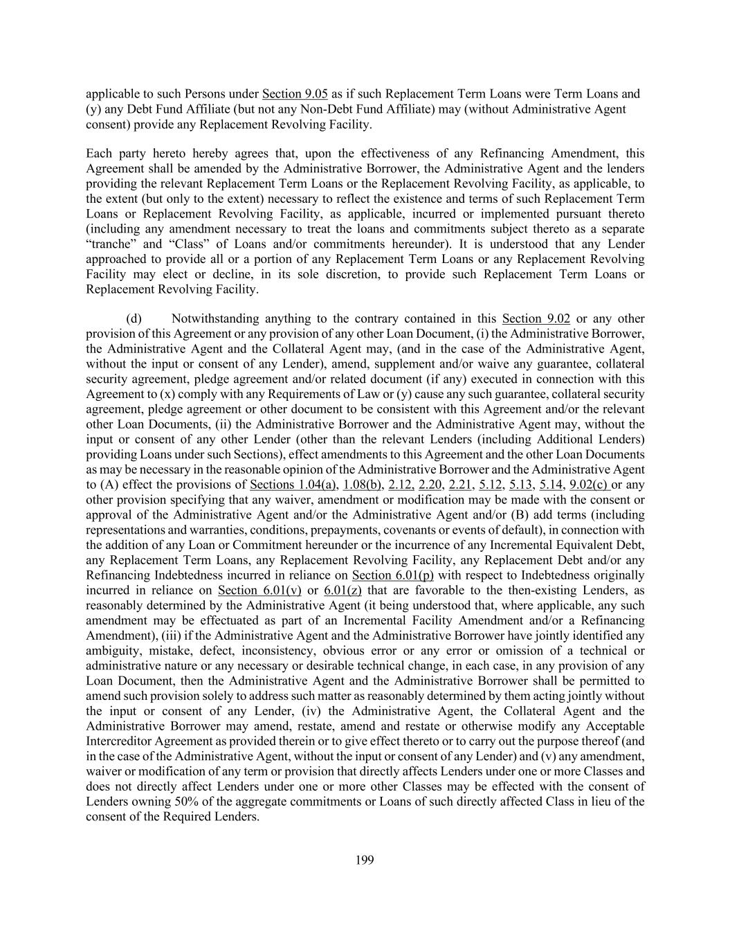 199 applicable to such Persons under Section 9.05 as if such Replacement Term Loans were Term Loans and (y) any Debt Fund Affiliate (but not any Non-Debt Fund Affiliate) may (without Administrative Agent consent) provide any Replacement Revolving Facility. Each party hereto hereby agrees that, upon the effectiveness of any Refinancing Amendment, this Agreement shall be amended by the Administrative Borrower, the Administrative Agent and the lenders providing the relevant Replacement Term Loans or the Replacement Revolving Facility, as applicable, to the extent (but only to the extent) necessary to reflect the existence and terms of such Replacement Term Loans or Replacement Revolving Facility, as applicable, incurred or implemented pursuant thereto (including any amendment necessary to treat the loans and commitments subject thereto as a separate “tranche” and “Class” of Loans and/or commitments hereunder). It is understood that any Lender approached to provide all or a portion of any Replacement Term Loans or any Replacement Revolving Facility may elect or decline, in its sole discretion, to provide such Replacement Term Loans or Replacement Revolving Facility. (d) Notwithstanding anything to the contrary contained in this Section 9.02 or any other provision of this Agreement or any provision of any other Loan Document, (i) the Administrative Borrower, the Administrative Agent and the Collateral Agent may, (and in the case of the Administrative Agent, without the input or consent of any Lender), amend, supplement and/or waive any guarantee, collateral security agreement, pledge agreement and/or related document (if any) executed in connection with this Agreement to (x) comply with any Requirements of Law or (y) cause any such guarantee, collateral security agreement, pledge agreement or other document to be consistent with this Agreement and/or the relevant other Loan Documents, (ii) the Administrative Borrower and the Administrative Agent may, without the input or consent of any other Lender (other than the relevant Lenders (including Additional Lenders) providing Loans under such Sections), effect amendments to this Agreement and the other Loan Documents as may be necessary in the reasonable opinion of the Administrative Borrower and the Administrative Agent to (A) effect the provisions of Sections 1.04(a), 1.08(b), 2.12, 2.20, 2.21, 5.12, 5.13, 5.14, 9.02(c) or any other provision specifying that any waiver, amendment or modification may be made with the consent or approval of the Administrative Agent and/or the Administrative Agent and/or (B) add terms (including representations and warranties, conditions, prepayments, covenants or events of default), in connection with the addition of any Loan or Commitment hereunder or the incurrence of any Incremental Equivalent Debt, any Replacement Term Loans, any Replacement Revolving Facility, any Replacement Debt and/or any Refinancing Indebtedness incurred in reliance on Section 6.01(p) with respect to Indebtedness originally incurred in reliance on Section 6.01(v) or 6.01(z) that are favorable to the then-existing Lenders, as reasonably determined by the Administrative Agent (it being understood that, where applicable, any such amendment may be effectuated as part of an Incremental Facility Amendment and/or a Refinancing Amendment), (iii) if the Administrative Agent and the Administrative Borrower have jointly identified any ambiguity, mistake, defect, inconsistency, obvious error or any error or omission of a technical or administrative nature or any necessary or desirable technical change, in each case, in any provision of any Loan Document, then the Administrative Agent and the Administrative Borrower shall be permitted to amend such provision solely to address such matter as reasonably determined by them acting jointly without the input or consent of any Lender, (iv) the Administrative Agent, the Collateral Agent and the Administrative Borrower may amend, restate, amend and restate or otherwise modify any Acceptable Intercreditor Agreement as provided therein or to give effect thereto or to carry out the purpose thereof (and in the case of the Administrative Agent, without the input or consent of any Lender) and (v) any amendment, waiver or modification of any term or provision that directly affects Lenders under one or more Classes and does not directly affect Lenders under one or more other Classes may be effected with the consent of Lenders owning 50% of the aggregate commitments or Loans of such directly affected Class in lieu of the consent of the Required Lenders.