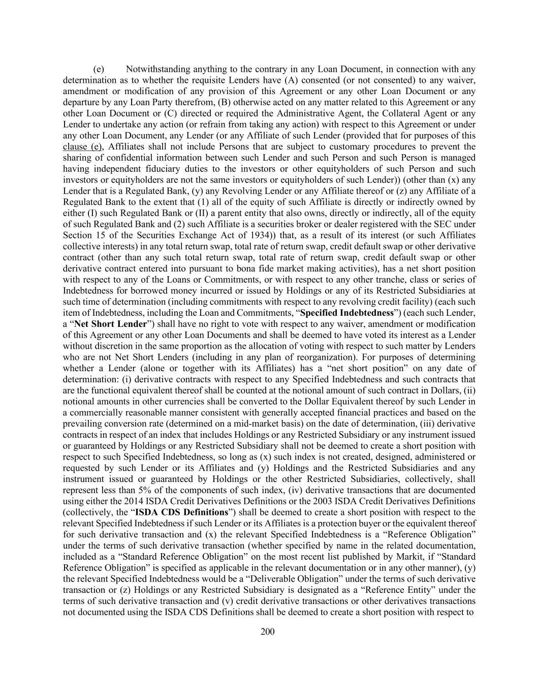 200 (e) Notwithstanding anything to the contrary in any Loan Document, in connection with any determination as to whether the requisite Lenders have (A) consented (or not consented) to any waiver, amendment or modification of any provision of this Agreement or any other Loan Document or any departure by any Loan Party therefrom, (B) otherwise acted on any matter related to this Agreement or any other Loan Document or (C) directed or required the Administrative Agent, the Collateral Agent or any Lender to undertake any action (or refrain from taking any action) with respect to this Agreement or under any other Loan Document, any Lender (or any Affiliate of such Lender (provided that for purposes of this clause (e), Affiliates shall not include Persons that are subject to customary procedures to prevent the sharing of confidential information between such Lender and such Person and such Person is managed having independent fiduciary duties to the investors or other equityholders of such Person and such investors or equityholders are not the same investors or equityholders of such Lender)) (other than (x) any Lender that is a Regulated Bank, (y) any Revolving Lender or any Affiliate thereof or (z) any Affiliate of a Regulated Bank to the extent that (1) all of the equity of such Affiliate is directly or indirectly owned by either (I) such Regulated Bank or (II) a parent entity that also owns, directly or indirectly, all of the equity of such Regulated Bank and (2) such Affiliate is a securities broker or dealer registered with the SEC under Section 15 of the Securities Exchange Act of 1934)) that, as a result of its interest (or such Affiliates collective interests) in any total return swap, total rate of return swap, credit default swap or other derivative contract (other than any such total return swap, total rate of return swap, credit default swap or other derivative contract entered into pursuant to bona fide market making activities), has a net short position with respect to any of the Loans or Commitments, or with respect to any other tranche, class or series of Indebtedness for borrowed money incurred or issued by Holdings or any of its Restricted Subsidiaries at such time of determination (including commitments with respect to any revolving credit facility) (each such item of Indebtedness, including the Loan and Commitments, “Specified Indebtedness”) (each such Lender, a “Net Short Lender”) shall have no right to vote with respect to any waiver, amendment or modification of this Agreement or any other Loan Documents and shall be deemed to have voted its interest as a Lender without discretion in the same proportion as the allocation of voting with respect to such matter by Lenders who are not Net Short Lenders (including in any plan of reorganization). For purposes of determining whether a Lender (alone or together with its Affiliates) has a “net short position” on any date of determination: (i) derivative contracts with respect to any Specified Indebtedness and such contracts that are the functional equivalent thereof shall be counted at the notional amount of such contract in Dollars, (ii) notional amounts in other currencies shall be converted to the Dollar Equivalent thereof by such Lender in a commercially reasonable manner consistent with generally accepted financial practices and based on the prevailing conversion rate (determined on a mid-market basis) on the date of determination, (iii) derivative contracts in respect of an index that includes Holdings or any Restricted Subsidiary or any instrument issued or guaranteed by Holdings or any Restricted Subsidiary shall not be deemed to create a short position with respect to such Specified Indebtedness, so long as (x) such index is not created, designed, administered or requested by such Lender or its Affiliates and (y) Holdings and the Restricted Subsidiaries and any instrument issued or guaranteed by Holdings or the other Restricted Subsidiaries, collectively, shall represent less than 5% of the components of such index, (iv) derivative transactions that are documented using either the 2014 ISDA Credit Derivatives Definitions or the 2003 ISDA Credit Derivatives Definitions (collectively, the “ISDA CDS Definitions”) shall be deemed to create a short position with respect to the relevant Specified Indebtedness if such Lender or its Affiliates is a protection buyer or the equivalent thereof for such derivative transaction and (x) the relevant Specified Indebtedness is a “Reference Obligation” under the terms of such derivative transaction (whether specified by name in the related documentation, included as a “Standard Reference Obligation” on the most recent list published by Markit, if “Standard Reference Obligation” is specified as applicable in the relevant documentation or in any other manner), (y) the relevant Specified Indebtedness would be a “Deliverable Obligation” under the terms of such derivative transaction or (z) Holdings or any Restricted Subsidiary is designated as a “Reference Entity” under the terms of such derivative transaction and (v) credit derivative transactions or other derivatives transactions not documented using the ISDA CDS Definitions shall be deemed to create a short position with respect to