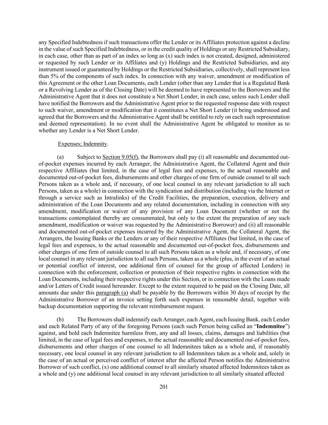 201 any Specified Indebtedness if such transactions offer the Lender or its Affiliates protection against a decline in the value of such Specified Indebtedness, or in the credit quality of Holdings or any Restricted Subsidiary, in each case, other than as part of an index so long as (x) such index is not created, designed, administered or requested by such Lender or its Affiliates and (y) Holdings and the Restricted Subsidiaries, and any instrument issued or guaranteed by Holdings or the Restricted Subsidiaries, collectively, shall represent less than 5% of the components of such index. In connection with any waiver, amendment or modification of this Agreement or the other Loan Documents, each Lender (other than any Lender that is a Regulated Bank or a Revolving Lender as of the Closing Date) will be deemed to have represented to the Borrowers and the Administrative Agent that it does not constitute a Net Short Lender, in each case, unless such Lender shall have notified the Borrowers and the Administrative Agent prior to the requested response date with respect to such waiver, amendment or modification that it constitutes a Net Short Lender (it being understood and agreed that the Borrowers and the Administrative Agent shall be entitled to rely on each such representation and deemed representation). In no event shall the Administrative Agent be obligated to monitor as to whether any Lender is a Net Short Lender. Expenses; Indemnity. (a) Subject to Section 9.05(f), the Borrowers shall pay (i) all reasonable and documented out- of-pocket expenses incurred by each Arranger, the Administrative Agent, the Collateral Agent and their respective Affiliates (but limited, in the case of legal fees and expenses, to the actual reasonable and documented out-of-pocket fees, disbursements and other charges of one firm of outside counsel to all such Persons taken as a whole and, if necessary, of one local counsel in any relevant jurisdiction to all such Persons, taken as a whole) in connection with the syndication and distribution (including via the Internet or through a service such as Intralinks) of the Credit Facilities, the preparation, execution, delivery and administration of the Loan Documents and any related documentation, including in connection with any amendment, modification or waiver of any provision of any Loan Document (whether or not the transactions contemplated thereby are consummated, but only to the extent the preparation of any such amendment, modification or waiver was requested by the Administrative Borrower) and (ii) all reasonable and documented out-of-pocket expenses incurred by the Administrative Agent, the Collateral Agent, the Arrangers, the Issuing Banks or the Lenders or any of their respective Affiliates (but limited, in the case of legal fees and expenses, to the actual reasonable and documented out-of-pocket fees, disbursements and other charges of one firm of outside counsel to all such Persons taken as a whole and, if necessary, of one local counsel in any relevant jurisdiction to all such Persons, taken as a whole (plus, in the event of an actual or potential conflict of interest, one additional firm of counsel for the group of affected Lenders) in connection with the enforcement, collection or protection of their respective rights in connection with the Loan Documents, including their respective rights under this Section, or in connection with the Loans made and/or Letters of Credit issued hereunder. Except to the extent required to be paid on the Closing Date, all amounts due under this paragraph (a) shall be payable by the Borrowers within 30 days of receipt by the Administrative Borrower of an invoice setting forth such expenses in reasonable detail, together with backup documentation supporting the relevant reimbursement request. (b) The Borrowers shall indemnify each Arranger, each Agent, each Issuing Bank, each Lender and each Related Party of any of the foregoing Persons (each such Person being called an “Indemnitee”) against, and hold each Indemnitee harmless from, any and all losses, claims, damages and liabilities (but limited, in the case of legal fees and expenses, to the actual reasonable and documented out-of-pocket fees, disbursements and other charges of one counsel to all Indemnitees taken as a whole and, if reasonably necessary, one local counsel in any relevant jurisdiction to all Indemnitees taken as a whole and, solely in the case of an actual or perceived conflict of interest after the affected Person notifies the Administrative Borrower of such conflict, (x) one additional counsel to all similarly situated affected Indemnitees taken as a whole and (y) one additional local counsel in any relevant jurisdiction to all similarly situated affected