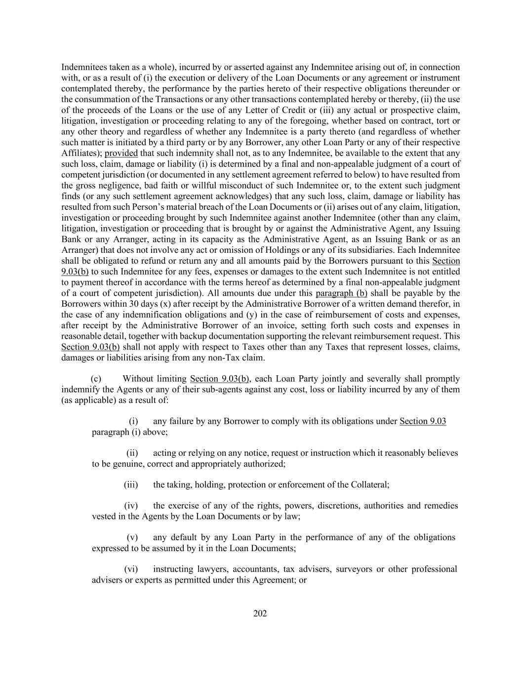 202 Indemnitees taken as a whole), incurred by or asserted against any Indemnitee arising out of, in connection with, or as a result of (i) the execution or delivery of the Loan Documents or any agreement or instrument contemplated thereby, the performance by the parties hereto of their respective obligations thereunder or the consummation of the Transactions or any other transactions contemplated hereby or thereby, (ii) the use of the proceeds of the Loans or the use of any Letter of Credit or (iii) any actual or prospective claim, litigation, investigation or proceeding relating to any of the foregoing, whether based on contract, tort or any other theory and regardless of whether any Indemnitee is a party thereto (and regardless of whether such matter is initiated by a third party or by any Borrower, any other Loan Party or any of their respective Affiliates); provided that such indemnity shall not, as to any Indemnitee, be available to the extent that any such loss, claim, damage or liability (i) is determined by a final and non-appealable judgment of a court of competent jurisdiction (or documented in any settlement agreement referred to below) to have resulted from the gross negligence, bad faith or willful misconduct of such Indemnitee or, to the extent such judgment finds (or any such settlement agreement acknowledges) that any such loss, claim, damage or liability has resulted from such Person’s material breach of the Loan Documents or (ii) arises out of any claim, litigation, investigation or proceeding brought by such Indemnitee against another Indemnitee (other than any claim, litigation, investigation or proceeding that is brought by or against the Administrative Agent, any Issuing Bank or any Arranger, acting in its capacity as the Administrative Agent, as an Issuing Bank or as an Arranger) that does not involve any act or omission of Holdings or any of its subsidiaries. Each Indemnitee shall be obligated to refund or return any and all amounts paid by the Borrowers pursuant to this Section 9.03(b) to such Indemnitee for any fees, expenses or damages to the extent such Indemnitee is not entitled to payment thereof in accordance with the terms hereof as determined by a final non-appealable judgment of a court of competent jurisdiction). All amounts due under this paragraph (b) shall be payable by the Borrowers within 30 days (x) after receipt by the Administrative Borrower of a written demand therefor, in the case of any indemnification obligations and (y) in the case of reimbursement of costs and expenses, after receipt by the Administrative Borrower of an invoice, setting forth such costs and expenses in reasonable detail, together with backup documentation supporting the relevant reimbursement request. This Section 9.03(b) shall not apply with respect to Taxes other than any Taxes that represent losses, claims, damages or liabilities arising from any non-Tax claim. (c) Without limiting Section 9.03(b), each Loan Party jointly and severally shall promptly indemnify the Agents or any of their sub-agents against any cost, loss or liability incurred by any of them (as applicable) as a result of: (i) any failure by any Borrower to comply with its obligations under Section 9.03 paragraph (i) above; (ii) acting or relying on any notice, request or instruction which it reasonably believes to be genuine, correct and appropriately authorized; (iii) the taking, holding, protection or enforcement of the Collateral; (iv) the exercise of any of the rights, powers, discretions, authorities and remedies vested in the Agents by the Loan Documents or by law; (v) any default by any Loan Party in the performance of any of the obligations expressed to be assumed by it in the Loan Documents; (vi) instructing lawyers, accountants, tax advisers, surveyors or other professional advisers or experts as permitted under this Agreement; or