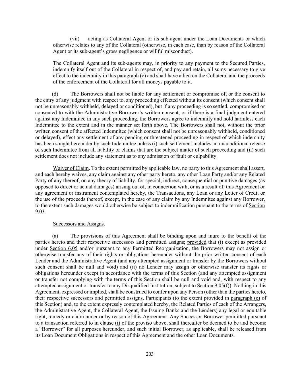 203 (vii) acting as Collateral Agent or its sub-agent under the Loan Documents or which otherwise relates to any of the Collateral (otherwise, in each case, than by reason of the Collateral Agent or its sub-agent’s gross negligence or willful misconduct). The Collateral Agent and its sub-agents may, in priority to any payment to the Secured Parties, indemnify itself out of the Collateral in respect of, and pay and retain, all sums necessary to give effect to the indemnity in this paragraph (c) and shall have a lien on the Collateral and the proceeds of the enforcement of the Collateral for all moneys payable to it. (d) The Borrowers shall not be liable for any settlement or compromise of, or the consent to the entry of any judgment with respect to, any proceeding effected without its consent (which consent shall not be unreasonably withheld, delayed or conditioned), but if any proceeding is so settled, compromised or consented to with the Administrative Borrower’s written consent, or if there is a final judgment entered against any Indemnitee in any such proceeding, the Borrowers agree to indemnify and hold harmless each Indemnitee to the extent and in the manner set forth above. The Borrowers shall not, without the prior written consent of the affected Indemnitee (which consent shall not be unreasonably withheld, conditioned or delayed), effect any settlement of any pending or threatened proceeding in respect of which indemnity has been sought hereunder by such Indemnitee unless (i) such settlement includes an unconditional release of such Indemnitee from all liability or claims that are the subject matter of such proceeding and (ii) such settlement does not include any statement as to any admission of fault or culpability. Waiver of Claim. To the extent permitted by applicable law, no party to this Agreement shall assert, and each hereby waives, any claim against any other party hereto, any other Loan Party and/or any Related Party of any thereof, on any theory of liability, for special, indirect, consequential or punitive damages (as opposed to direct or actual damages) arising out of, in connection with, or as a result of, this Agreement or any agreement or instrument contemplated hereby, the Transactions, any Loan or any Letter of Credit or the use of the proceeds thereof, except, in the case of any claim by any Indemnitee against any Borrower, to the extent such damages would otherwise be subject to indemnification pursuant to the terms of Section 9.03. Successors and Assigns. (a) The provisions of this Agreement shall be binding upon and inure to the benefit of the parties hereto and their respective successors and permitted assigns; provided that (i) except as provided under Section 6.05 and/or pursuant to any Permitted Reorganization, the Borrowers may not assign or otherwise transfer any of their rights or obligations hereunder without the prior written consent of each Lender and the Administrative Agent (and any attempted assignment or transfer by the Borrowers without such consent shall be null and void) and (ii) no Lender may assign or otherwise transfer its rights or obligations hereunder except in accordance with the terms of this Section (and any attempted assignment or transfer not complying with the terms of this Section shall be null and void and, with respect to any attempted assignment or transfer to any Disqualified Institution, subject to Section 9.05(f)). Nothing in this Agreement, expressed or implied, shall be construed to confer upon any Person (other than the parties hereto, their respective successors and permitted assigns, Participants (to the extent provided in paragraph (c) of this Section) and, to the extent expressly contemplated hereby, the Related Parties of each of the Arrangers, the Administrative Agent, the Collateral Agent, the Issuing Banks and the Lenders) any legal or equitable right, remedy or claim under or by reason of this Agreement. Any Successor Borrower permitted pursuant to a transaction referred to in clause (i) of the proviso above, shall thereafter be deemed to be and become a “Borrower” for all purposes hereunder, and such initial Borrower, as applicable, shall be released from its Loan Document Obligations in respect of this Agreement and the other Loan Documents.