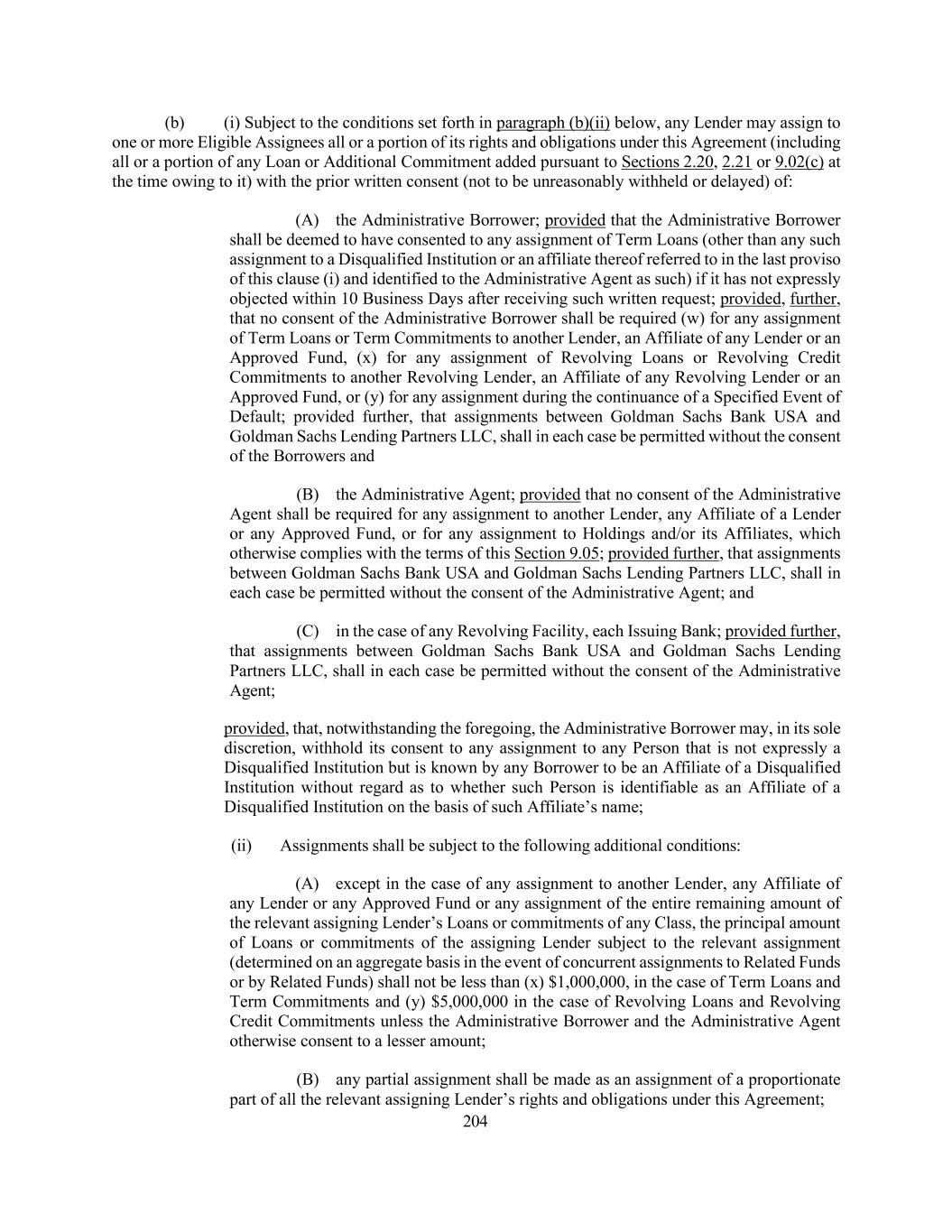 204 (b) (i) Subject to the conditions set forth in paragraph (b)(ii) below, any Lender may assign to one or more Eligible Assignees all or a portion of its rights and obligations under this Agreement (including all or a portion of any Loan or Additional Commitment added pursuant to Sections 2.20, 2.21 or 9.02(c) at the time owing to it) with the prior written consent (not to be unreasonably withheld or delayed) of: (A) the Administrative Borrower; provided that the Administrative Borrower shall be deemed to have consented to any assignment of Term Loans (other than any such assignment to a Disqualified Institution or an affiliate thereof referred to in the last proviso of this clause (i) and identified to the Administrative Agent as such) if it has not expressly objected within 10 Business Days after receiving such written request; provided, further, that no consent of the Administrative Borrower shall be required (w) for any assignment of Term Loans or Term Commitments to another Lender, an Affiliate of any Lender or an Approved Fund, (x) for any assignment of Revolving Loans or Revolving Credit Commitments to another Revolving Lender, an Affiliate of any Revolving Lender or an Approved Fund, or (y) for any assignment during the continuance of a Specified Event of Default; provided further, that assignments between Goldman Sachs Bank USA and Goldman Sachs Lending Partners LLC, shall in each case be permitted without the consent of the Borrowers and (B) the Administrative Agent; provided that no consent of the Administrative Agent shall be required for any assignment to another Lender, any Affiliate of a Lender or any Approved Fund, or for any assignment to Holdings and/or its Affiliates, which otherwise complies with the terms of this Section 9.05; provided further, that assignments between Goldman Sachs Bank USA and Goldman Sachs Lending Partners LLC, shall in each case be permitted without the consent of the Administrative Agent; and (C) in the case of any Revolving Facility, each Issuing Bank; provided further, that assignments between Goldman Sachs Bank USA and Goldman Sachs Lending Partners LLC, shall in each case be permitted without the consent of the Administrative Agent; provided, that, notwithstanding the foregoing, the Administrative Borrower may, in its sole discretion, withhold its consent to any assignment to any Person that is not expressly a Disqualified Institution but is known by any Borrower to be an Affiliate of a Disqualified Institution without regard as to whether such Person is identifiable as an Affiliate of a Disqualified Institution on the basis of such Affiliate’s name; (ii) Assignments shall be subject to the following additional conditions: (A) except in the case of any assignment to another Lender, any Affiliate of any Lender or any Approved Fund or any assignment of the entire remaining amount of the relevant assigning Lender’s Loans or commitments of any Class, the principal amount of Loans or commitments of the assigning Lender subject to the relevant assignment (determined on an aggregate basis in the event of concurrent assignments to Related Funds or by Related Funds) shall not be less than (x) $1,000,000, in the case of Term Loans and Term Commitments and (y) $5,000,000 in the case of Revolving Loans and Revolving Credit Commitments unless the Administrative Borrower and the Administrative Agent otherwise consent to a lesser amount; (B) any partial assignment shall be made as an assignment of a proportionate part of all the relevant assigning Lender’s rights and obligations under this Agreement;