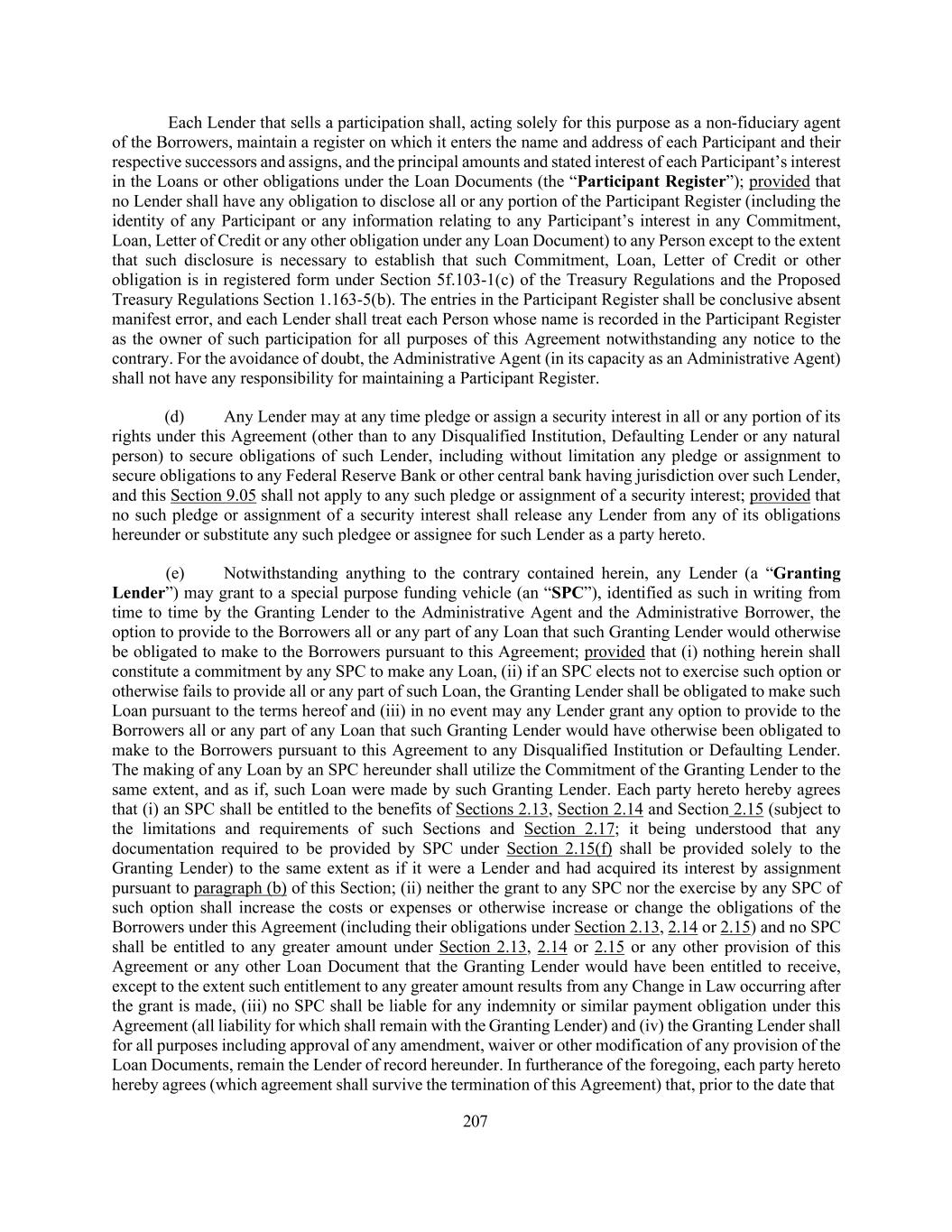207 Each Lender that sells a participation shall, acting solely for this purpose as a non-fiduciary agent of the Borrowers, maintain a register on which it enters the name and address of each Participant and their respective successors and assigns, and the principal amounts and stated interest of each Participant’s interest in the Loans or other obligations under the Loan Documents (the “Participant Register”); provided that no Lender shall have any obligation to disclose all or any portion of the Participant Register (including the identity of any Participant or any information relating to any Participant’s interest in any Commitment, Loan, Letter of Credit or any other obligation under any Loan Document) to any Person except to the extent that such disclosure is necessary to establish that such Commitment, Loan, Letter of Credit or other obligation is in registered form under Section 5f.103-1(c) of the Treasury Regulations and the Proposed Treasury Regulations Section 1.163-5(b). The entries in the Participant Register shall be conclusive absent manifest error, and each Lender shall treat each Person whose name is recorded in the Participant Register as the owner of such participation for all purposes of this Agreement notwithstanding any notice to the contrary. For the avoidance of doubt, the Administrative Agent (in its capacity as an Administrative Agent) shall not have any responsibility for maintaining a Participant Register. (d) Any Lender may at any time pledge or assign a security interest in all or any portion of its rights under this Agreement (other than to any Disqualified Institution, Defaulting Lender or any natural person) to secure obligations of such Lender, including without limitation any pledge or assignment to secure obligations to any Federal Reserve Bank or other central bank having jurisdiction over such Lender, and this Section 9.05 shall not apply to any such pledge or assignment of a security interest; provided that no such pledge or assignment of a security interest shall release any Lender from any of its obligations hereunder or substitute any such pledgee or assignee for such Lender as a party hereto. (e) Notwithstanding anything to the contrary contained herein, any Lender (a “Granting Lender”) may grant to a special purpose funding vehicle (an “SPC”), identified as such in writing from time to time by the Granting Lender to the Administrative Agent and the Administrative Borrower, the option to provide to the Borrowers all or any part of any Loan that such Granting Lender would otherwise be obligated to make to the Borrowers pursuant to this Agreement; provided that (i) nothing herein shall constitute a commitment by any SPC to make any Loan, (ii) if an SPC elects not to exercise such option or otherwise fails to provide all or any part of such Loan, the Granting Lender shall be obligated to make such Loan pursuant to the terms hereof and (iii) in no event may any Lender grant any option to provide to the Borrowers all or any part of any Loan that such Granting Lender would have otherwise been obligated to make to the Borrowers pursuant to this Agreement to any Disqualified Institution or Defaulting Lender. The making of any Loan by an SPC hereunder shall utilize the Commitment of the Granting Lender to the same extent, and as if, such Loan were made by such Granting Lender. Each party hereto hereby agrees that (i) an SPC shall be entitled to the benefits of Sections 2.13, Section 2.14 and Section 2.15 (subject to the limitations and requirements of such Sections and Section 2.17; it being understood that any documentation required to be provided by SPC under Section 2.15(f) shall be provided solely to the Granting Lender) to the same extent as if it were a Lender and had acquired its interest by assignment pursuant to paragraph (b) of this Section; (ii) neither the grant to any SPC nor the exercise by any SPC of such option shall increase the costs or expenses or otherwise increase or change the obligations of the Borrowers under this Agreement (including their obligations under Section 2.13, 2.14 or 2.15) and no SPC shall be entitled to any greater amount under Section 2.13, 2.14 or 2.15 or any other provision of this Agreement or any other Loan Document that the Granting Lender would have been entitled to receive, except to the extent such entitlement to any greater amount results from any Change in Law occurring after the grant is made, (iii) no SPC shall be liable for any indemnity or similar payment obligation under this Agreement (all liability for which shall remain with the Granting Lender) and (iv) the Granting Lender shall for all purposes including approval of any amendment, waiver or other modification of any provision of the Loan Documents, remain the Lender of record hereunder. In furtherance of the foregoing, each party hereto hereby agrees (which agreement shall survive the termination of this Agreement) that, prior to the date that