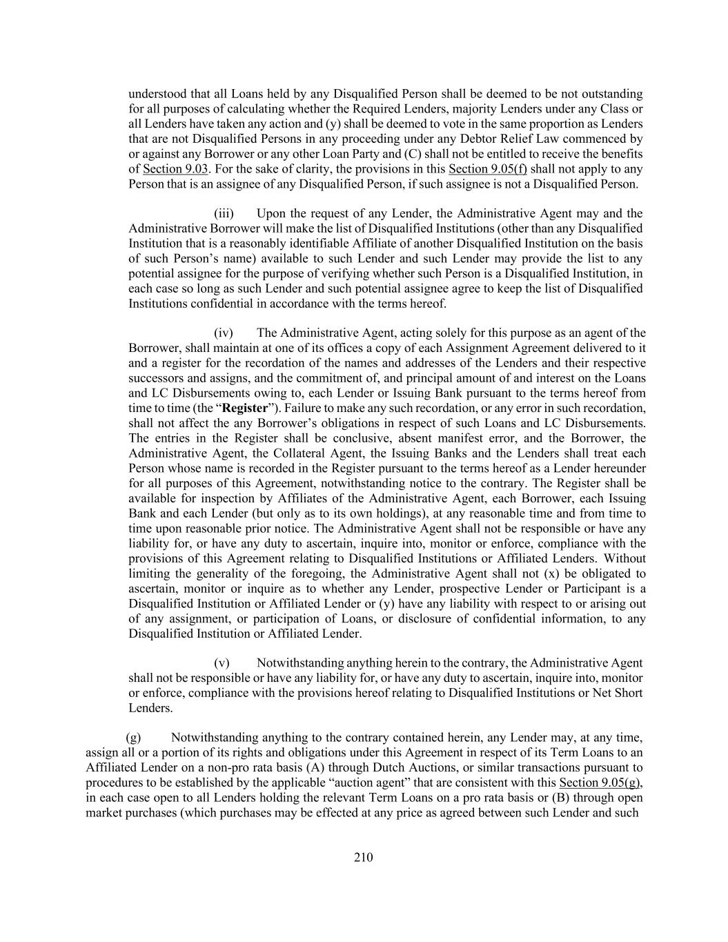 210 understood that all Loans held by any Disqualified Person shall be deemed to be not outstanding for all purposes of calculating whether the Required Lenders, majority Lenders under any Class or all Lenders have taken any action and (y) shall be deemed to vote in the same proportion as Lenders that are not Disqualified Persons in any proceeding under any Debtor Relief Law commenced by or against any Borrower or any other Loan Party and (C) shall not be entitled to receive the benefits of Section 9.03. For the sake of clarity, the provisions in this Section 9.05(f) shall not apply to any Person that is an assignee of any Disqualified Person, if such assignee is not a Disqualified Person. (iii) Upon the request of any Lender, the Administrative Agent may and the Administrative Borrower will make the list of Disqualified Institutions (other than any Disqualified Institution that is a reasonably identifiable Affiliate of another Disqualified Institution on the basis of such Person’s name) available to such Lender and such Lender may provide the list to any potential assignee for the purpose of verifying whether such Person is a Disqualified Institution, in each case so long as such Lender and such potential assignee agree to keep the list of Disqualified Institutions confidential in accordance with the terms hereof. (iv) The Administrative Agent, acting solely for this purpose as an agent of the Borrower, shall maintain at one of its offices a copy of each Assignment Agreement delivered to it and a register for the recordation of the names and addresses of the Lenders and their respective successors and assigns, and the commitment of, and principal amount of and interest on the Loans and LC Disbursements owing to, each Lender or Issuing Bank pursuant to the terms hereof from time to time (the “Register”). Failure to make any such recordation, or any error in such recordation, shall not affect the any Borrower’s obligations in respect of such Loans and LC Disbursements. The entries in the Register shall be conclusive, absent manifest error, and the Borrower, the Administrative Agent, the Collateral Agent, the Issuing Banks and the Lenders shall treat each Person whose name is recorded in the Register pursuant to the terms hereof as a Lender hereunder for all purposes of this Agreement, notwithstanding notice to the contrary. The Register shall be available for inspection by Affiliates of the Administrative Agent, each Borrower, each Issuing Bank and each Lender (but only as to its own holdings), at any reasonable time and from time to time upon reasonable prior notice. The Administrative Agent shall not be responsible or have any liability for, or have any duty to ascertain, inquire into, monitor or enforce, compliance with the provisions of this Agreement relating to Disqualified Institutions or Affiliated Lenders. Without limiting the generality of the foregoing, the Administrative Agent shall not (x) be obligated to ascertain, monitor or inquire as to whether any Lender, prospective Lender or Participant is a Disqualified Institution or Affiliated Lender or (y) have any liability with respect to or arising out of any assignment, or participation of Loans, or disclosure of confidential information, to any Disqualified Institution or Affiliated Lender. (v) Notwithstanding anything herein to the contrary, the Administrative Agent shall not be responsible or have any liability for, or have any duty to ascertain, inquire into, monitor or enforce, compliance with the provisions hereof relating to Disqualified Institutions or Net Short Lenders. (g) Notwithstanding anything to the contrary contained herein, any Lender may, at any time, assign all or a portion of its rights and obligations under this Agreement in respect of its Term Loans to an Affiliated Lender on a non-pro rata basis (A) through Dutch Auctions, or similar transactions pursuant to procedures to be established by the applicable “auction agent” that are consistent with this Section 9.05(g), in each case open to all Lenders holding the relevant Term Loans on a pro rata basis or (B) through open market purchases (which purchases may be effected at any price as agreed between such Lender and such