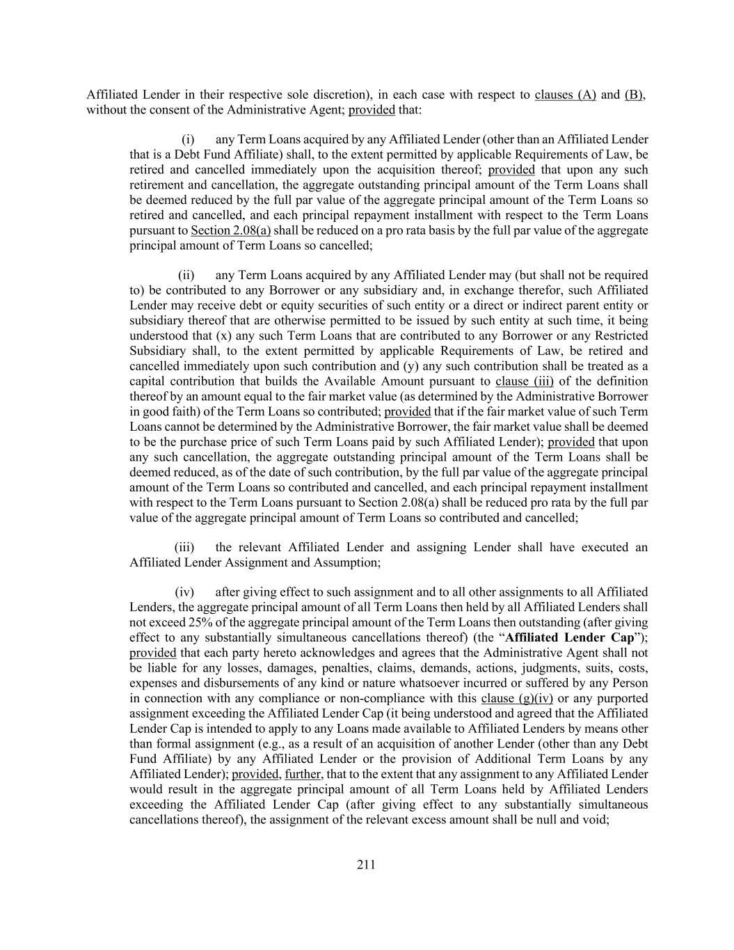 211 Affiliated Lender in their respective sole discretion), in each case with respect to clauses (A) and (B), without the consent of the Administrative Agent; provided that: (i) any Term Loans acquired by any Affiliated Lender (other than an Affiliated Lender that is a Debt Fund Affiliate) shall, to the extent permitted by applicable Requirements of Law, be retired and cancelled immediately upon the acquisition thereof; provided that upon any such retirement and cancellation, the aggregate outstanding principal amount of the Term Loans shall be deemed reduced by the full par value of the aggregate principal amount of the Term Loans so retired and cancelled, and each principal repayment installment with respect to the Term Loans pursuant to Section 2.08(a) shall be reduced on a pro rata basis by the full par value of the aggregate principal amount of Term Loans so cancelled; (ii) any Term Loans acquired by any Affiliated Lender may (but shall not be required to) be contributed to any Borrower or any subsidiary and, in exchange therefor, such Affiliated Lender may receive debt or equity securities of such entity or a direct or indirect parent entity or subsidiary thereof that are otherwise permitted to be issued by such entity at such time, it being understood that (x) any such Term Loans that are contributed to any Borrower or any Restricted Subsidiary shall, to the extent permitted by applicable Requirements of Law, be retired and cancelled immediately upon such contribution and (y) any such contribution shall be treated as a capital contribution that builds the Available Amount pursuant to clause (iii) of the definition thereof by an amount equal to the fair market value (as determined by the Administrative Borrower in good faith) of the Term Loans so contributed; provided that if the fair market value of such Term Loans cannot be determined by the Administrative Borrower, the fair market value shall be deemed to be the purchase price of such Term Loans paid by such Affiliated Lender); provided that upon any such cancellation, the aggregate outstanding principal amount of the Term Loans shall be deemed reduced, as of the date of such contribution, by the full par value of the aggregate principal amount of the Term Loans so contributed and cancelled, and each principal repayment installment with respect to the Term Loans pursuant to Section 2.08(a) shall be reduced pro rata by the full par value of the aggregate principal amount of Term Loans so contributed and cancelled; (iii) the relevant Affiliated Lender and assigning Lender shall have executed an Affiliated Lender Assignment and Assumption; (iv) after giving effect to such assignment and to all other assignments to all Affiliated Lenders, the aggregate principal amount of all Term Loans then held by all Affiliated Lenders shall not exceed 25% of the aggregate principal amount of the Term Loans then outstanding (after giving effect to any substantially simultaneous cancellations thereof) (the “Affiliated Lender Cap”); provided that each party hereto acknowledges and agrees that the Administrative Agent shall not be liable for any losses, damages, penalties, claims, demands, actions, judgments, suits, costs, expenses and disbursements of any kind or nature whatsoever incurred or suffered by any Person in connection with any compliance or non-compliance with this clause (g)(iv) or any purported assignment exceeding the Affiliated Lender Cap (it being understood and agreed that the Affiliated Lender Cap is intended to apply to any Loans made available to Affiliated Lenders by means other than formal assignment (e.g., as a result of an acquisition of another Lender (other than any Debt Fund Affiliate) by any Affiliated Lender or the provision of Additional Term Loans by any Affiliated Lender); provided, further, that to the extent that any assignment to any Affiliated Lender would result in the aggregate principal amount of all Term Loans held by Affiliated Lenders exceeding the Affiliated Lender Cap (after giving effect to any substantially simultaneous cancellations thereof), the assignment of the relevant excess amount shall be null and void;