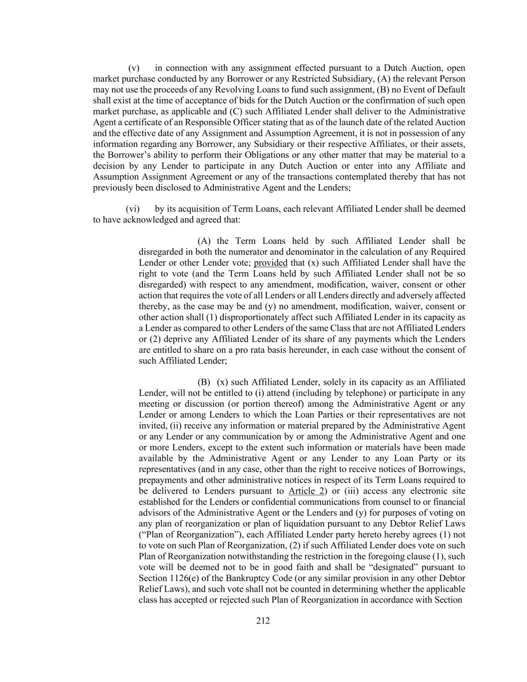 212 (v) in connection with any assignment effected pursuant to a Dutch Auction, open market purchase conducted by any Borrower or any Restricted Subsidiary, (A) the relevant Person may not use the proceeds of any Revolving Loans to fund such assignment, (B) no Event of Default shall exist at the time of acceptance of bids for the Dutch Auction or the confirmation of such open market purchase, as applicable and (C) such Affiliated Lender shall deliver to the Administrative Agent a certificate of an Responsible Officer stating that as of the launch date of the related Auction and the effective date of any Assignment and Assumption Agreement, it is not in possession of any information regarding any Borrower, any Subsidiary or their respective Affiliates, or their assets, the Borrower’s ability to perform their Obligations or any other matter that may be material to a decision by any Lender to participate in any Dutch Auction or enter into any Affiliate and Assumption Assignment Agreement or any of the transactions contemplated thereby that has not previously been disclosed to Administrative Agent and the Lenders; (vi) by its acquisition of Term Loans, each relevant Affiliated Lender shall be deemed to have acknowledged and agreed that: (A) the Term Loans held by such Affiliated Lender shall be disregarded in both the numerator and denominator in the calculation of any Required Lender or other Lender vote; provided that (x) such Affiliated Lender shall have the right to vote (and the Term Loans held by such Affiliated Lender shall not be so disregarded) with respect to any amendment, modification, waiver, consent or other action that requires the vote of all Lenders or all Lenders directly and adversely affected thereby, as the case may be and (y) no amendment, modification, waiver, consent or other action shall (1) disproportionately affect such Affiliated Lender in its capacity as a Lender as compared to other Lenders of the same Class that are not Affiliated Lenders or (2) deprive any Affiliated Lender of its share of any payments which the Lenders are entitled to share on a pro rata basis hereunder, in each case without the consent of such Affiliated Lender; (B) (x) such Affiliated Lender, solely in its capacity as an Affiliated Lender, will not be entitled to (i) attend (including by telephone) or participate in any meeting or discussion (or portion thereof) among the Administrative Agent or any Lender or among Lenders to which the Loan Parties or their representatives are not invited, (ii) receive any information or material prepared by the Administrative Agent or any Lender or any communication by or among the Administrative Agent and one or more Lenders, except to the extent such information or materials have been made available by the Administrative Agent or any Lender to any Loan Party or its representatives (and in any case, other than the right to receive notices of Borrowings, prepayments and other administrative notices in respect of its Term Loans required to be delivered to Lenders pursuant to Article 2) or (iii) access any electronic site established for the Lenders or confidential communications from counsel to or financial advisors of the Administrative Agent or the Lenders and (y) for purposes of voting on any plan of reorganization or plan of liquidation pursuant to any Debtor Relief Laws (“Plan of Reorganization”), each Affiliated Lender party hereto hereby agrees (1) not to vote on such Plan of Reorganization, (2) if such Affiliated Lender does vote on such Plan of Reorganization notwithstanding the restriction in the foregoing clause (1), such vote will be deemed not to be in good faith and shall be “designated” pursuant to Section 1126(e) of the Bankruptcy Code (or any similar provision in any other Debtor Relief Laws), and such vote shall not be counted in determining whether the applicable class has accepted or rejected such Plan of Reorganization in accordance with Section