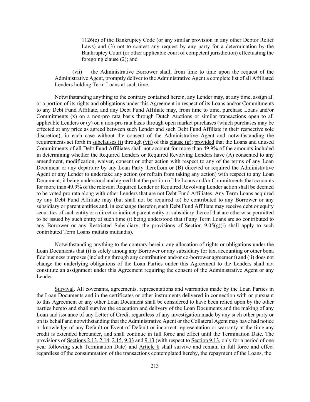 213 1126(c) of the Bankruptcy Code (or any similar provision in any other Debtor Relief Laws) and (3) not to contest any request by any party for a determination by the Bankruptcy Court (or other applicable court of competent jurisdiction) effectuating the foregoing clause (2); and (vii) the Administrative Borrower shall, from time to time upon the request of the Administrative Agent, promptly deliver to the Administrative Agent a complete list of all Affiliated Lenders holding Term Loans at such time. Notwithstanding anything to the contrary contained herein, any Lender may, at any time, assign all or a portion of its rights and obligations under this Agreement in respect of its Loans and/or Commitments to any Debt Fund Affiliate, and any Debt Fund Affiliate may, from time to time, purchase Loans and/or Commitments (x) on a non-pro rata basis through Dutch Auctions or similar transactions open to all applicable Lenders or (y) on a non-pro rata basis through open market purchases (which purchases may be effected at any price as agreed between such Lender and such Debt Fund Affiliate in their respective sole discretion), in each case without the consent of the Administrative Agent and notwithstanding the requirements set forth in subclauses (i) through (vii) of this clause (g); provided that the Loans and unused Commitments of all Debt Fund Affiliates shall not account for more than 49.9% of the amounts included in determining whether the Required Lenders or Required Revolving Lenders have (A) consented to any amendment, modification, waiver, consent or other action with respect to any of the terms of any Loan Document or any departure by any Loan Party therefrom or (B) directed or required the Administrative Agent or any Lender to undertake any action (or refrain from taking any action) with respect to any Loan Document; it being understood and agreed that the portion of the Loans and/or Commitments that accounts for more than 49.9% of the relevant Required Lender or Required Revolving Lender action shall be deemed to be voted pro rata along with other Lenders that are not Debt Fund Affiliates. Any Term Loans acquired by any Debt Fund Affiliate may (but shall not be required to) be contributed to any Borrower or any subsidiary or parent entities and, in exchange therefor, such Debt Fund Affiliate may receive debt or equity securities of such entity or a direct or indirect parent entity or subsidiary thereof that are otherwise permitted to be issued by such entity at such time (it being understood that if any Term Loans are so contributed to any Borrower or any Restricted Subsidiary, the provisions of Section 9.05(g)(i) shall apply to such contributed Term Loans mutatis mutandis). Notwithstanding anything to the contrary herein, any allocation of rights or obligations under the Loan Documents that (i) is solely among any Borrower or any subsidiary for tax, accounting or other bona fide business purposes (including through any contribution and/or co-borrower agreement) and (ii) does not change the underlying obligations of the Loan Parties under this Agreement to the Lenders shall not constitute an assignment under this Agreement requiring the consent of the Administrative Agent or any Lender. Survival. All covenants, agreements, representations and warranties made by the Loan Parties in the Loan Documents and in the certificates or other instruments delivered in connection with or pursuant to this Agreement or any other Loan Document shall be considered to have been relied upon by the other parties hereto and shall survive the execution and delivery of the Loan Documents and the making of any Loan and issuance of any Letter of Credit regardless of any investigation made by any such other party or on its behalf and notwithstanding that the Administrative Agent or the Collateral Agent may have had notice or knowledge of any Default or Event of Default or incorrect representation or warranty at the time any credit is extended hereunder, and shall continue in full force and effect until the Termination Date. The provisions of Sections 2.13, 2.14, 2.15, 9.03 and 9.13 (with respect to Section 9.13, only for a period of one year following such Termination Date) and Article 8 shall survive and remain in full force and effect regardless of the consummation of the transactions contemplated hereby, the repayment of the Loans, the
