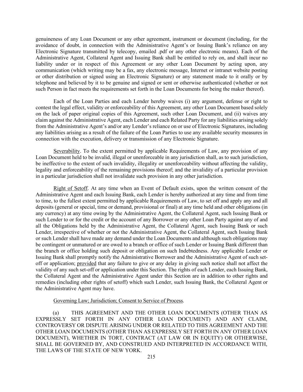 215 genuineness of any Loan Document or any other agreement, instrument or document (including, for the avoidance of doubt, in connection with the Administrative Agent’s or Issuing Bank’s reliance on any Electronic Signature transmitted by telecopy, emailed .pdf or any other electronic means). Each of the Administrative Agent, Collateral Agent and Issuing Bank shall be entitled to rely on, and shall incur no liability under or in respect of this Agreement or any other Loan Document by acting upon, any communication (which writing may be a fax, any electronic message, Internet or intranet website posting or other distribution or signed using an Electronic Signature) or any statement made to it orally or by telephone and believed by it to be genuine and signed or sent or otherwise authenticated (whether or not such Person in fact meets the requirements set forth in the Loan Documents for being the maker thereof). Each of the Loan Parties and each Lender hereby waives (i) any argument, defense or right to contest the legal effect, validity or enforceability of this Agreement, any other Loan Document based solely on the lack of paper original copies of this Agreement, such other Loan Document, and (ii) waives any claim against the Administrative Agent, each Lender and each Related Party for any liabilities arising solely from the Administrative Agent’s and/or any Lender’s reliance on or use of Electronic Signatures, including any liabilities arising as a result of the failure of the Loan Parties to use any available security measures in connection with the execution, delivery or transmission of any Electronic Signature. Severability. To the extent permitted by applicable Requirements of Law, any provision of any Loan Document held to be invalid, illegal or unenforceable in any jurisdiction shall, as to such jurisdiction, be ineffective to the extent of such invalidity, illegality or unenforceability without affecting the validity, legality and enforceability of the remaining provisions thereof; and the invalidity of a particular provision in a particular jurisdiction shall not invalidate such provision in any other jurisdiction. Right of Setoff. At any time when an Event of Default exists, upon the written consent of the Administrative Agent and each Issuing Bank, each Lender is hereby authorized at any time and from time to time, to the fullest extent permitted by applicable Requirements of Law, to set off and apply any and all deposits (general or special, time or demand, provisional or final) at any time held and other obligations (in any currency) at any time owing by the Administrative Agent, the Collateral Agent, such Issuing Bank or such Lender to or for the credit or the account of any Borrower or any other Loan Party against any of and all the Obligations held by the Administrative Agent, the Collateral Agent, such Issuing Bank or such Lender, irrespective of whether or not the Administrative Agent, the Collateral Agent, such Issuing Bank or such Lender shall have made any demand under the Loan Documents and although such obligations may be contingent or unmatured or are owed to a branch or office of such Lender or Issuing Bank different than the branch or office holding such deposit or obligation on such Indebtedness. Any applicable Lender or Issuing Bank shall promptly notify the Administrative Borrower and the Administrative Agent of such set- off or application; provided that any failure to give or any delay in giving such notice shall not affect the validity of any such set-off or application under this Section. The rights of each Lender, each Issuing Bank, the Collateral Agent and the Administrative Agent under this Section are in addition to other rights and remedies (including other rights of setoff) which such Lender, such Issuing Bank, the Collateral Agent or the Administrative Agent may have. Governing Law; Jurisdiction; Consent to Service of Process. (a) THIS AGREEMENT AND THE OTHER LOAN DOCUMENTS (OTHER THAN AS EXPRESSLY SET FORTH IN ANY OTHER LOAN DOCUMENT) AND ANY CLAIM, CONTROVERSY OR DISPUTE ARISING UNDER OR RELATED TO THIS AGREEMENT AND THE OTHER LOAN DOCUMENTS (OTHER THAN AS EXPRESSLY SET FORTH IN ANY OTHER LOAN DOCUMENT), WHETHER IN TORT, CONTRACT (AT LAW OR IN EQUITY) OR OTHERWISE, SHALL BE GOVERNED BY, AND CONSTRUED AND INTERPRETED IN ACCORDANCE WITH, THE LAWS OF THE STATE OF NEW YORK.
