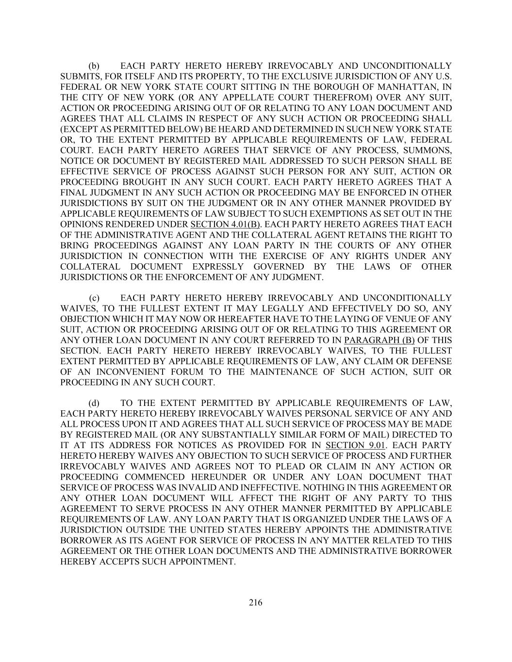 216 (b) EACH PARTY HERETO HEREBY IRREVOCABLY AND UNCONDITIONALLY SUBMITS, FOR ITSELF AND ITS PROPERTY, TO THE EXCLUSIVE JURISDICTION OF ANY U.S. FEDERAL OR NEW YORK STATE COURT SITTING IN THE BOROUGH OF MANHATTAN, IN THE CITY OF NEW YORK (OR ANY APPELLATE COURT THEREFROM) OVER ANY SUIT, ACTION OR PROCEEDING ARISING OUT OF OR RELATING TO ANY LOAN DOCUMENT AND AGREES THAT ALL CLAIMS IN RESPECT OF ANY SUCH ACTION OR PROCEEDING SHALL (EXCEPT AS PERMITTED BELOW) BE HEARD AND DETERMINED IN SUCH NEW YORK STATE OR, TO THE EXTENT PERMITTED BY APPLICABLE REQUIREMENTS OF LAW, FEDERAL COURT. EACH PARTY HERETO AGREES THAT SERVICE OF ANY PROCESS, SUMMONS, NOTICE OR DOCUMENT BY REGISTERED MAIL ADDRESSED TO SUCH PERSON SHALL BE EFFECTIVE SERVICE OF PROCESS AGAINST SUCH PERSON FOR ANY SUIT, ACTION OR PROCEEDING BROUGHT IN ANY SUCH COURT. EACH PARTY HERETO AGREES THAT A FINAL JUDGMENT IN ANY SUCH ACTION OR PROCEEDING MAY BE ENFORCED IN OTHER JURISDICTIONS BY SUIT ON THE JUDGMENT OR IN ANY OTHER MANNER PROVIDED BY APPLICABLE REQUIREMENTS OF LAW SUBJECT TO SUCH EXEMPTIONS AS SET OUT IN THE OPINIONS RENDERED UNDER SECTION 4.01(B). EACH PARTY HERETO AGREES THAT EACH OF THE ADMINISTRATIVE AGENT AND THE COLLATERAL AGENT RETAINS THE RIGHT TO BRING PROCEEDINGS AGAINST ANY LOAN PARTY IN THE COURTS OF ANY OTHER JURISDICTION IN CONNECTION WITH THE EXERCISE OF ANY RIGHTS UNDER ANY COLLATERAL DOCUMENT EXPRESSLY GOVERNED BY THE LAWS OF OTHER JURISDICTIONS OR THE ENFORCEMENT OF ANY JUDGMENT. (c) EACH PARTY HERETO HEREBY IRREVOCABLY AND UNCONDITIONALLY WAIVES, TO THE FULLEST EXTENT IT MAY LEGALLY AND EFFECTIVELY DO SO, ANY OBJECTION WHICH IT MAY NOW OR HEREAFTER HAVE TO THE LAYING OF VENUE OF ANY SUIT, ACTION OR PROCEEDING ARISING OUT OF OR RELATING TO THIS AGREEMENT OR ANY OTHER LOAN DOCUMENT IN ANY COURT REFERRED TO IN PARAGRAPH (B) OF THIS SECTION. EACH PARTY HERETO HEREBY IRREVOCABLY WAIVES, TO THE FULLEST EXTENT PERMITTED BY APPLICABLE REQUIREMENTS OF LAW, ANY CLAIM OR DEFENSE OF AN INCONVENIENT FORUM TO THE MAINTENANCE OF SUCH ACTION, SUIT OR PROCEEDING IN ANY SUCH COURT. (d) TO THE EXTENT PERMITTED BY APPLICABLE REQUIREMENTS OF LAW, EACH PARTY HERETO HEREBY IRREVOCABLY WAIVES PERSONAL SERVICE OF ANY AND ALL PROCESS UPON IT AND AGREES THAT ALL SUCH SERVICE OF PROCESS MAY BE MADE BY REGISTERED MAIL (OR ANY SUBSTANTIALLY SIMILAR FORM OF MAIL) DIRECTED TO IT AT ITS ADDRESS FOR NOTICES AS PROVIDED FOR IN SECTION 9.01. EACH PARTY HERETO HEREBY WAIVES ANY OBJECTION TO SUCH SERVICE OF PROCESS AND FURTHER IRREVOCABLY WAIVES AND AGREES NOT TO PLEAD OR CLAIM IN ANY ACTION OR PROCEEDING COMMENCED HEREUNDER OR UNDER ANY LOAN DOCUMENT THAT SERVICE OF PROCESS WAS INVALID AND INEFFECTIVE. NOTHING IN THIS AGREEMENT OR ANY OTHER LOAN DOCUMENT WILL AFFECT THE RIGHT OF ANY PARTY TO THIS AGREEMENT TO SERVE PROCESS IN ANY OTHER MANNER PERMITTED BY APPLICABLE REQUIREMENTS OF LAW. ANY LOAN PARTY THAT IS ORGANIZED UNDER THE LAWS OF A JURISDICTION OUTSIDE THE UNITED STATES HEREBY APPOINTS THE ADMINISTRATIVE BORROWER AS ITS AGENT FOR SERVICE OF PROCESS IN ANY MATTER RELATED TO THIS AGREEMENT OR THE OTHER LOAN DOCUMENTS AND THE ADMINISTRATIVE BORROWER HEREBY ACCEPTS SUCH APPOINTMENT.