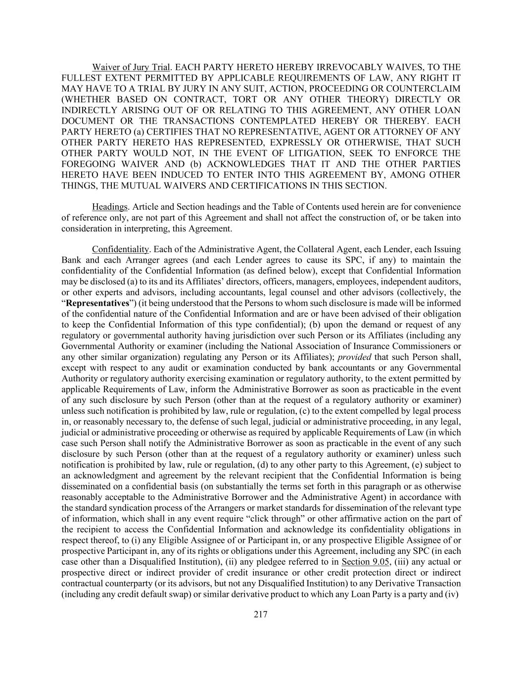 217 Waiver of Jury Trial. EACH PARTY HERETO HEREBY IRREVOCABLY WAIVES, TO THE FULLEST EXTENT PERMITTED BY APPLICABLE REQUIREMENTS OF LAW, ANY RIGHT IT MAY HAVE TO A TRIAL BY JURY IN ANY SUIT, ACTION, PROCEEDING OR COUNTERCLAIM (WHETHER BASED ON CONTRACT, TORT OR ANY OTHER THEORY) DIRECTLY OR INDIRECTLY ARISING OUT OF OR RELATING TO THIS AGREEMENT, ANY OTHER LOAN DOCUMENT OR THE TRANSACTIONS CONTEMPLATED HEREBY OR THEREBY. EACH PARTY HERETO (a) CERTIFIES THAT NO REPRESENTATIVE, AGENT OR ATTORNEY OF ANY OTHER PARTY HERETO HAS REPRESENTED, EXPRESSLY OR OTHERWISE, THAT SUCH OTHER PARTY WOULD NOT, IN THE EVENT OF LITIGATION, SEEK TO ENFORCE THE FOREGOING WAIVER AND (b) ACKNOWLEDGES THAT IT AND THE OTHER PARTIES HERETO HAVE BEEN INDUCED TO ENTER INTO THIS AGREEMENT BY, AMONG OTHER THINGS, THE MUTUAL WAIVERS AND CERTIFICATIONS IN THIS SECTION. Headings. Article and Section headings and the Table of Contents used herein are for convenience of reference only, are not part of this Agreement and shall not affect the construction of, or be taken into consideration in interpreting, this Agreement. Confidentiality. Each of the Administrative Agent, the Collateral Agent, each Lender, each Issuing Bank and each Arranger agrees (and each Lender agrees to cause its SPC, if any) to maintain the confidentiality of the Confidential Information (as defined below), except that Confidential Information may be disclosed (a) to its and its Affiliates’ directors, officers, managers, employees, independent auditors, or other experts and advisors, including accountants, legal counsel and other advisors (collectively, the “Representatives”) (it being understood that the Persons to whom such disclosure is made will be informed of the confidential nature of the Confidential Information and are or have been advised of their obligation to keep the Confidential Information of this type confidential); (b) upon the demand or request of any regulatory or governmental authority having jurisdiction over such Person or its Affiliates (including any Governmental Authority or examiner (including the National Association of Insurance Commissioners or any other similar organization) regulating any Person or its Affiliates); provided that such Person shall, except with respect to any audit or examination conducted by bank accountants or any Governmental Authority or regulatory authority exercising examination or regulatory authority, to the extent permitted by applicable Requirements of Law, inform the Administrative Borrower as soon as practicable in the event of any such disclosure by such Person (other than at the request of a regulatory authority or examiner) unless such notification is prohibited by law, rule or regulation, (c) to the extent compelled by legal process in, or reasonably necessary to, the defense of such legal, judicial or administrative proceeding, in any legal, judicial or administrative proceeding or otherwise as required by applicable Requirements of Law (in which case such Person shall notify the Administrative Borrower as soon as practicable in the event of any such disclosure by such Person (other than at the request of a regulatory authority or examiner) unless such notification is prohibited by law, rule or regulation, (d) to any other party to this Agreement, (e) subject to an acknowledgment and agreement by the relevant recipient that the Confidential Information is being disseminated on a confidential basis (on substantially the terms set forth in this paragraph or as otherwise reasonably acceptable to the Administrative Borrower and the Administrative Agent) in accordance with the standard syndication process of the Arrangers or market standards for dissemination of the relevant type of information, which shall in any event require “click through” or other affirmative action on the part of the recipient to access the Confidential Information and acknowledge its confidentiality obligations in respect thereof, to (i) any Eligible Assignee of or Participant in, or any prospective Eligible Assignee of or prospective Participant in, any of its rights or obligations under this Agreement, including any SPC (in each case other than a Disqualified Institution), (ii) any pledgee referred to in Section 9.05, (iii) any actual or prospective direct or indirect provider of credit insurance or other credit protection direct or indirect contractual counterparty (or its advisors, but not any Disqualified Institution) to any Derivative Transaction (including any credit default swap) or similar derivative product to which any Loan Party is a party and (iv)