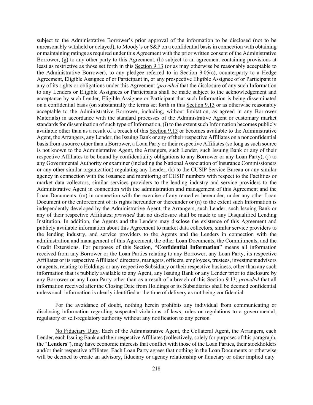 218 subject to the Administrative Borrower’s prior approval of the information to be disclosed (not to be unreasonably withheld or delayed), to Moody’s or S&P on a confidential basis in connection with obtaining or maintaining ratings as required under this Agreement with the prior written consent of the Administrative Borrower, (g) to any other party to this Agreement, (h) subject to an agreement containing provisions at least as restrictive as those set forth in this Section 9.13 (or as may otherwise be reasonably acceptable to the Administrative Borrower), to any pledgee referred to in Section 9.05(c), counterparty to a Hedge Agreement, Eligible Assignee of or Participant in, or any prospective Eligible Assignee of or Participant in any of its rights or obligations under this Agreement (provided that the disclosure of any such Information to any Lenders or Eligible Assignees or Participants shall be made subject to the acknowledgement and acceptance by such Lender, Eligible Assignee or Participant that such Information is being disseminated on a confidential basis (on substantially the terms set forth in this Section 9.13 or as otherwise reasonably acceptable to the Administrative Borrower, including, without limitation, as agreed in any Borrower Materials) in accordance with the standard processes of the Administrative Agent or customary market standards for dissemination of such type of Information, (i) to the extent such Information becomes publicly available other than as a result of a breach of this Section 9.13 or becomes available to the Administrative Agent, the Arrangers, any Lender, the Issuing Bank or any of their respective Affiliates on a nonconfidential basis from a source other than a Borrower, a Loan Party or their respective Affiliates (so long as such source is not known to the Administrative Agent, the Arrangers, such Lender, such Issuing Bank or any of their respective Affiliates to be bound by confidentiality obligations to any Borrower or any Loan Party), (j) to any Governmental Authority or examiner (including the National Association of Insurance Commissioners or any other similar organization) regulating any Lender, (k) to the CUSIP Service Bureau or any similar agency in connection with the issuance and monitoring of CUSIP numbers with respect to the Facilities or market data collectors, similar services providers to the lending industry and service providers to the Administrative Agent in connection with the administration and management of this Agreement and the Loan Documents, (m) in connection with the exercise of any remedies hereunder, under any other Loan Document or the enforcement of its rights hereunder or thereunder or (n) to the extent such Information is independently developed by the Administrative Agent, the Arrangers, such Lender, such Issuing Bank or any of their respective Affiliates; provided that no disclosure shall be made to any Disqualified Lending Institution. In addition, the Agents and the Lenders may disclose the existence of this Agreement and publicly available information about this Agreement to market data collectors, similar service providers to the lending industry, and service providers to the Agents and the Lenders in connection with the administration and management of this Agreement, the other Loan Documents, the Commitments, and the Credit Extensions. For purposes of this Section, “Confidential Information” means all information received from any Borrower or the Loan Parties relating to any Borrower, any Loan Party, its respective Affiliates or its respective Affiliates’ directors, managers, officers, employees, trustees, investment advisors or agents, relating to Holdings or any respective Subsidiary or their respective business, other than any such information that is publicly available to any Agent, any Issuing Bank or any Lender prior to disclosure by any Borrower or any Loan Party other than as a result of a breach of this Section 9.13; provided that all information received after the Closing Date from Holdings or its Subsidiaries shall be deemed confidential unless such information is clearly identified at the time of delivery as not being confidential. For the avoidance of doubt, nothing herein prohibits any individual from communicating or disclosing information regarding suspected violations of laws, rules or regulations to a governmental, regulatory or self-regulatory authority without any notification to any person No Fiduciary Duty. Each of the Administrative Agent, the Collateral Agent, the Arrangers, each Lender, each Issuing Bank and their respective Affiliates (collectively, solely for purposes of this paragraph, the “Lenders”), may have economic interests that conflict with those of the Loan Parties, their stockholders and/or their respective affiliates. Each Loan Party agrees that nothing in the Loan Documents or otherwise will be deemed to create an advisory, fiduciary or agency relationship or fiduciary or other implied duty