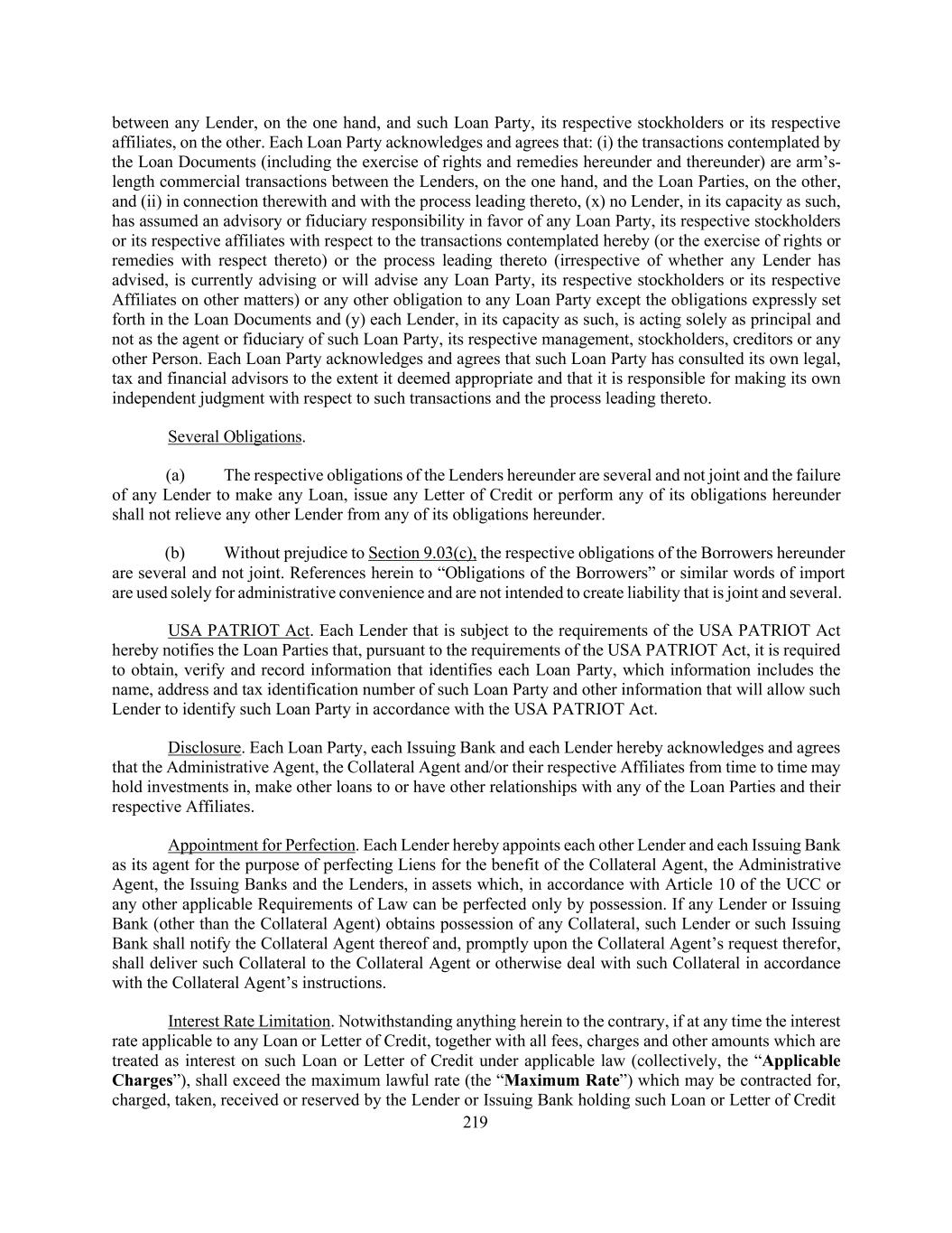 219 between any Lender, on the one hand, and such Loan Party, its respective stockholders or its respective affiliates, on the other. Each Loan Party acknowledges and agrees that: (i) the transactions contemplated by the Loan Documents (including the exercise of rights and remedies hereunder and thereunder) are arm’s- length commercial transactions between the Lenders, on the one hand, and the Loan Parties, on the other, and (ii) in connection therewith and with the process leading thereto, (x) no Lender, in its capacity as such, has assumed an advisory or fiduciary responsibility in favor of any Loan Party, its respective stockholders or its respective affiliates with respect to the transactions contemplated hereby (or the exercise of rights or remedies with respect thereto) or the process leading thereto (irrespective of whether any Lender has advised, is currently advising or will advise any Loan Party, its respective stockholders or its respective Affiliates on other matters) or any other obligation to any Loan Party except the obligations expressly set forth in the Loan Documents and (y) each Lender, in its capacity as such, is acting solely as principal and not as the agent or fiduciary of such Loan Party, its respective management, stockholders, creditors or any other Person. Each Loan Party acknowledges and agrees that such Loan Party has consulted its own legal, tax and financial advisors to the extent it deemed appropriate and that it is responsible for making its own independent judgment with respect to such transactions and the process leading thereto. Several Obligations. (a) The respective obligations of the Lenders hereunder are several and not joint and the failure of any Lender to make any Loan, issue any Letter of Credit or perform any of its obligations hereunder shall not relieve any other Lender from any of its obligations hereunder. (b) Without prejudice to Section 9.03(c), the respective obligations of the Borrowers hereunder are several and not joint. References herein to “Obligations of the Borrowers” or similar words of import are used solely for administrative convenience and are not intended to create liability that is joint and several. USA PATRIOT Act. Each Lender that is subject to the requirements of the USA PATRIOT Act hereby notifies the Loan Parties that, pursuant to the requirements of the USA PATRIOT Act, it is required to obtain, verify and record information that identifies each Loan Party, which information includes the name, address and tax identification number of such Loan Party and other information that will allow such Lender to identify such Loan Party in accordance with the USA PATRIOT Act. Disclosure. Each Loan Party, each Issuing Bank and each Lender hereby acknowledges and agrees that the Administrative Agent, the Collateral Agent and/or their respective Affiliates from time to time may hold investments in, make other loans to or have other relationships with any of the Loan Parties and their respective Affiliates. Appointment for Perfection. Each Lender hereby appoints each other Lender and each Issuing Bank as its agent for the purpose of perfecting Liens for the benefit of the Collateral Agent, the Administrative Agent, the Issuing Banks and the Lenders, in assets which, in accordance with Article 10 of the UCC or any other applicable Requirements of Law can be perfected only by possession. If any Lender or Issuing Bank (other than the Collateral Agent) obtains possession of any Collateral, such Lender or such Issuing Bank shall notify the Collateral Agent thereof and, promptly upon the Collateral Agent’s request therefor, shall deliver such Collateral to the Collateral Agent or otherwise deal with such Collateral in accordance with the Collateral Agent’s instructions. Interest Rate Limitation. Notwithstanding anything herein to the contrary, if at any time the interest rate applicable to any Loan or Letter of Credit, together with all fees, charges and other amounts which are treated as interest on such Loan or Letter of Credit under applicable law (collectively, the “Applicable Charges”), shall exceed the maximum lawful rate (the “Maximum Rate”) which may be contracted for, charged, taken, received or reserved by the Lender or Issuing Bank holding such Loan or Letter of Credit